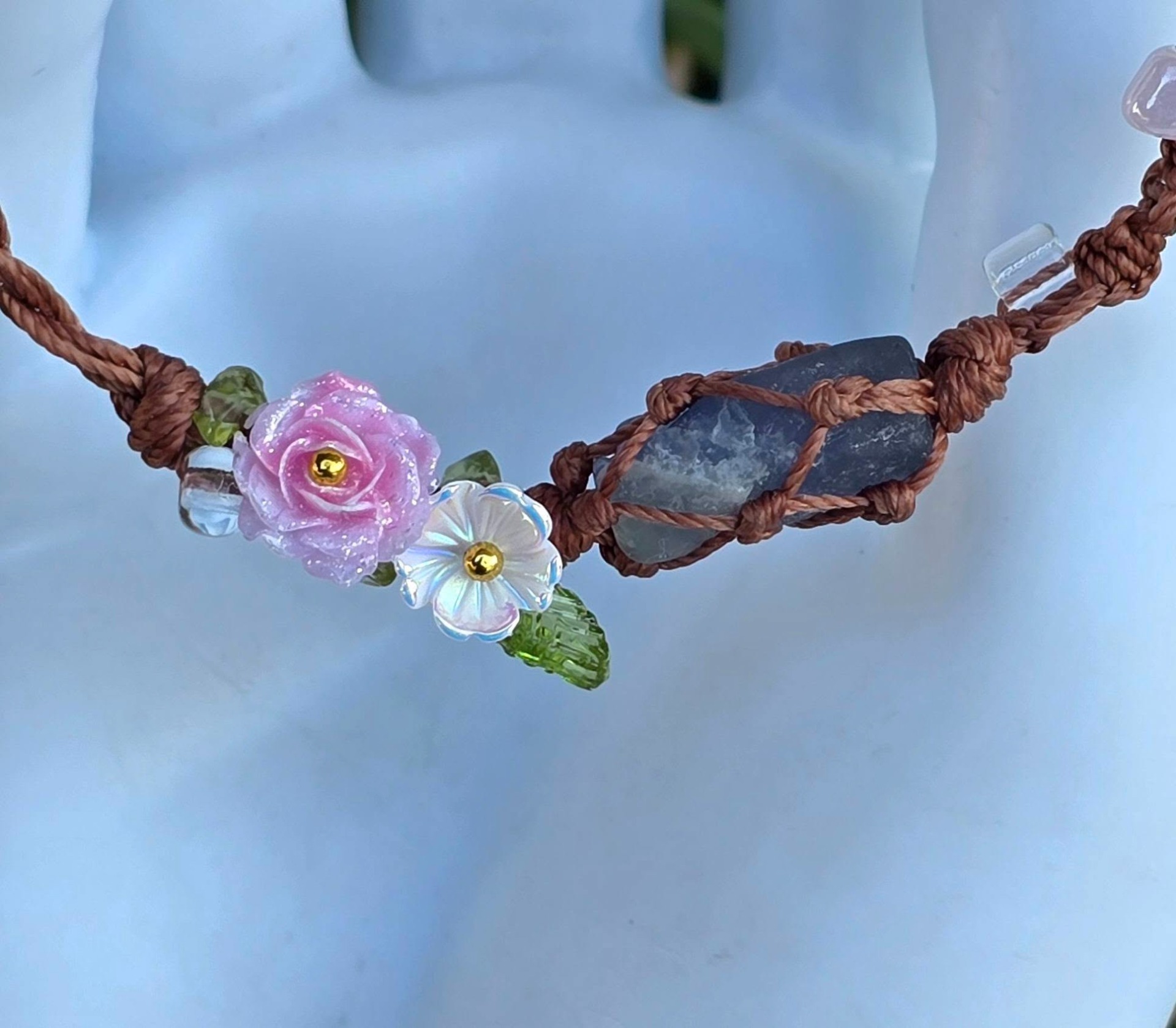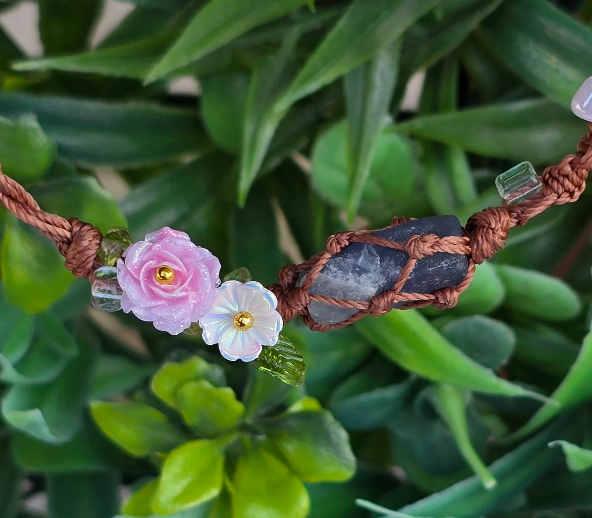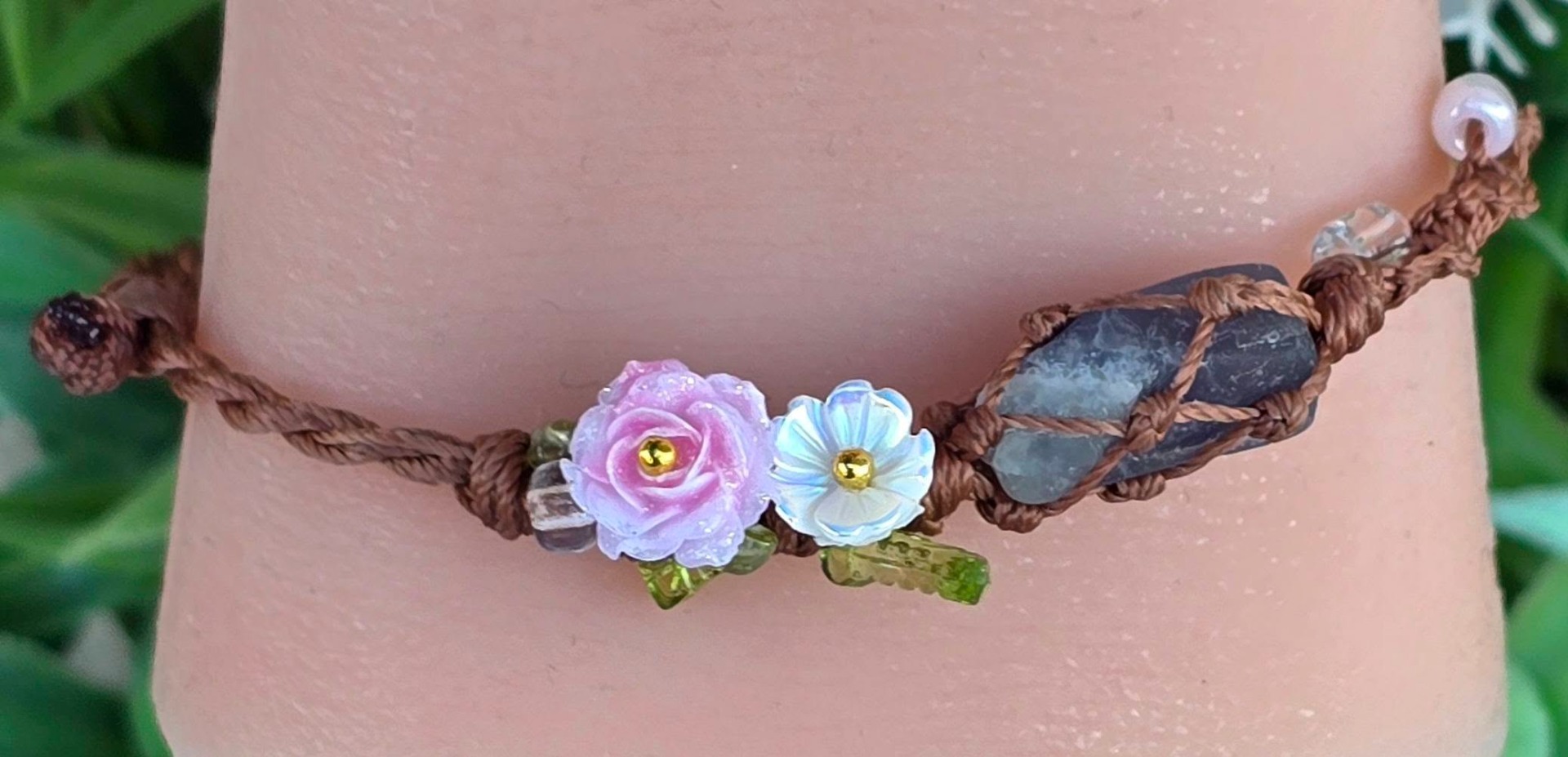 Brățară "handmade" contemporană "Boho-Chic", cu aquamarin brut, peridot și sidef dispuse pe șnur realizat prin tehnica "macramé", cu închizătoare din argint.