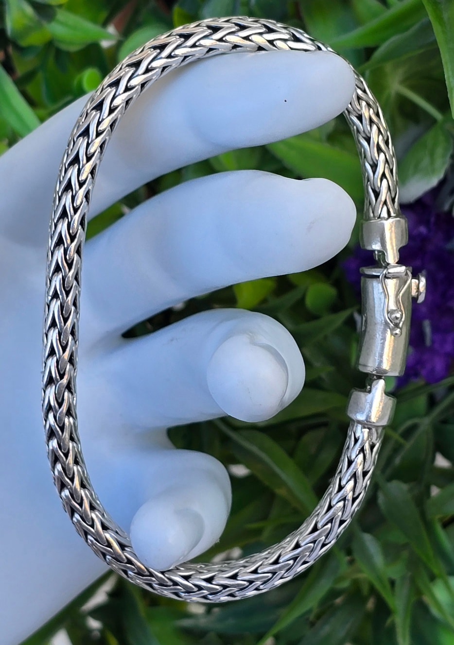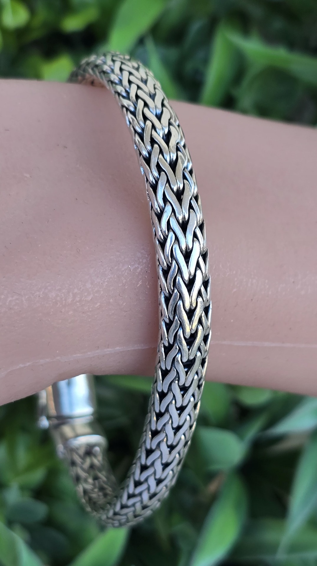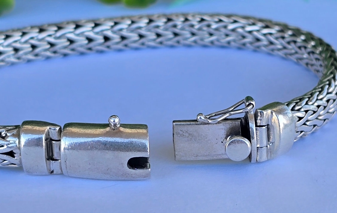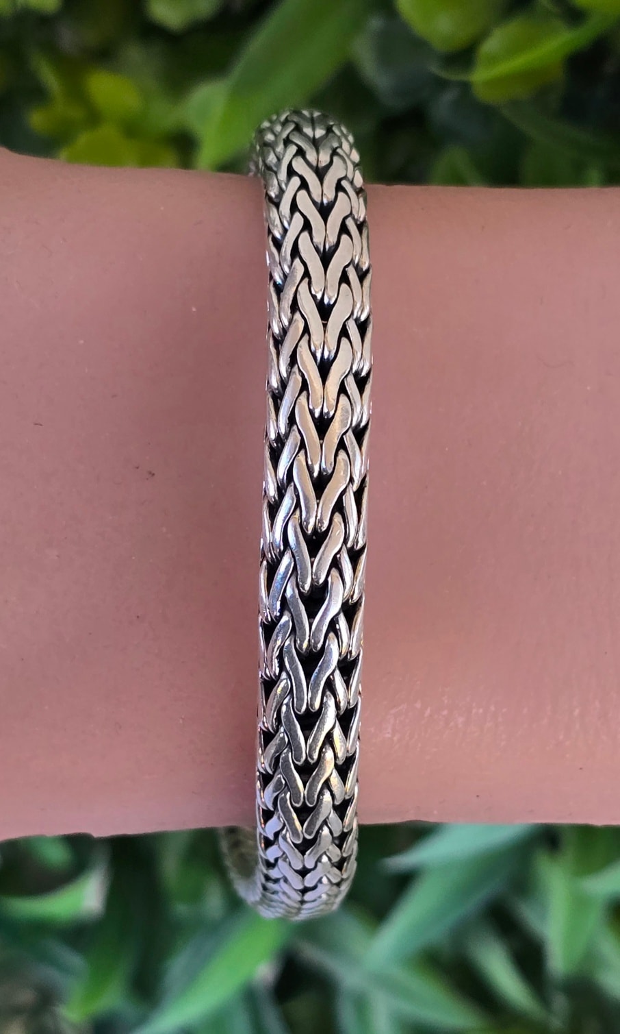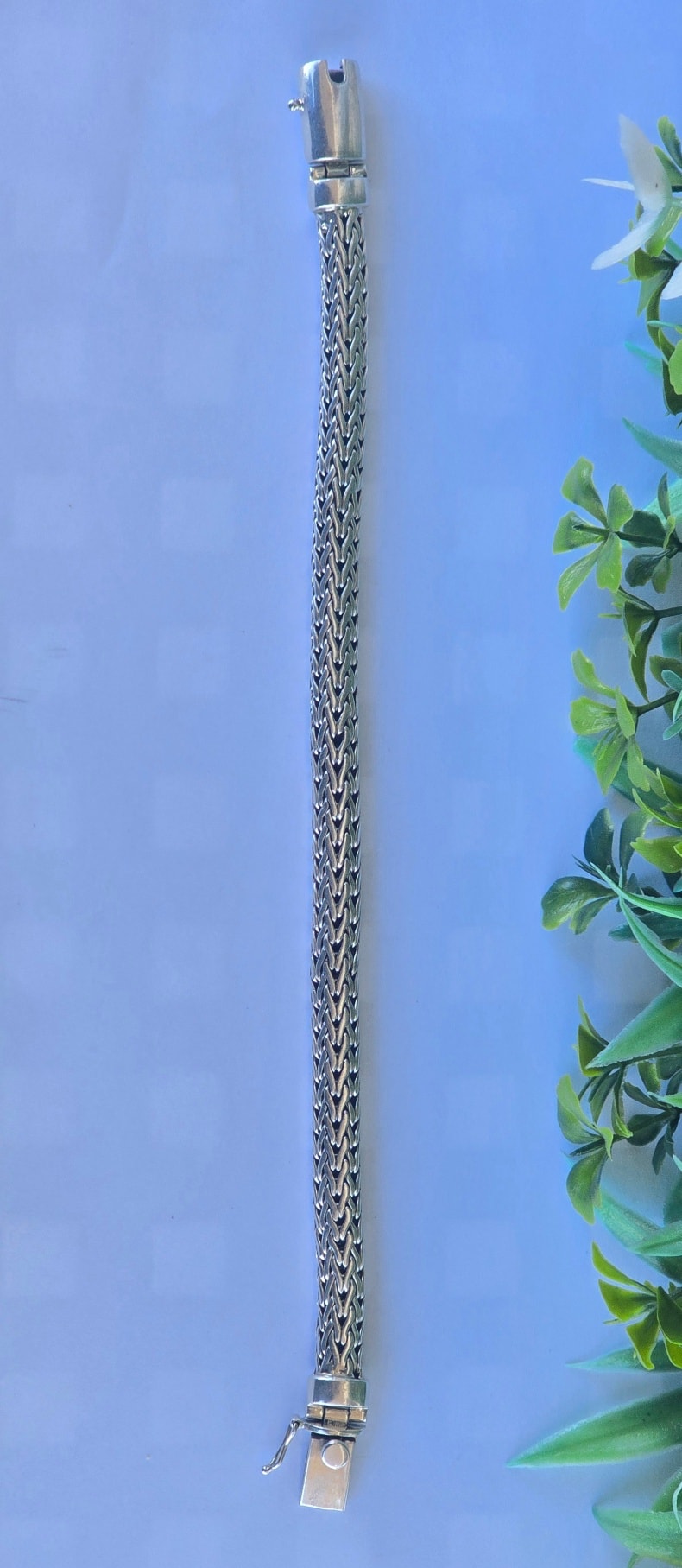 Brățară masivă spectaculoasă, din argint, manufactură cu împletitură complexă "fox tail" (coadă de vulpe), realizată din zale interconectate care creează un aspect tubular, aproape sculptural.