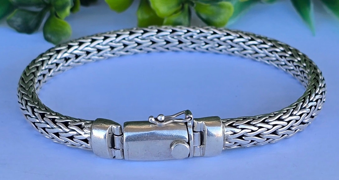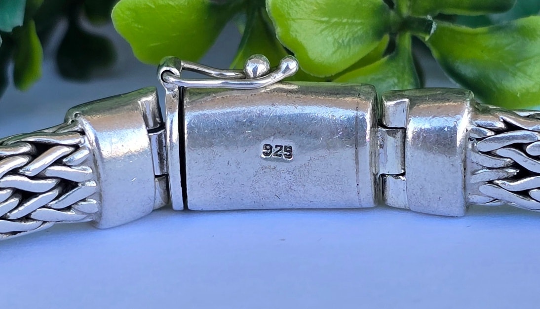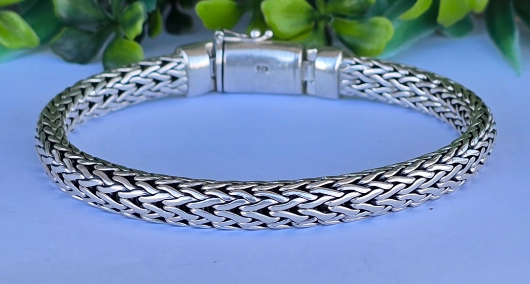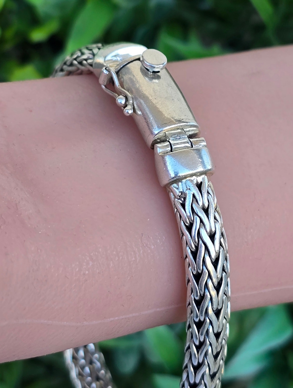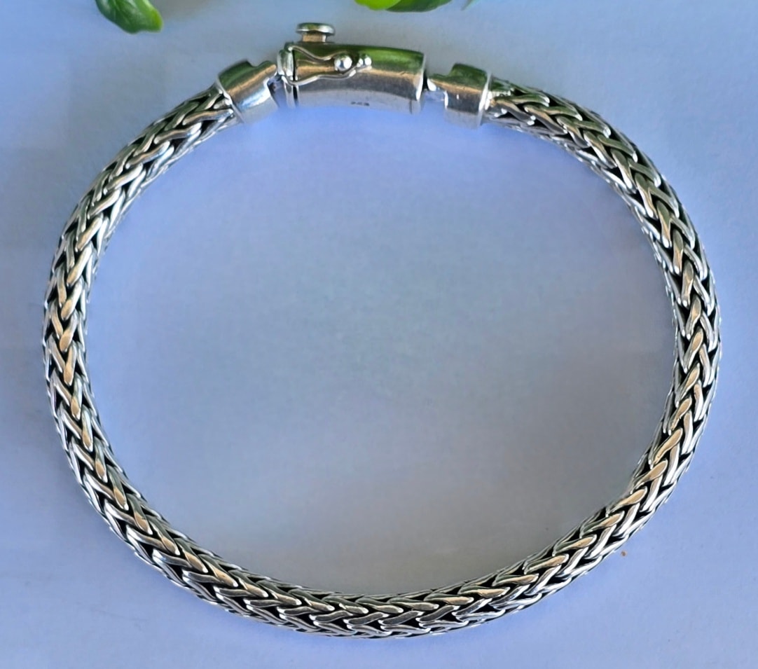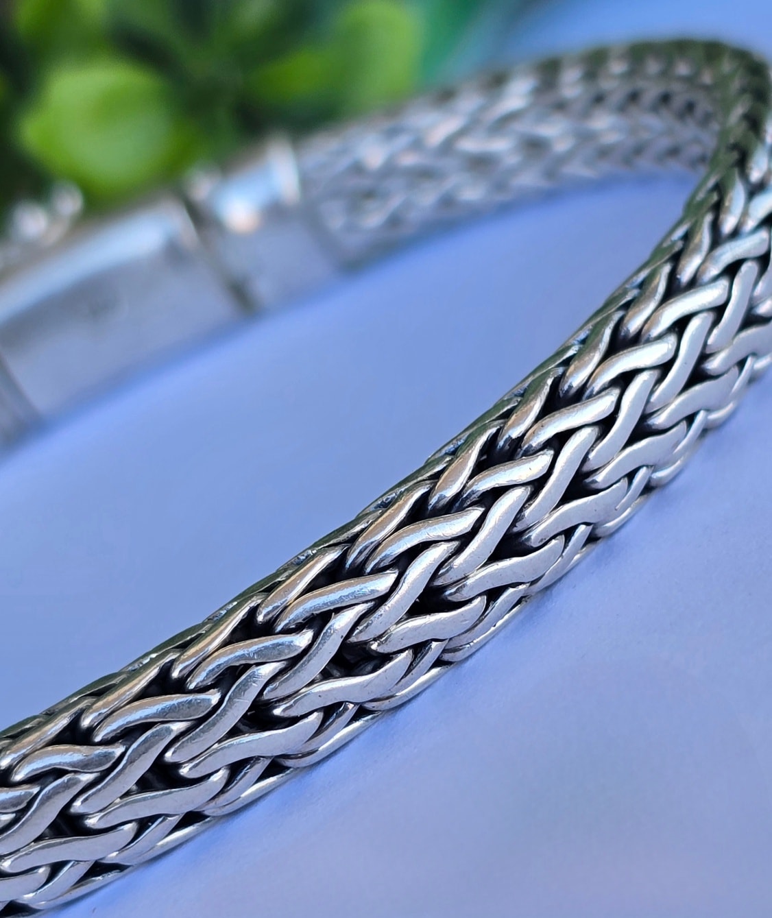 Brățară masivă spectaculoasă, din argint, manufactură cu împletitură complexă "fox tail" (coadă de vulpe), realizată din zale interconectate care creează un aspect tubular, aproape sculptural.