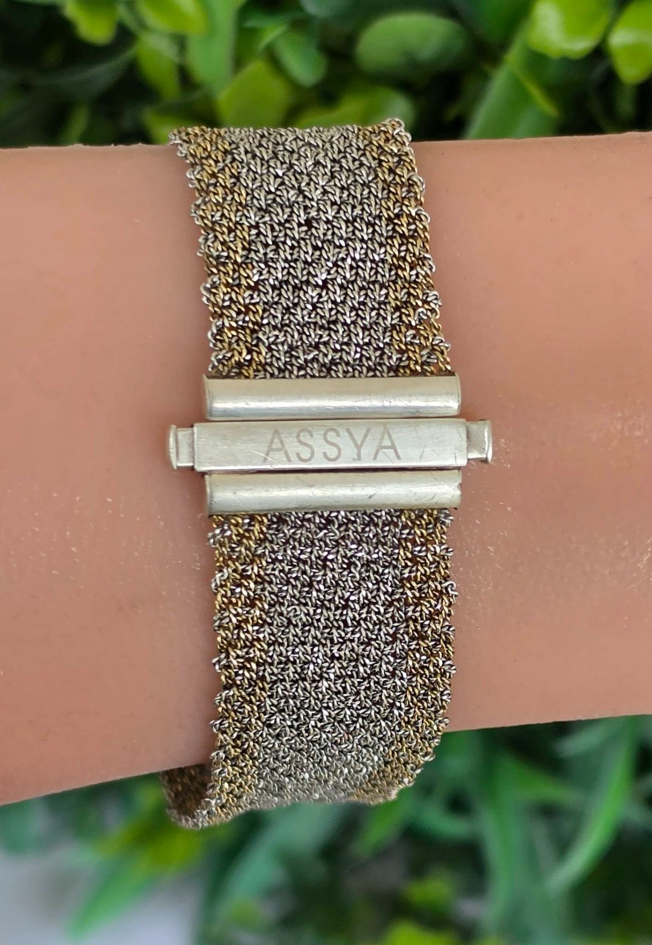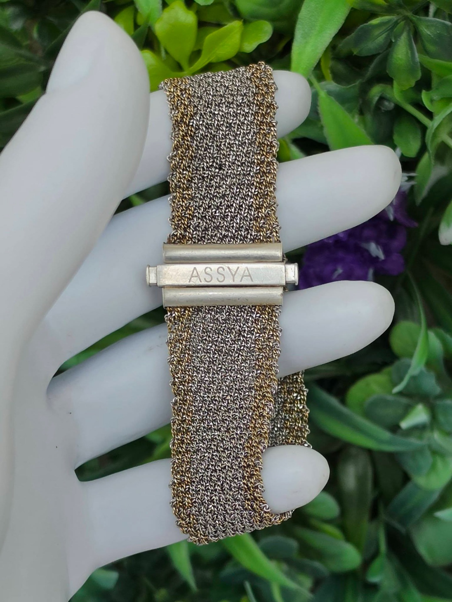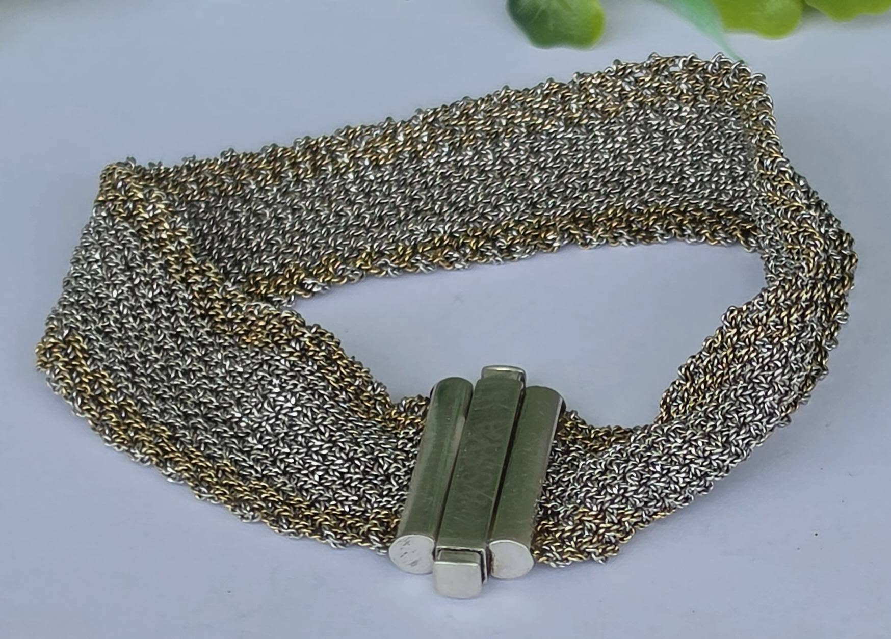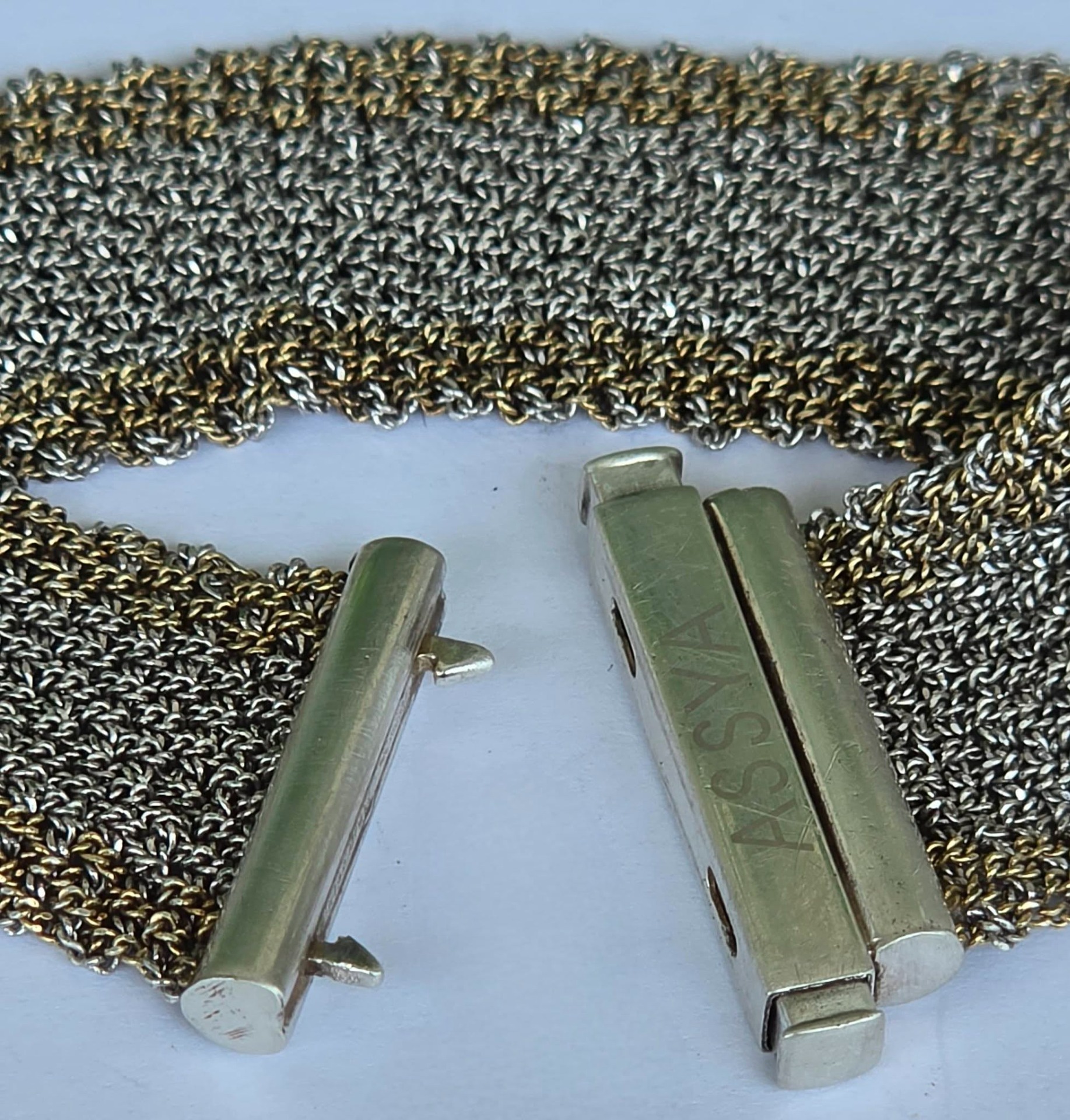 Brățară modernistă, țesătură din argint cu marginile "vermeil" (argint aurit), design inspirat din veșmintele aztece și incașe, manufactură ASSYA LONDON.