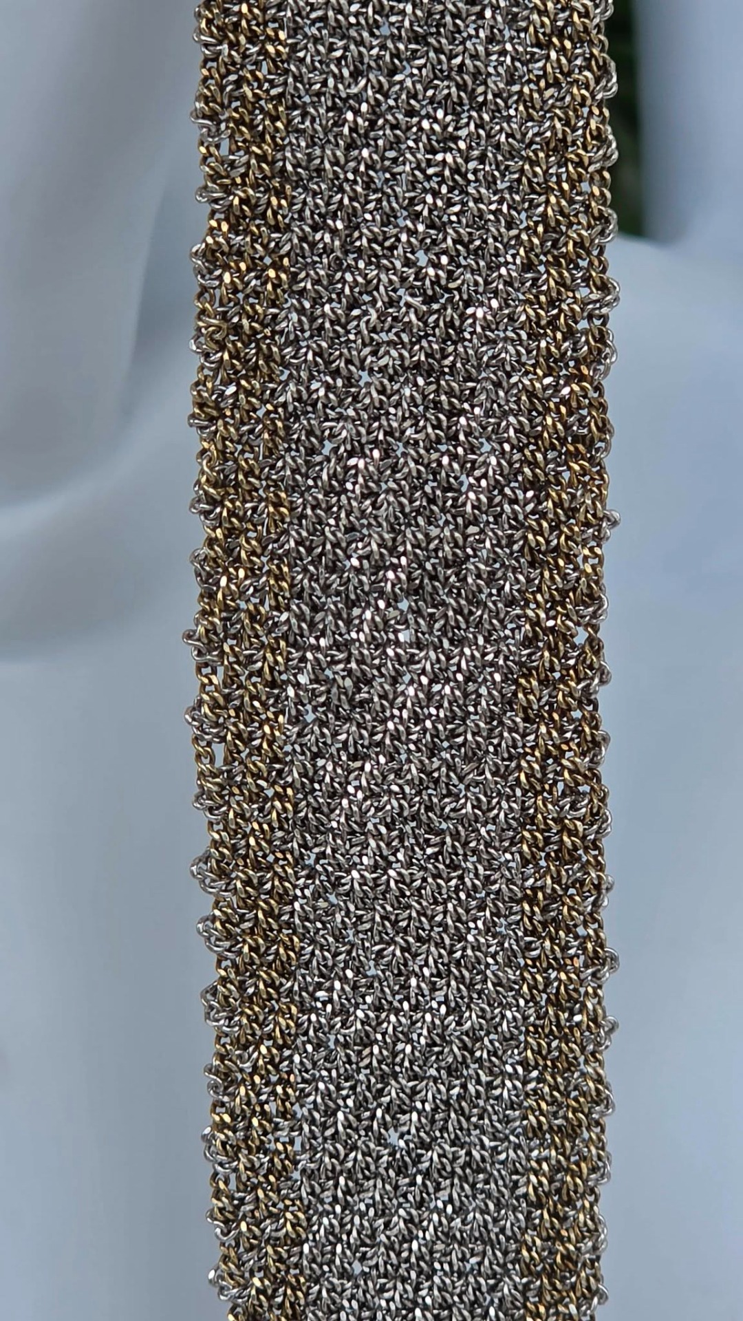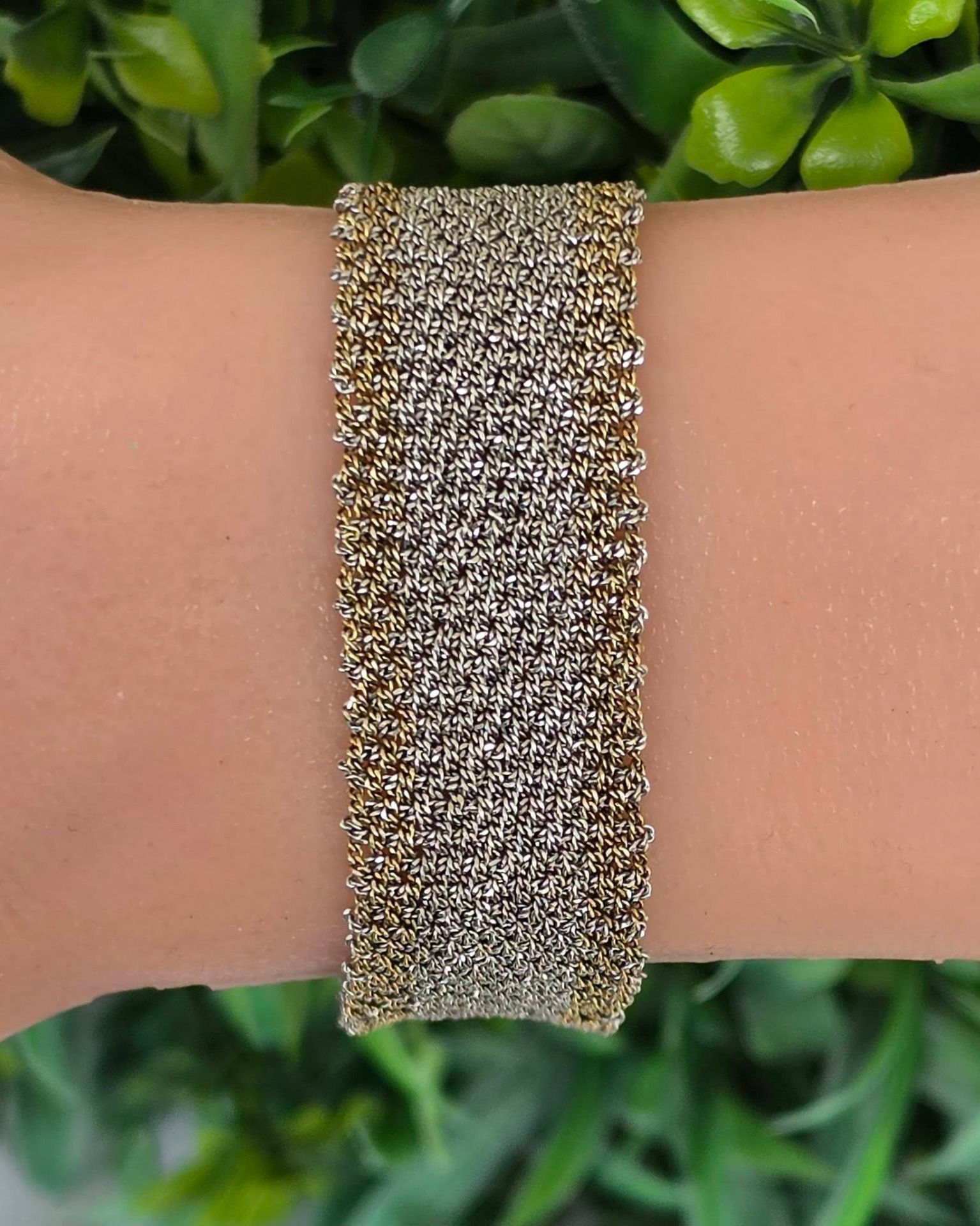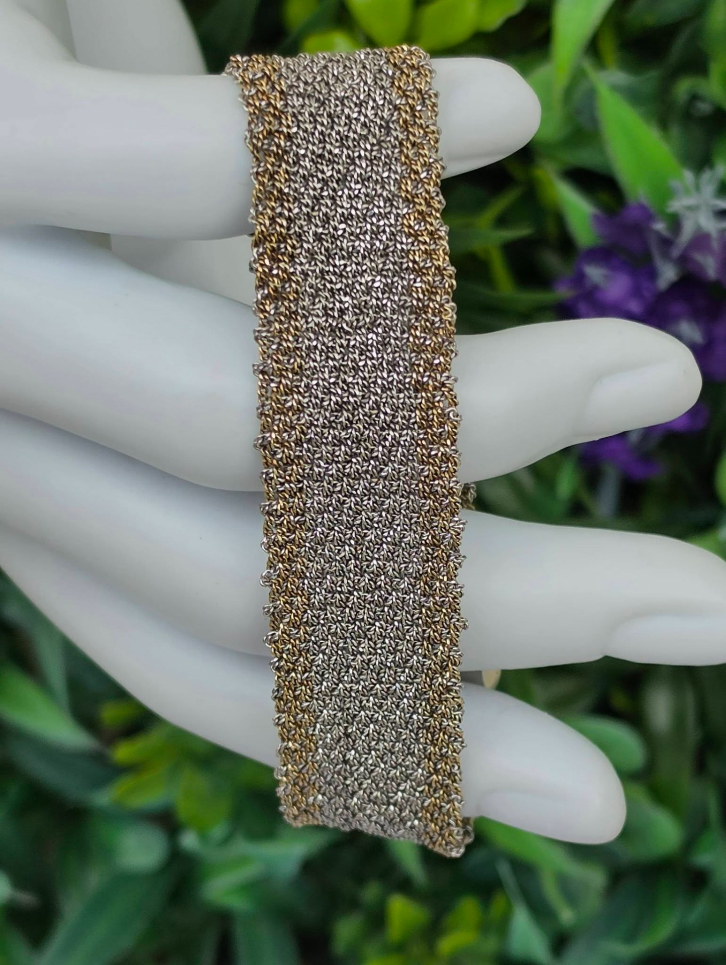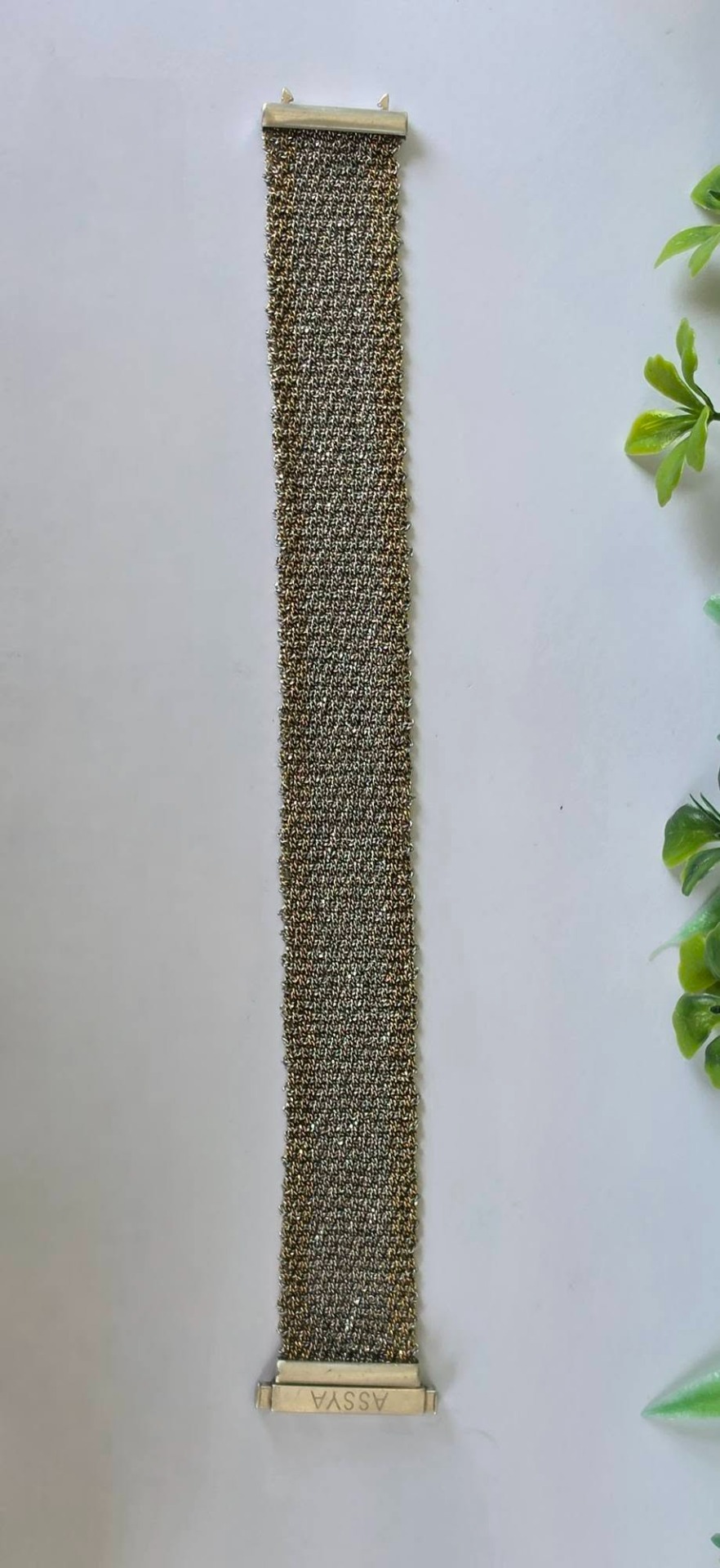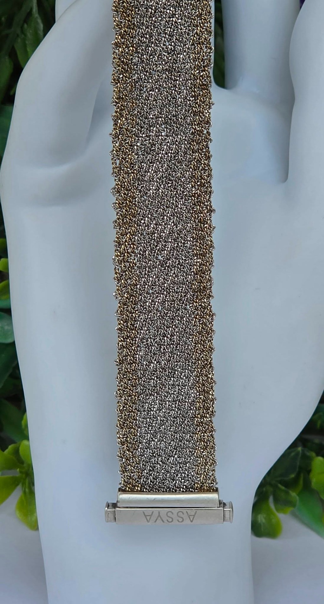 Brățară modernistă, țesătură din argint cu marginile "vermeil" (argint aurit), design inspirat din veșmintele aztece și incașe, manufactură ASSYA LONDON.