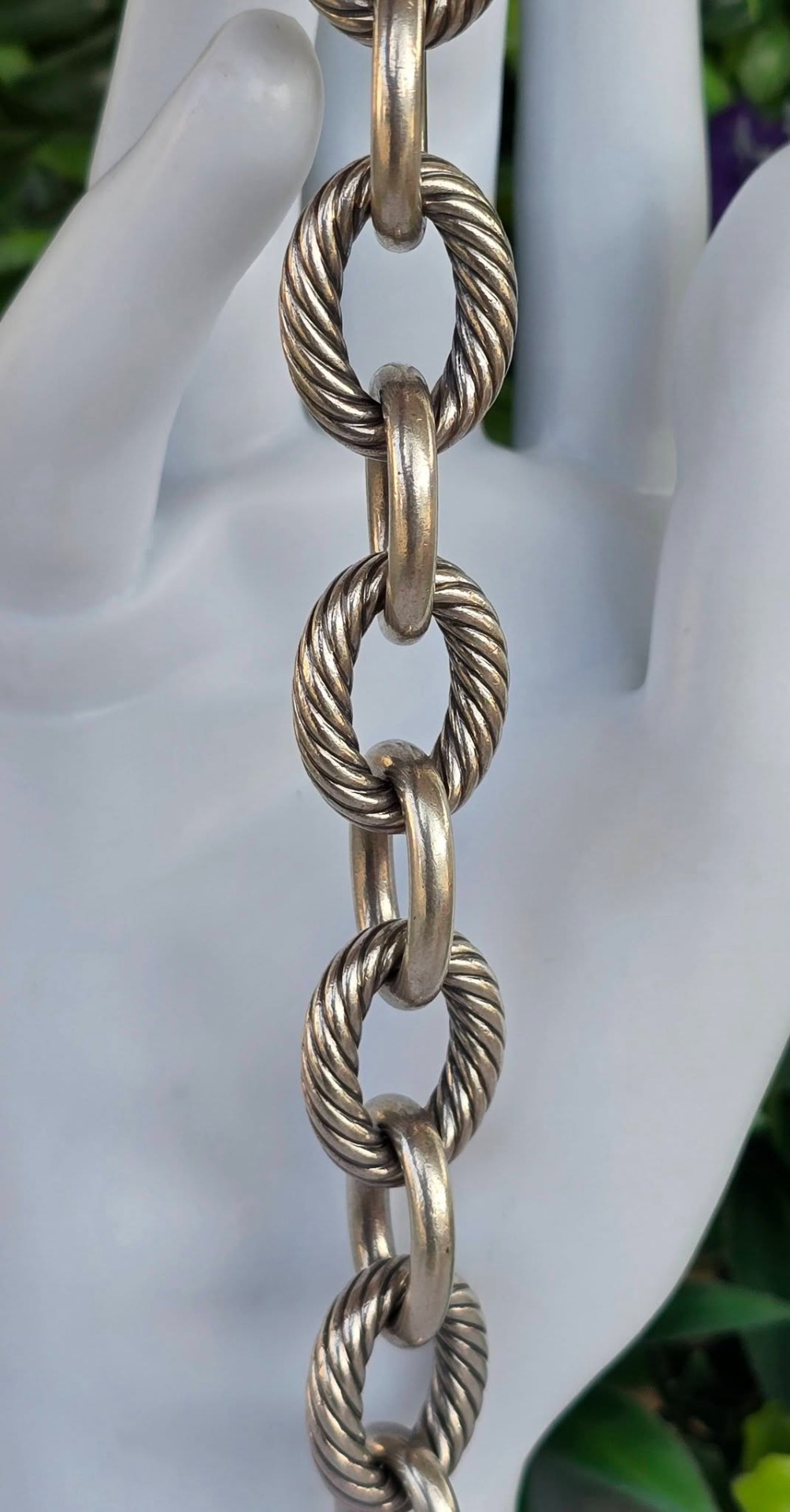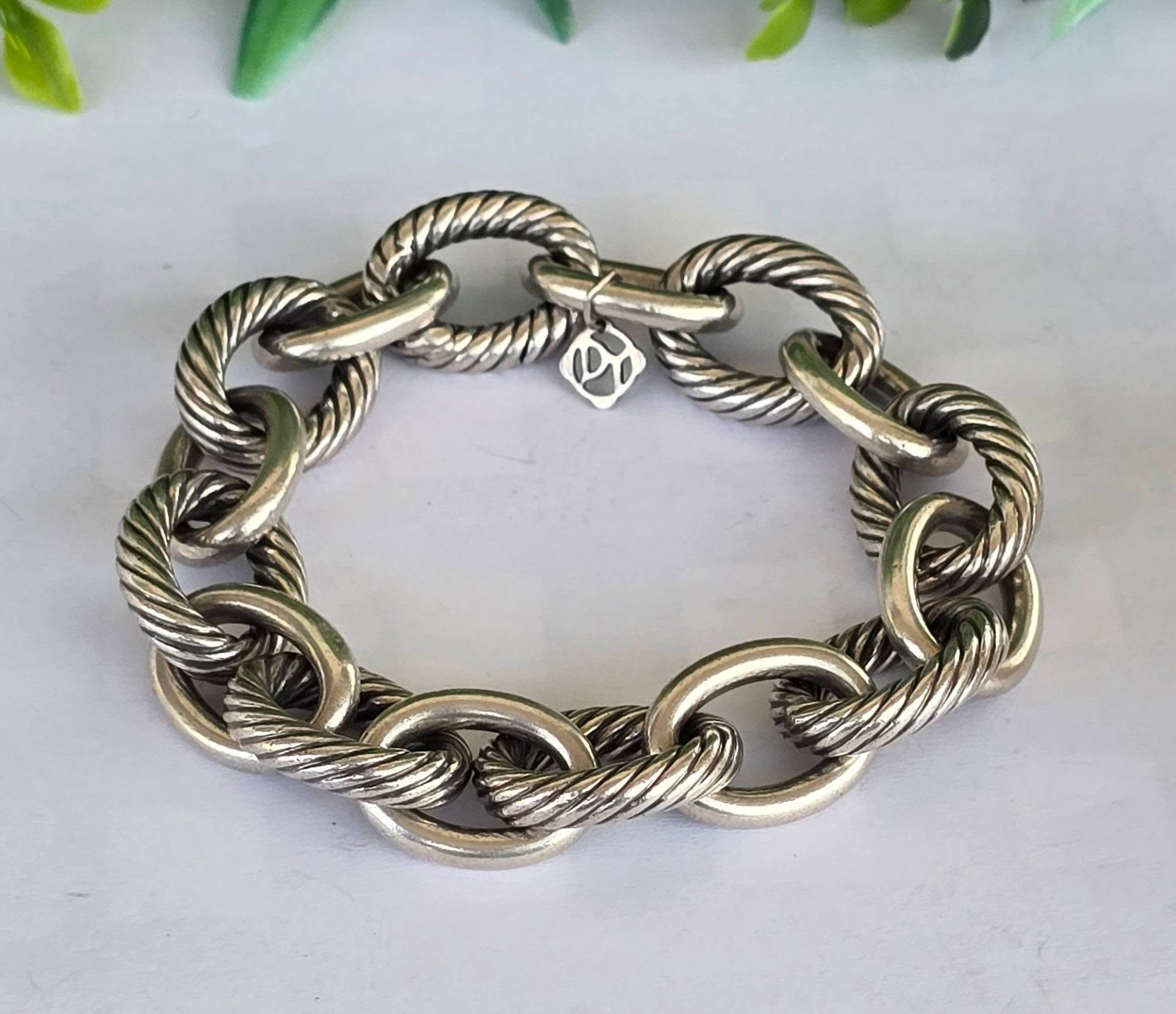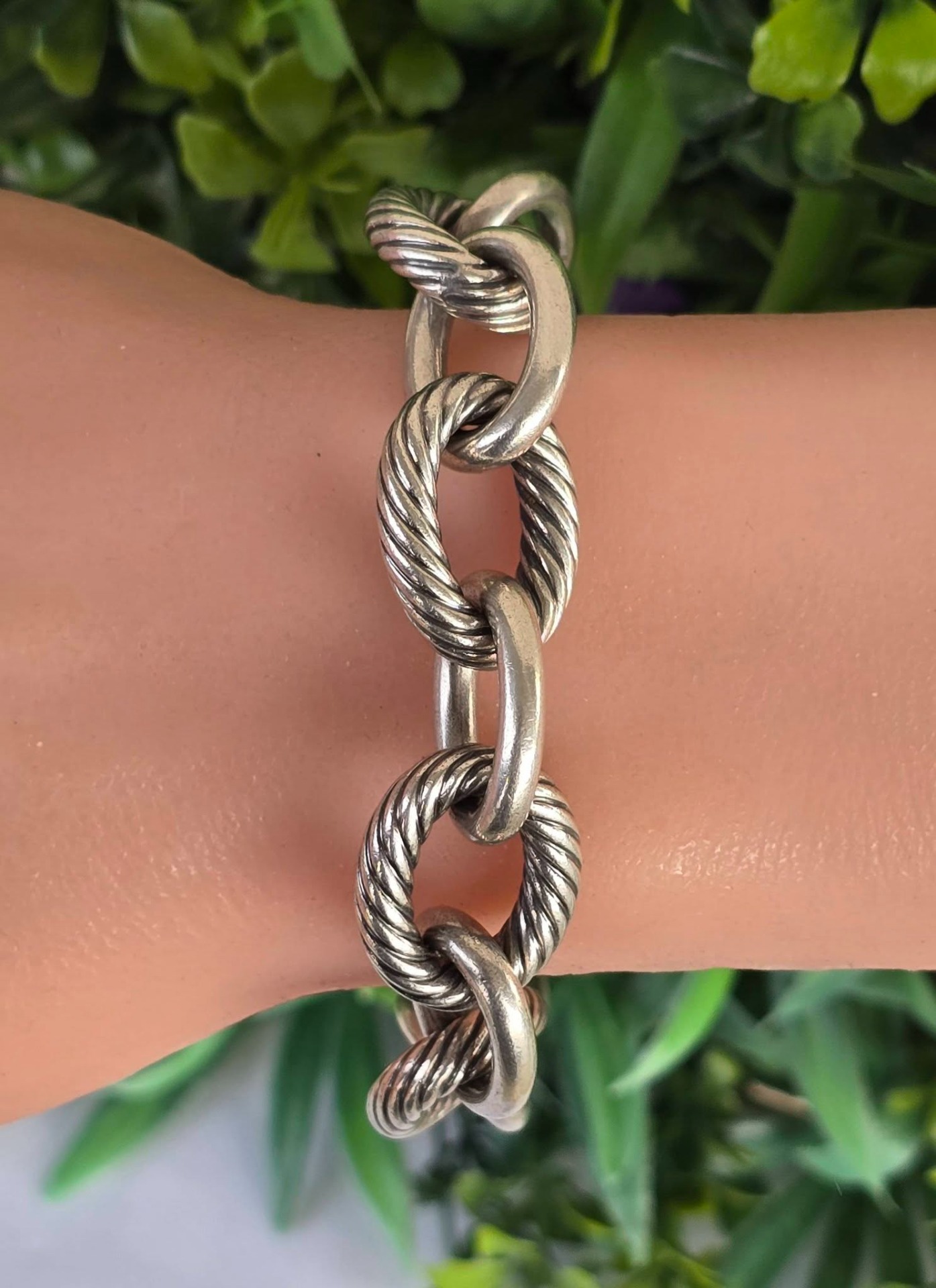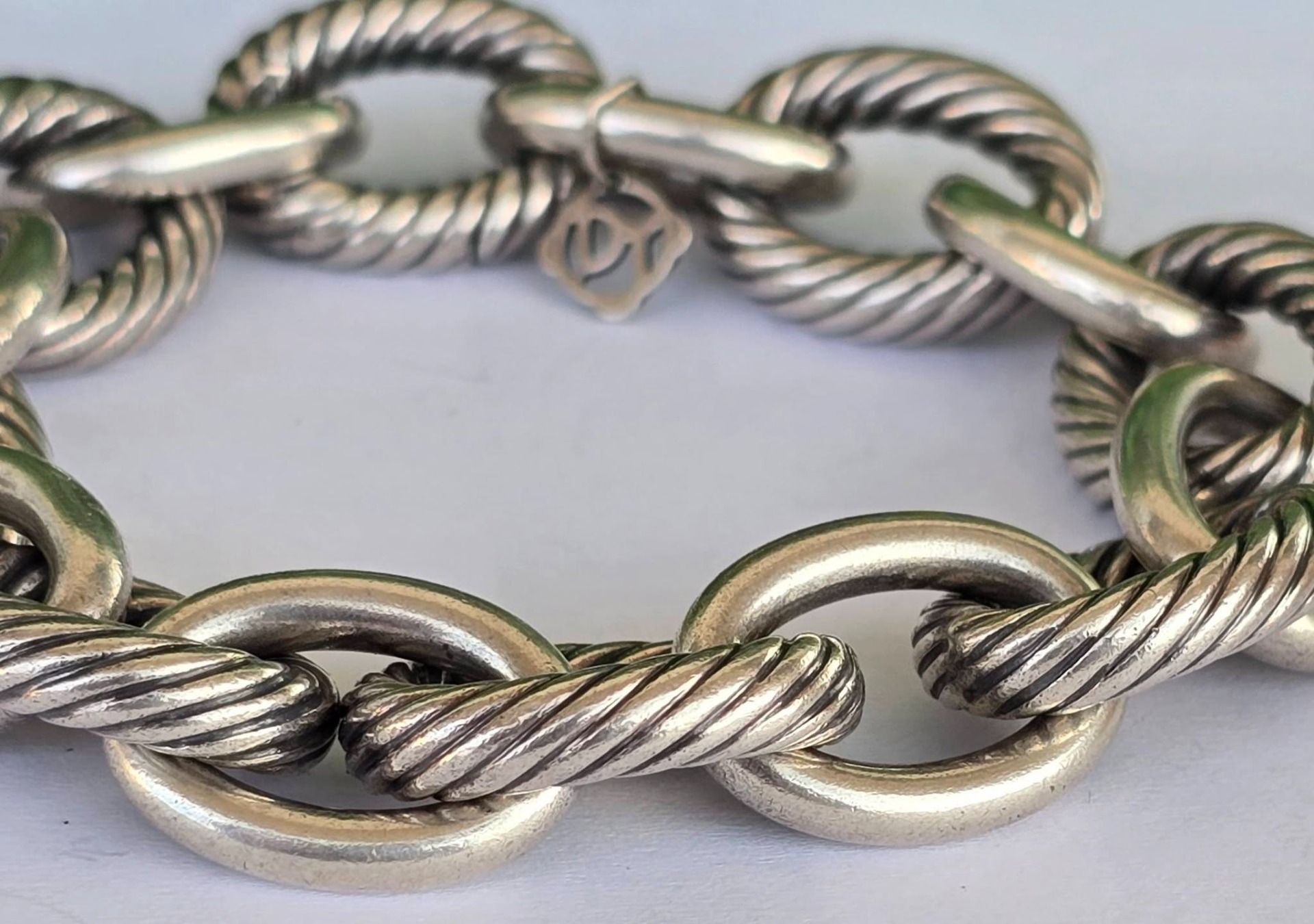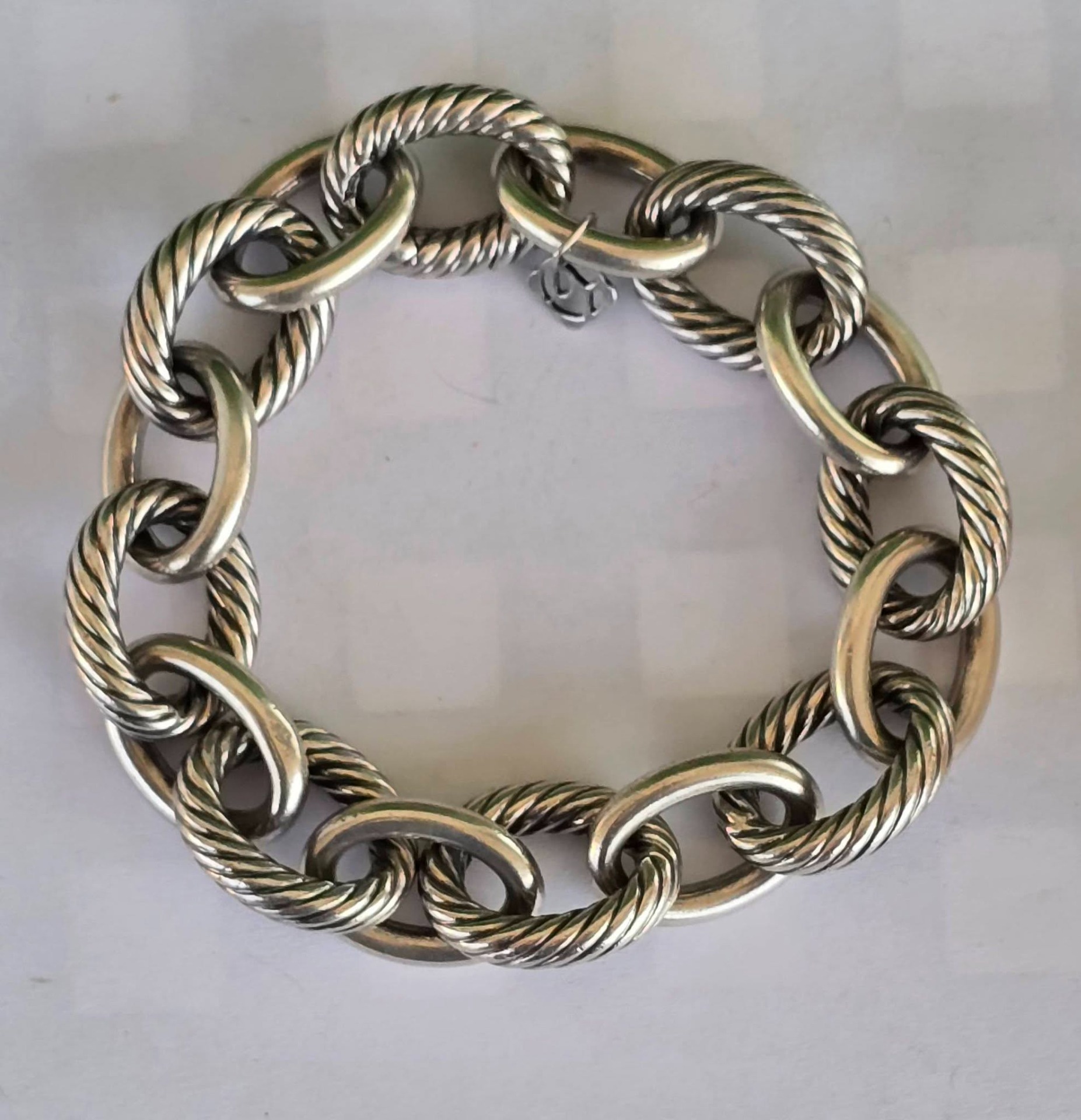 Brățară originală David Yurman din argint, unisex, modelul "Extra Large Oval Link", o piesă statement, masivă și elegantă, cu design care alternează zalele netede, finisate manual, cu celebrele zale tip "Cable" (torsadate), specifice brandului american, cu sistem de închidere "hidden clasp" (închizătoare ascunsă) integrată perfect într-una dintre zale, cu mecanism sigur (anii 2000, New York, SUA).