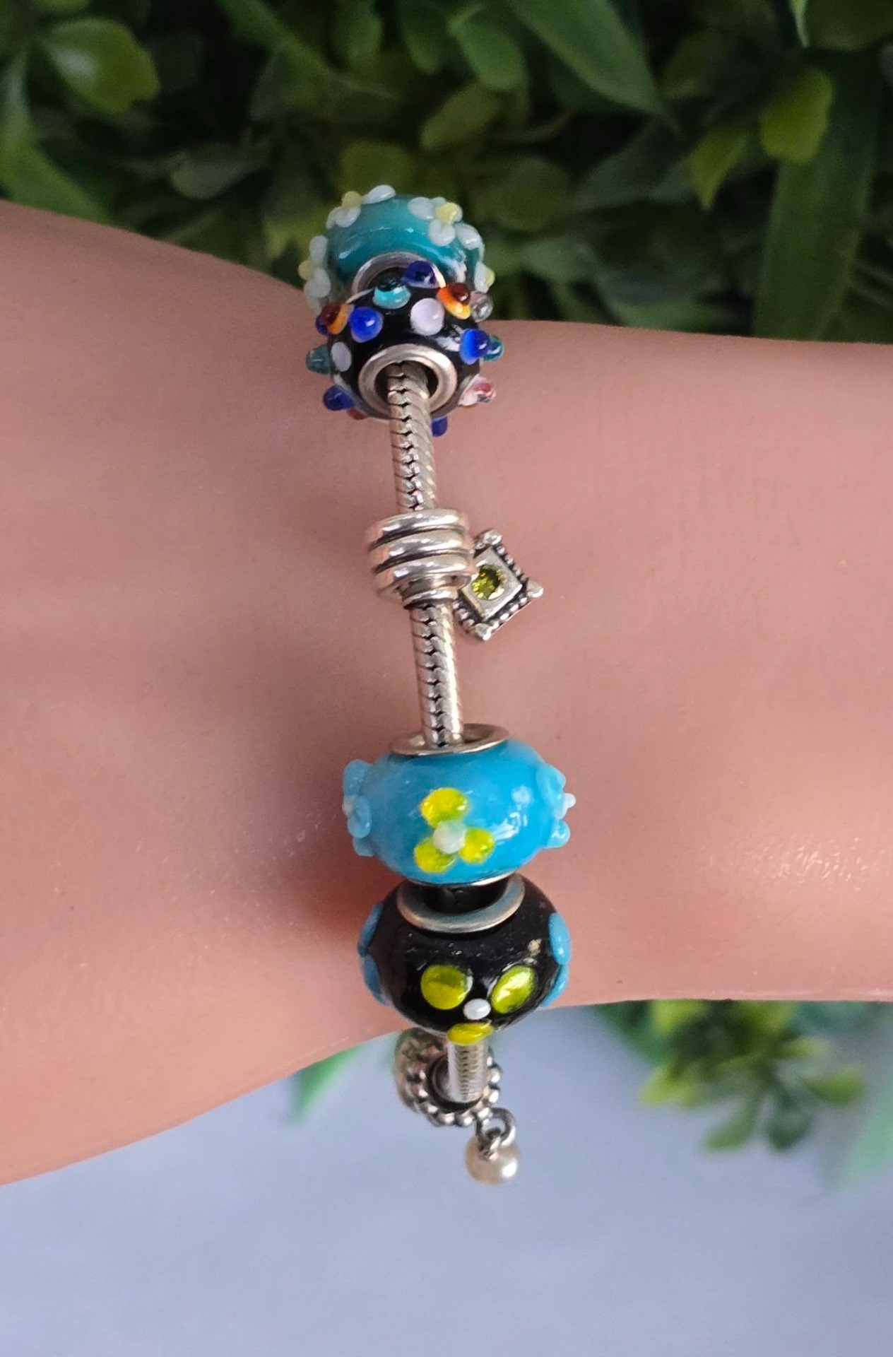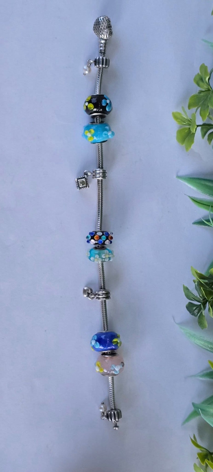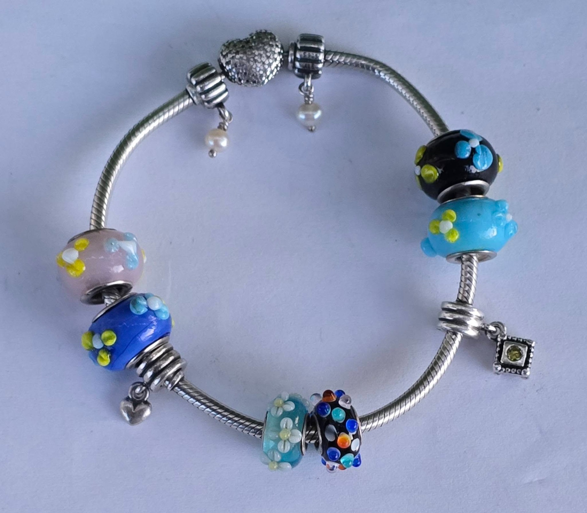 Brățară Pandora originală, din argint, cu 4 charmuri și 6 talismane din sticlă Murrano, cu lanț tip șarpe și închizătoare inimioară.