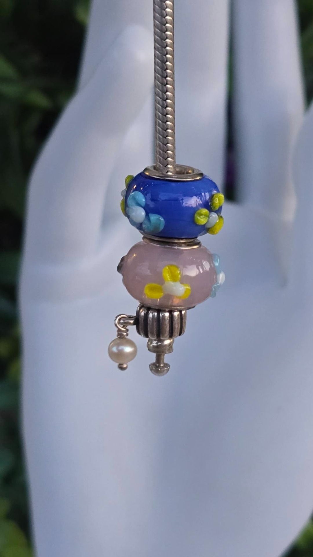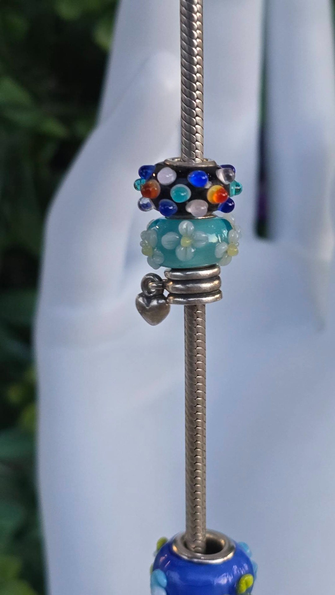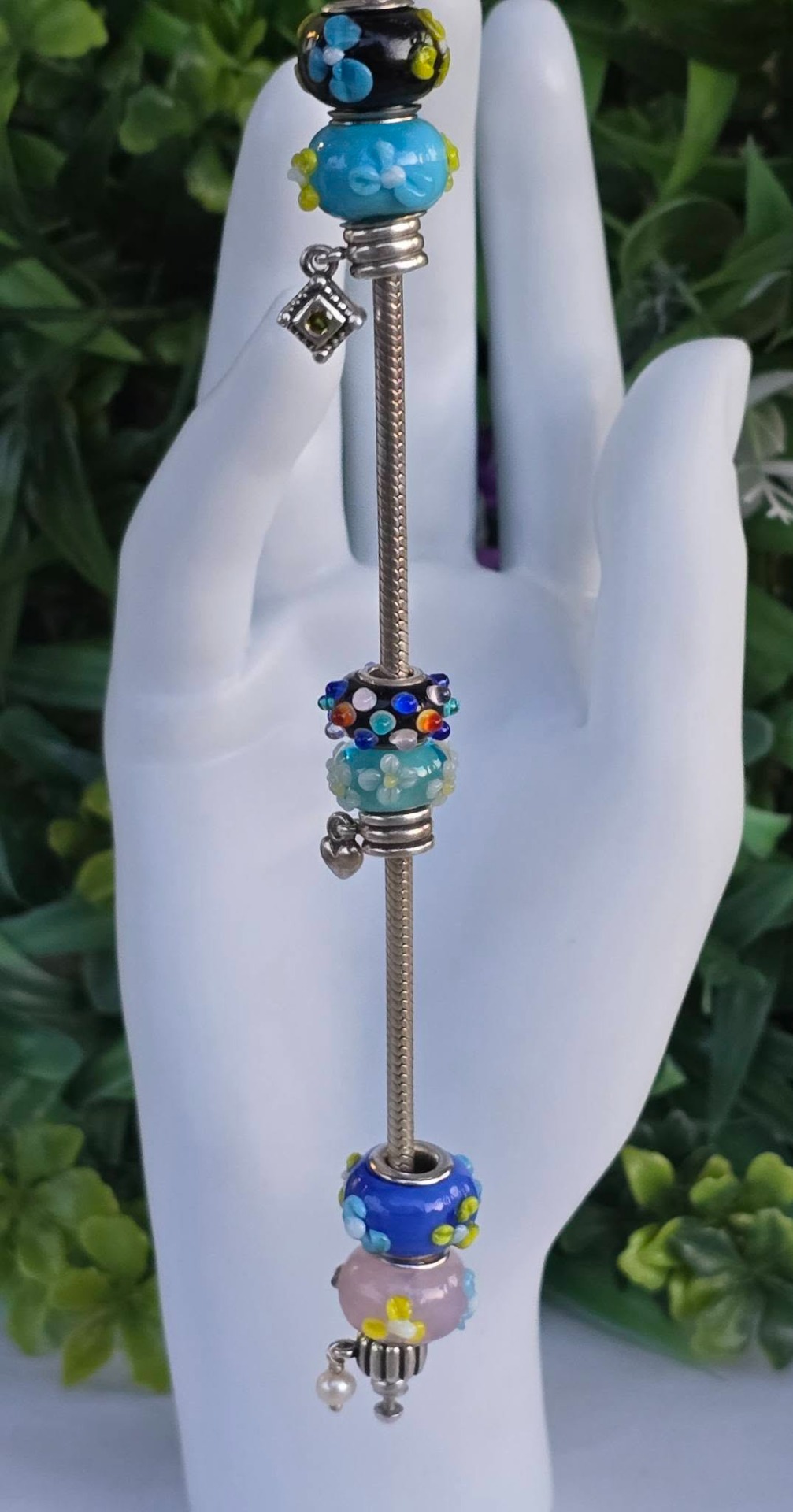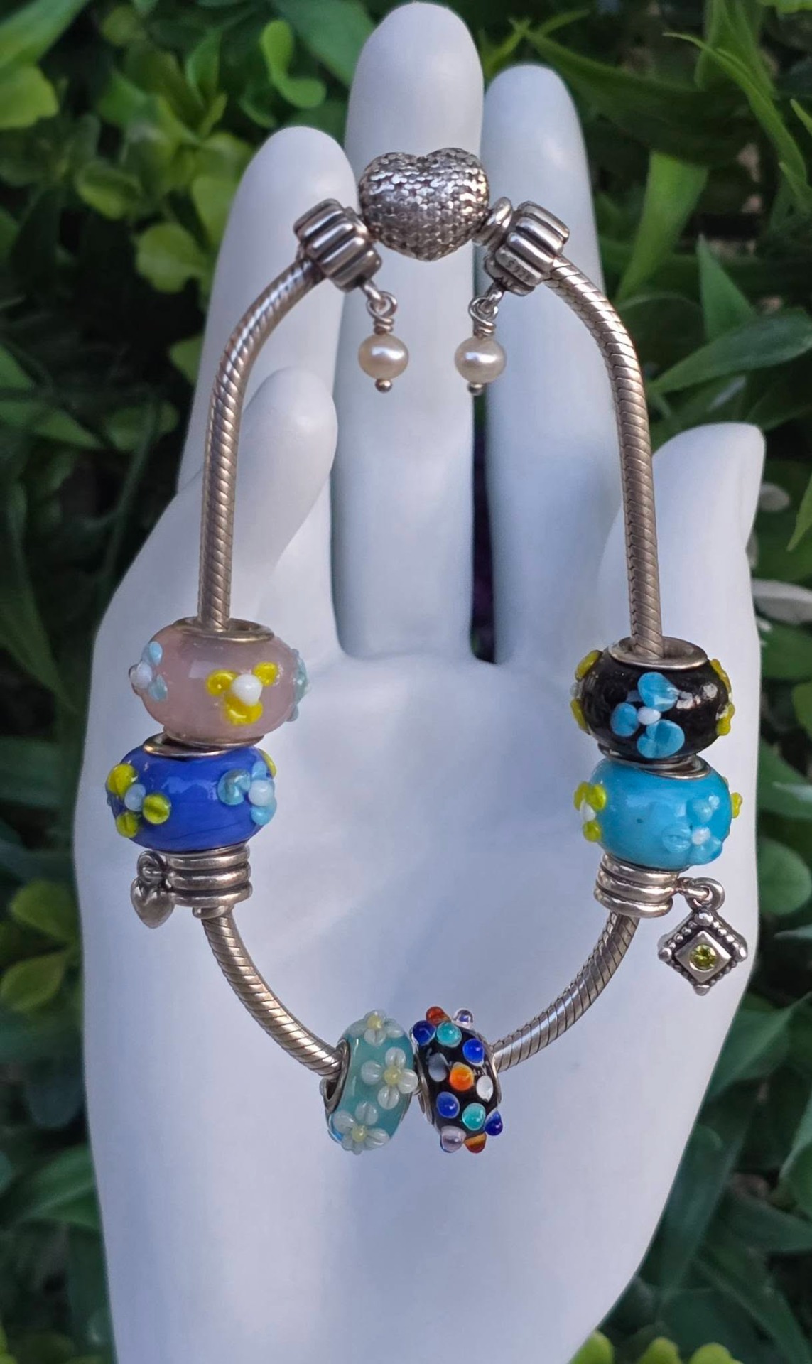 Brățară Pandora originală, din argint, cu 4 charmuri și 6 talismane din sticlă Murrano, cu lanț tip șarpe și închizătoare inimioară.