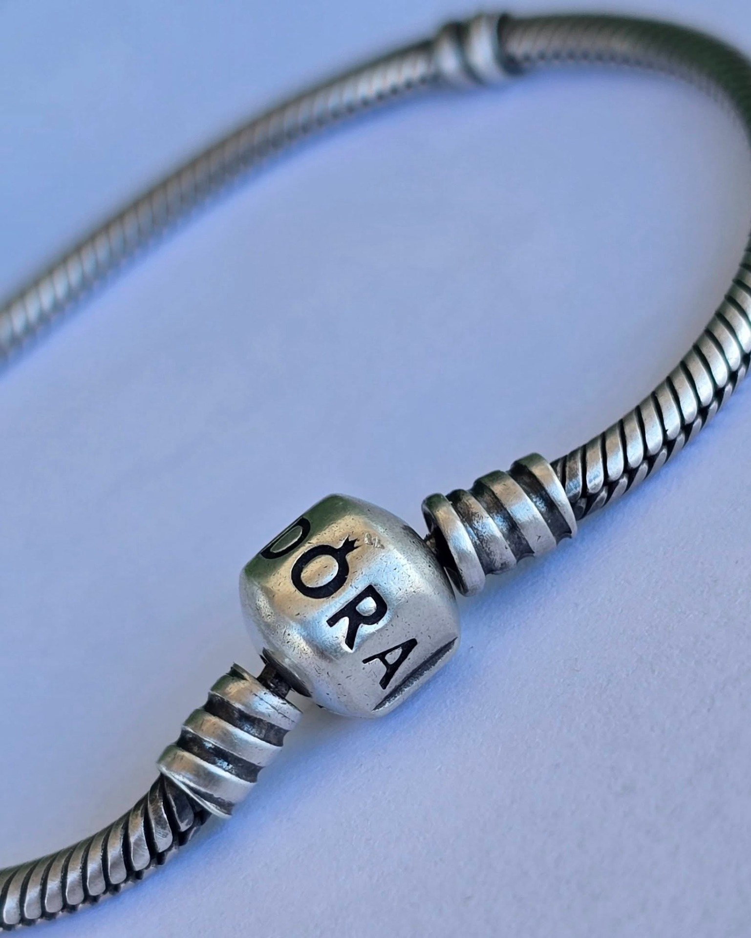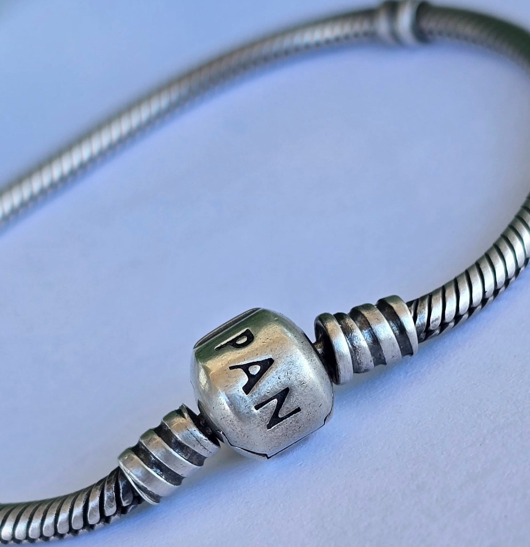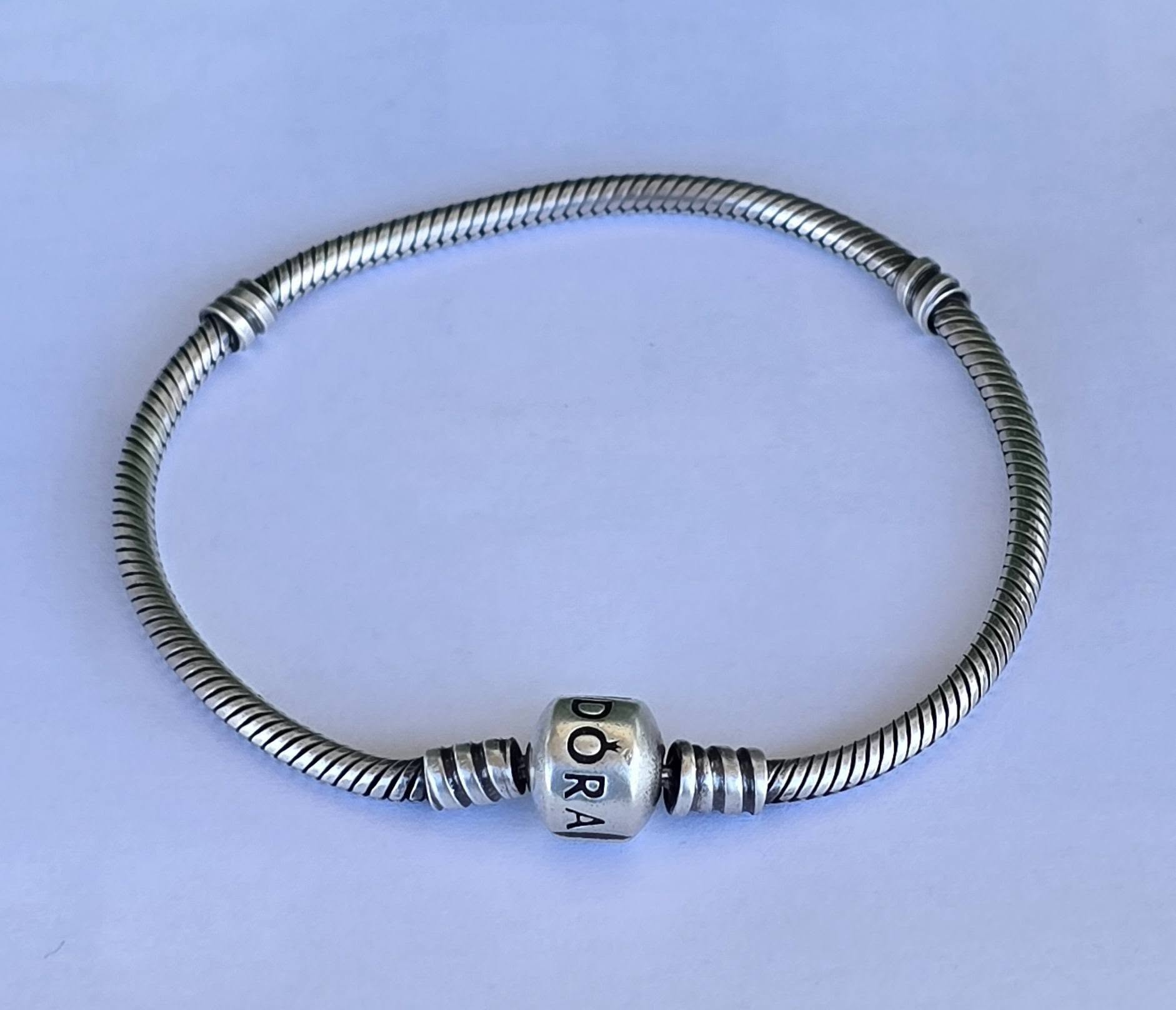 Brățară Pandora originală, din argint, cu lanț tip șarpe și închizătoare rotundă.