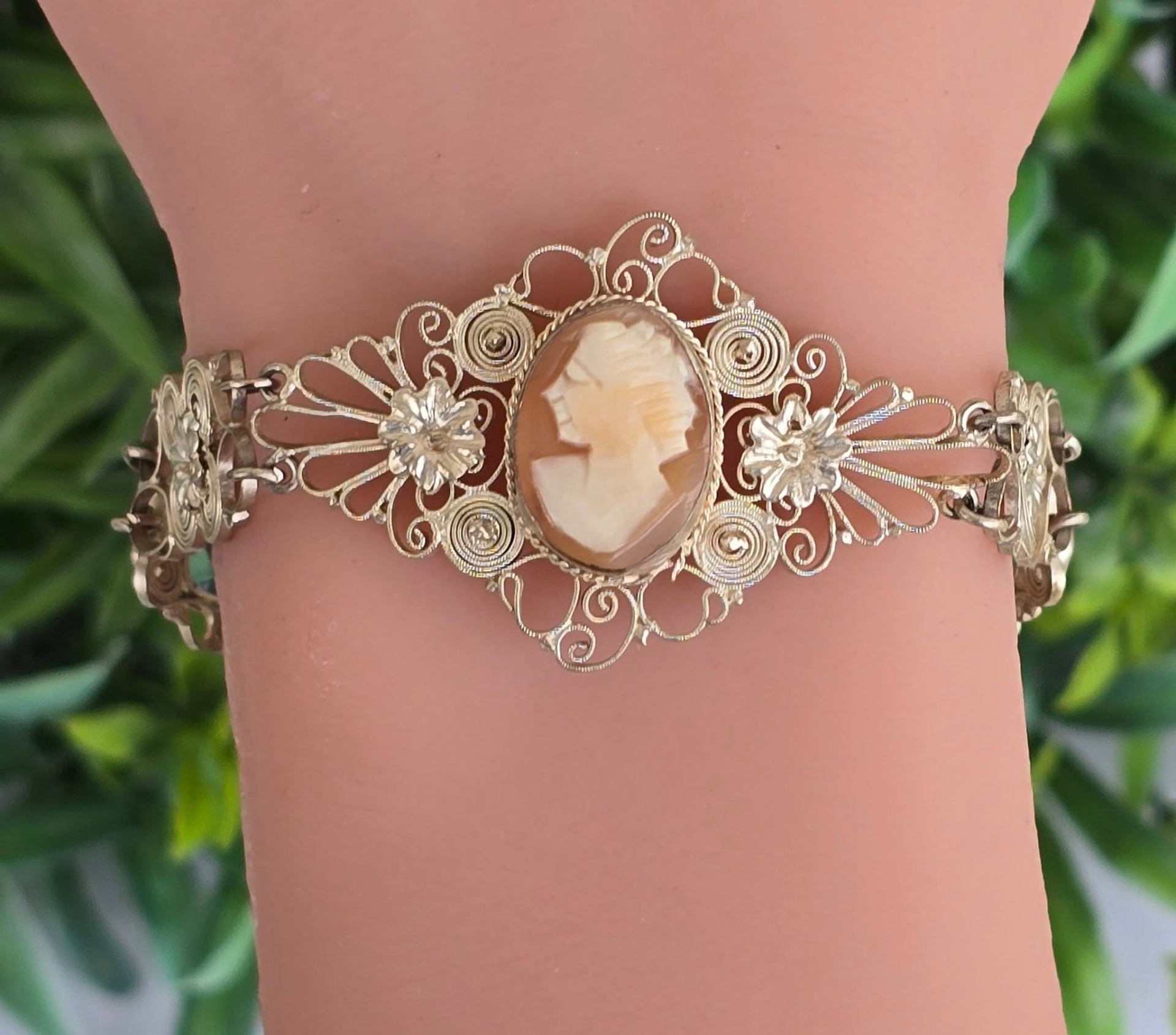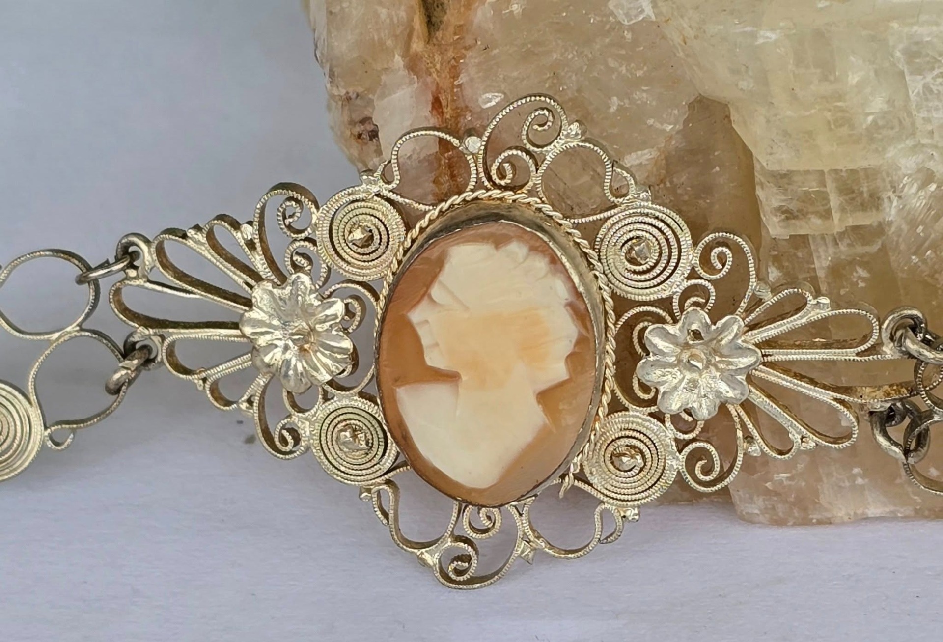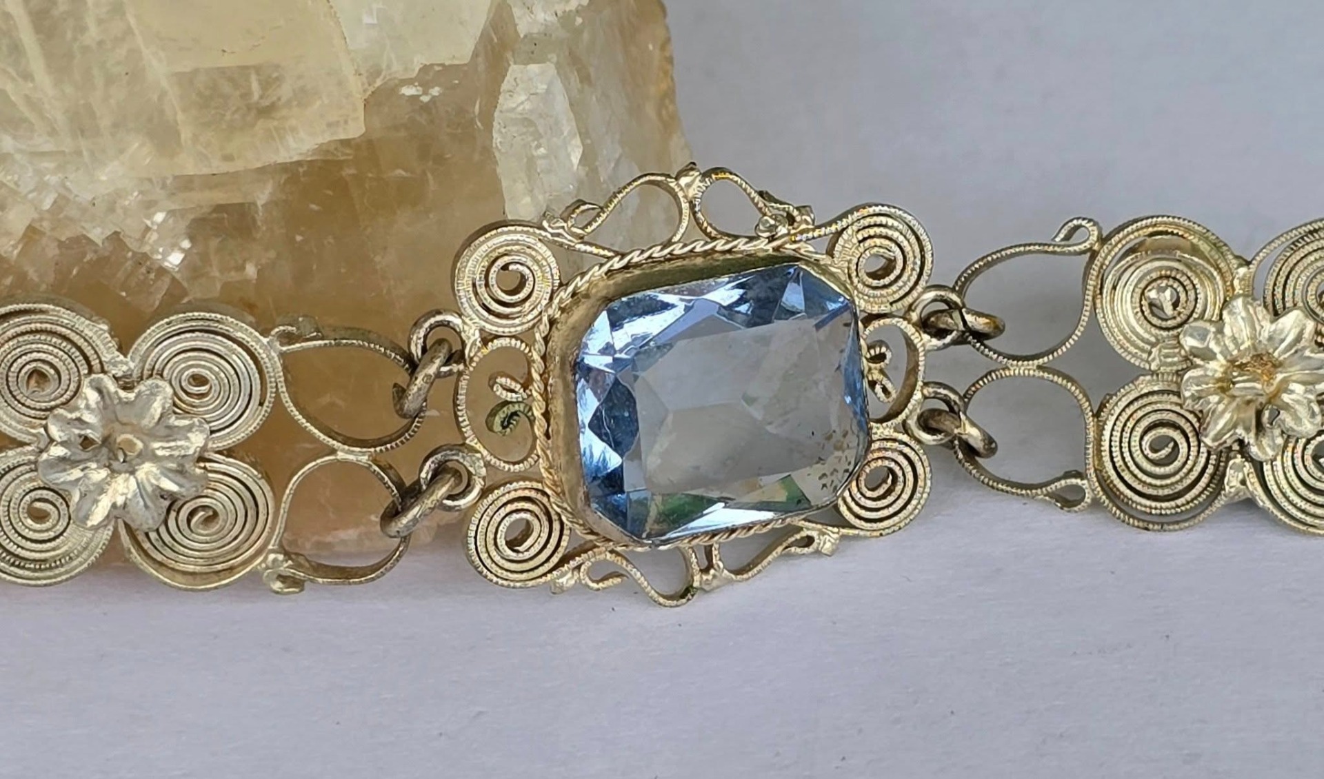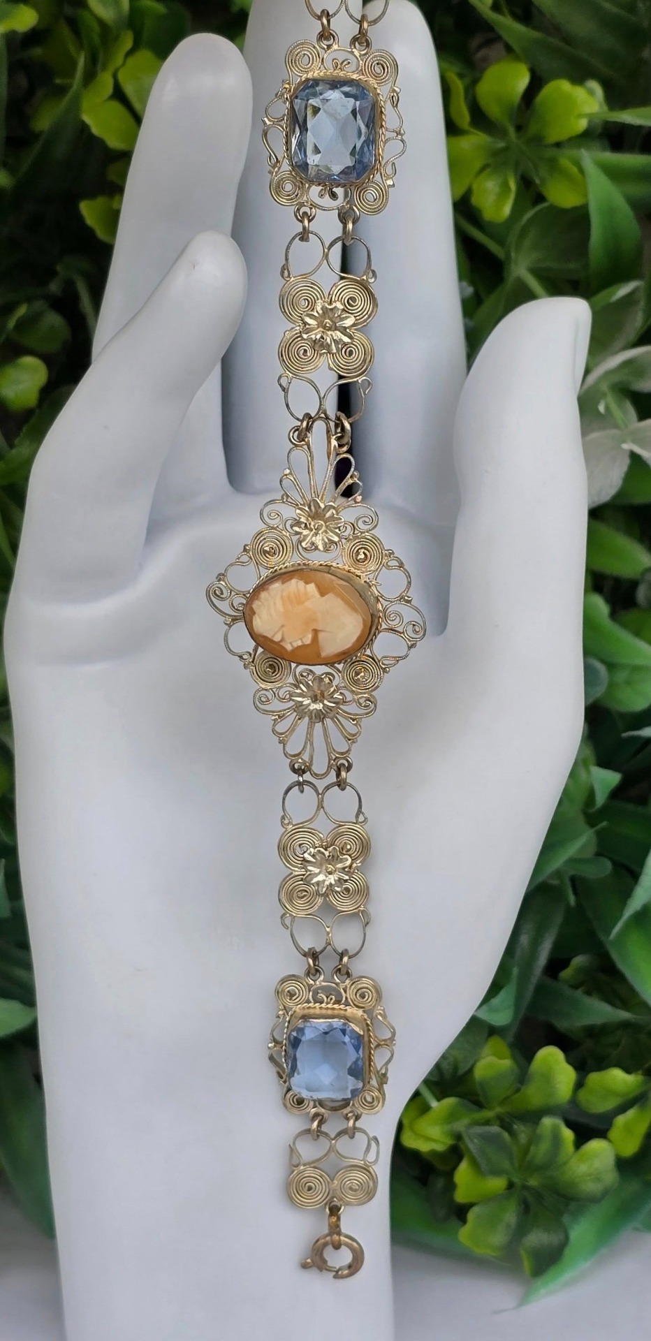 Brățară veche deosebită, din metal argintat, cu camee naturală și topaze "simulate", manufactură complexă în filigran.