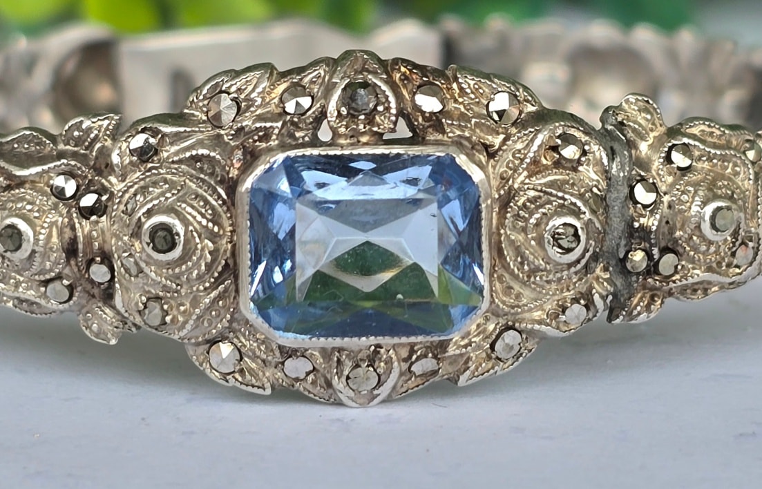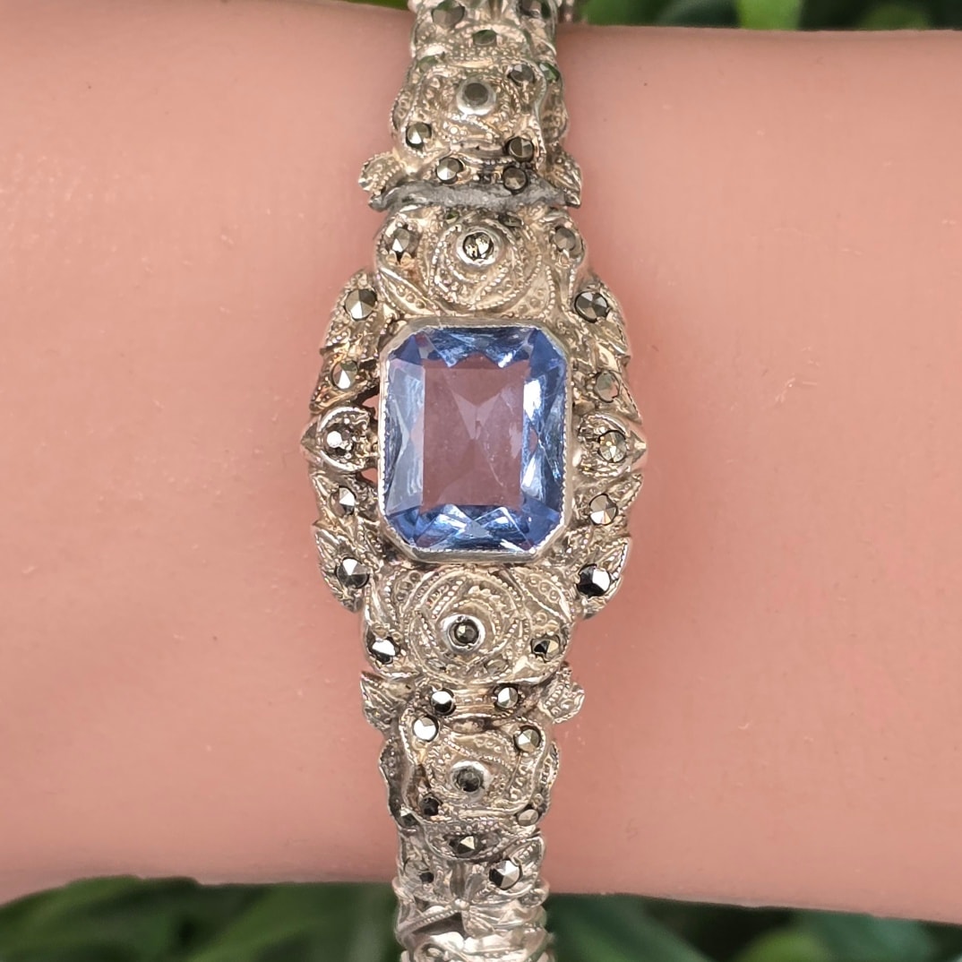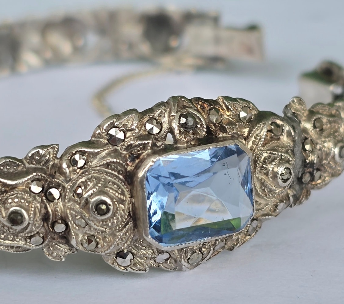 Brățară veche din argint, cu piatră cubic zirconia albastră și marcasite.