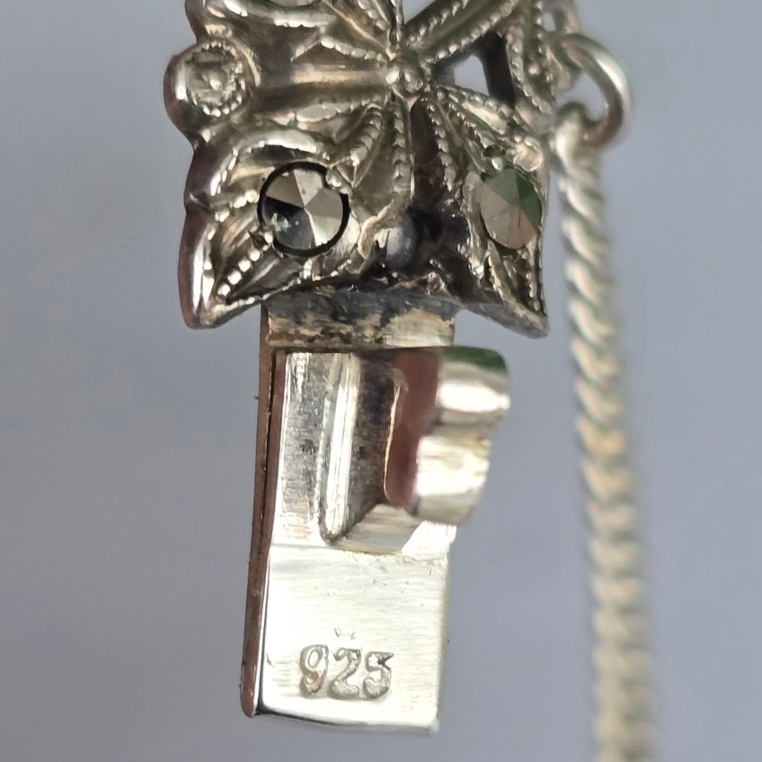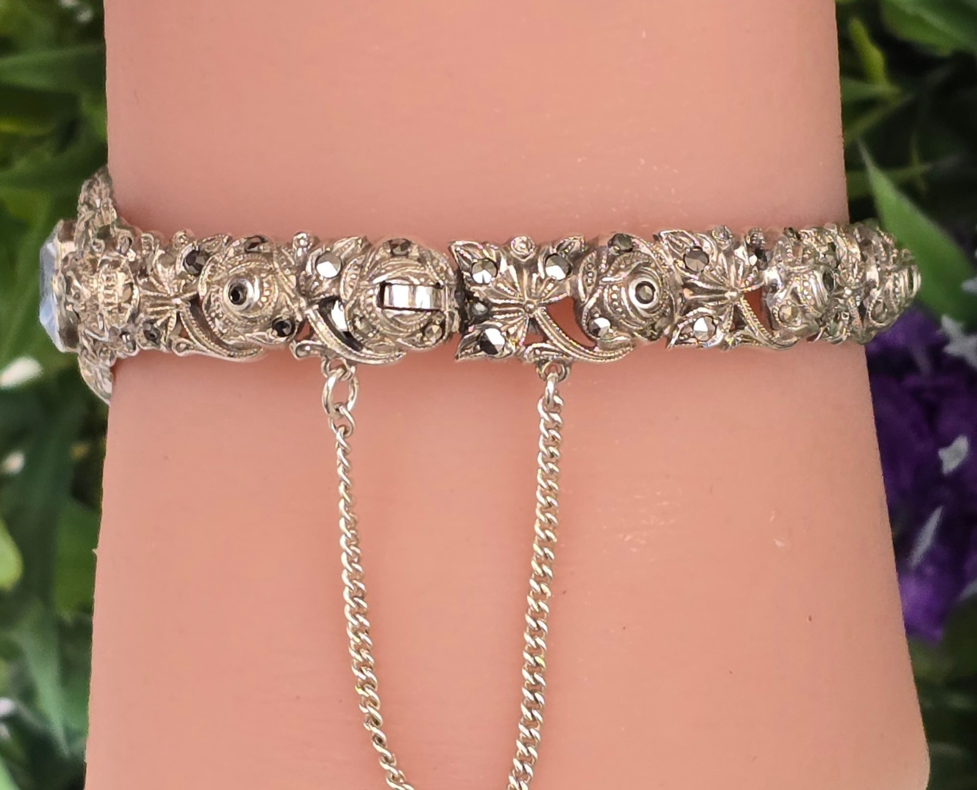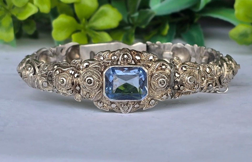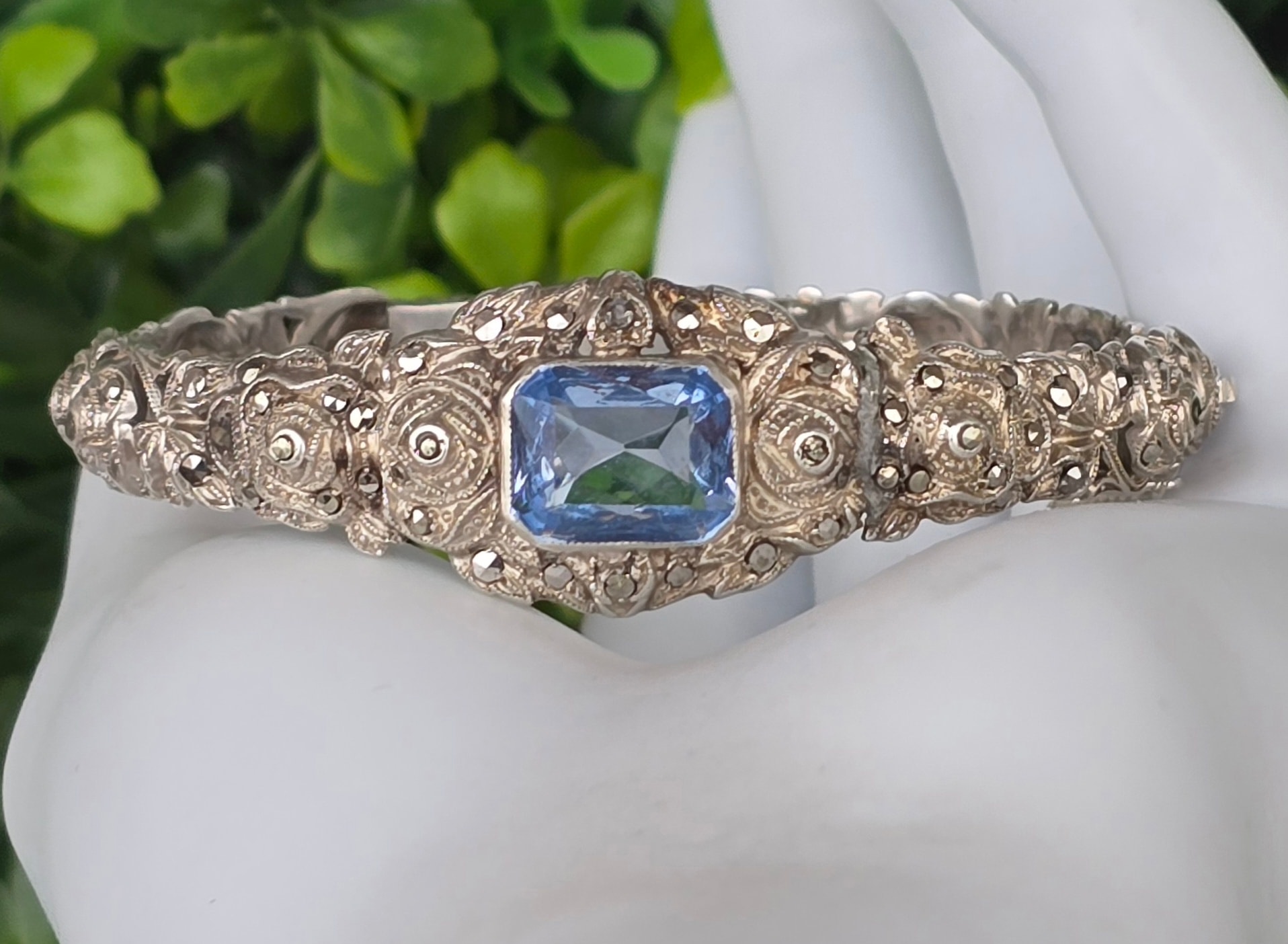 Brățară veche din argint, cu piatră cubic zirconia albastră și marcasite.