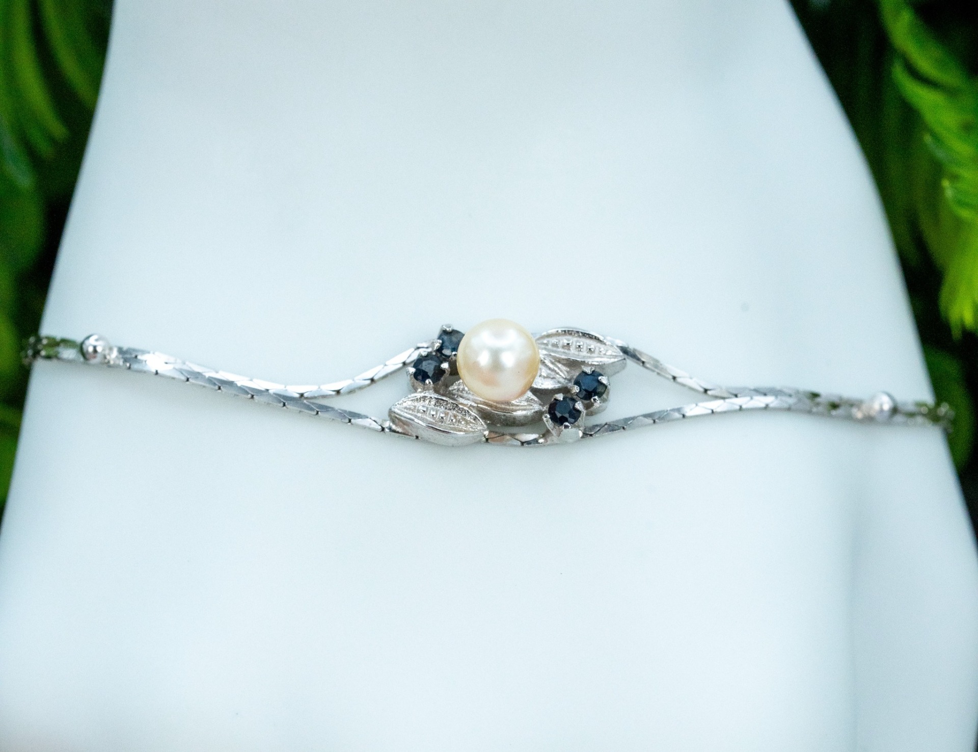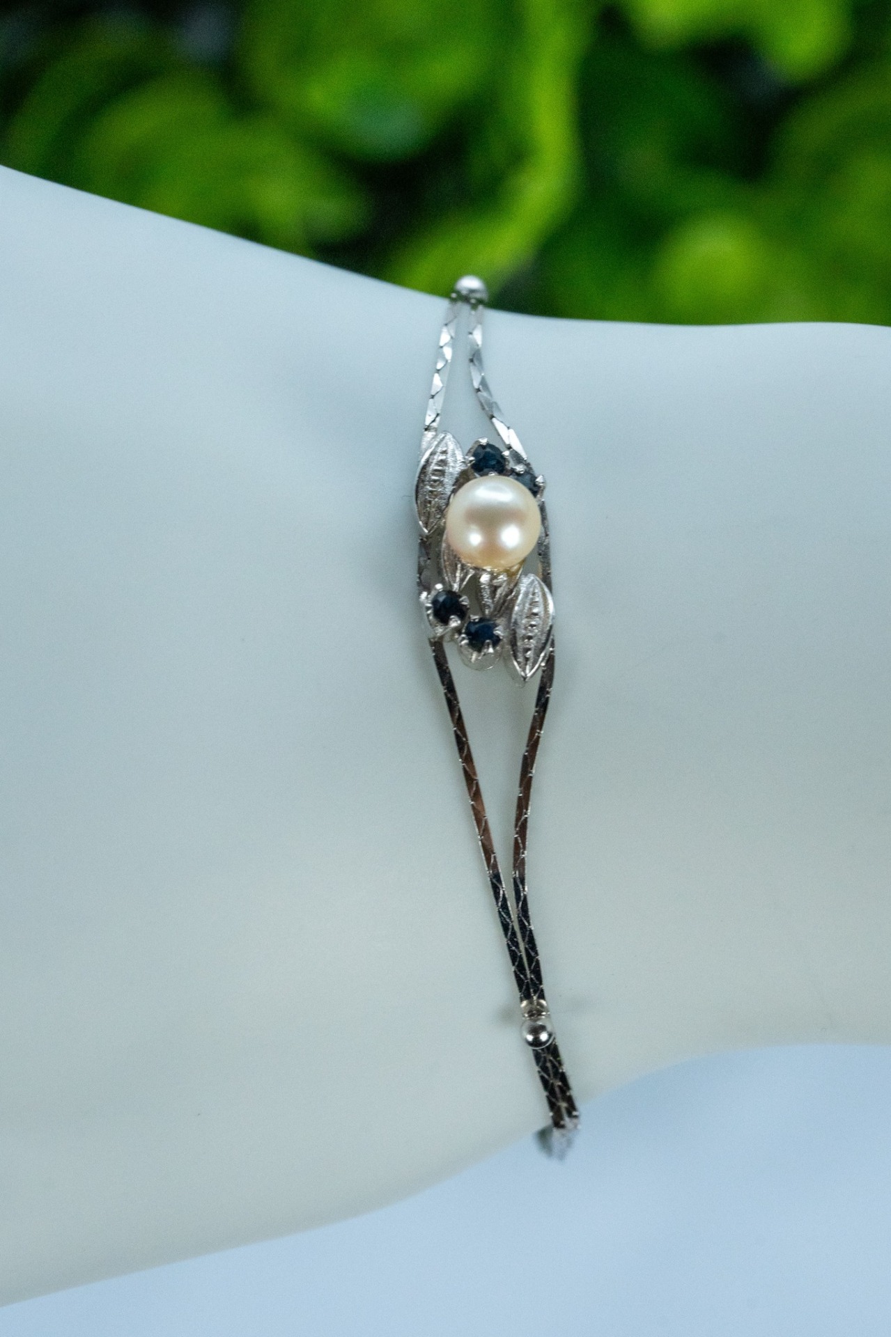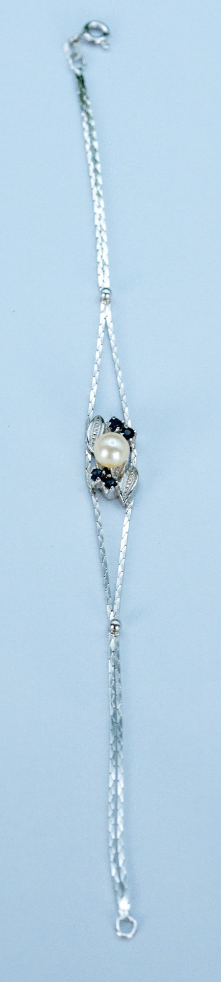 Brățară veche din argint, cu safire naturale și perlă naturală de cultură.