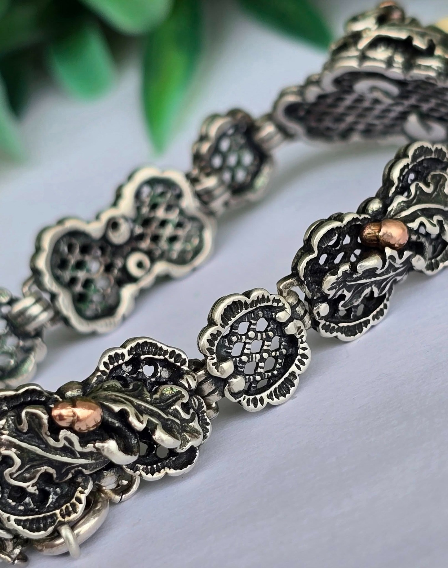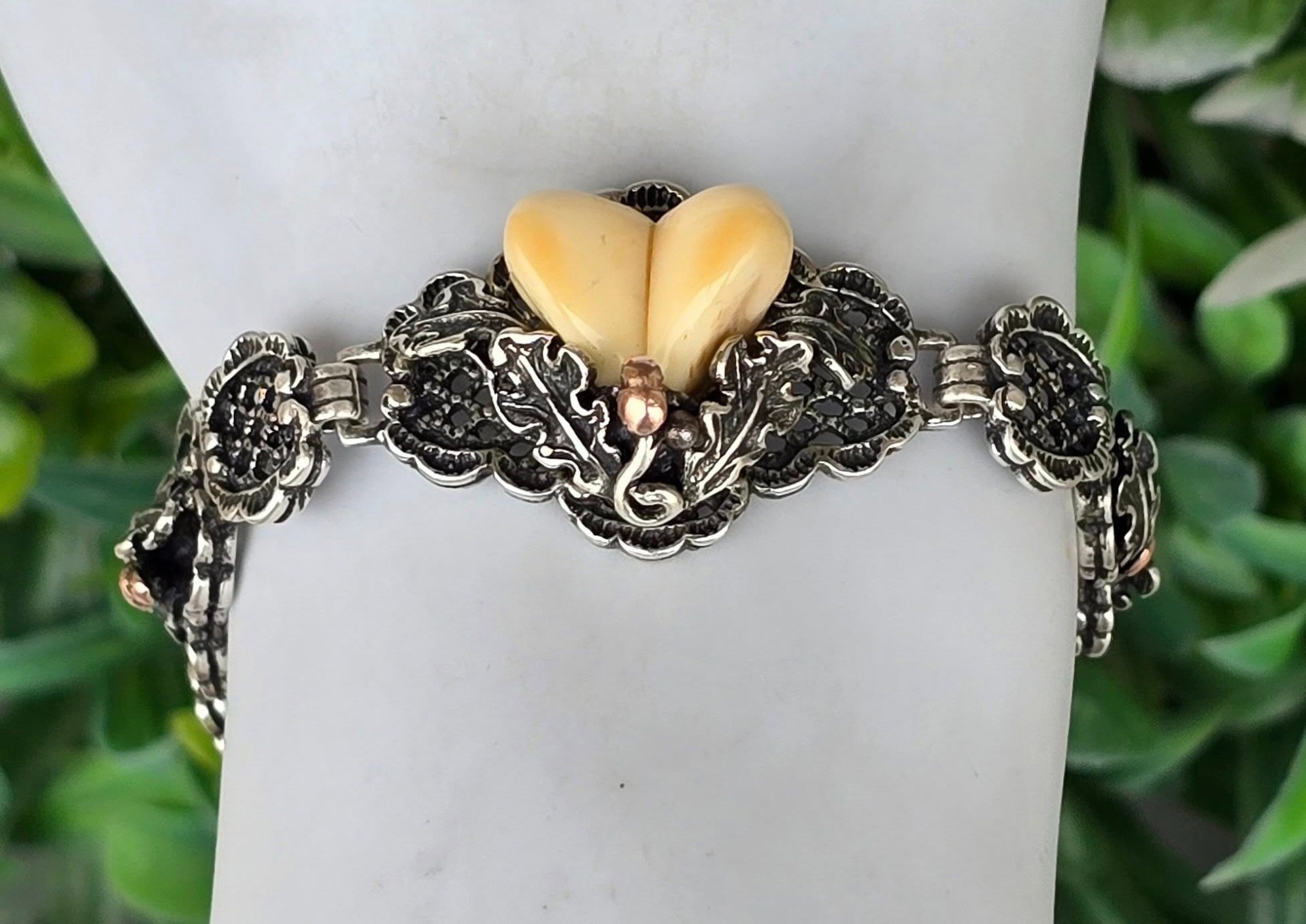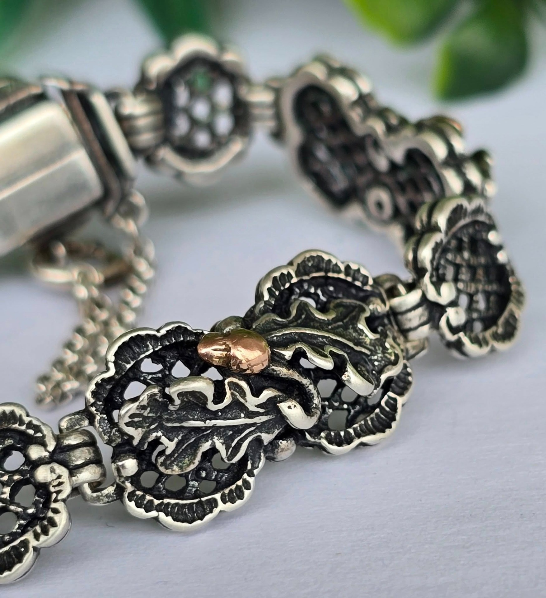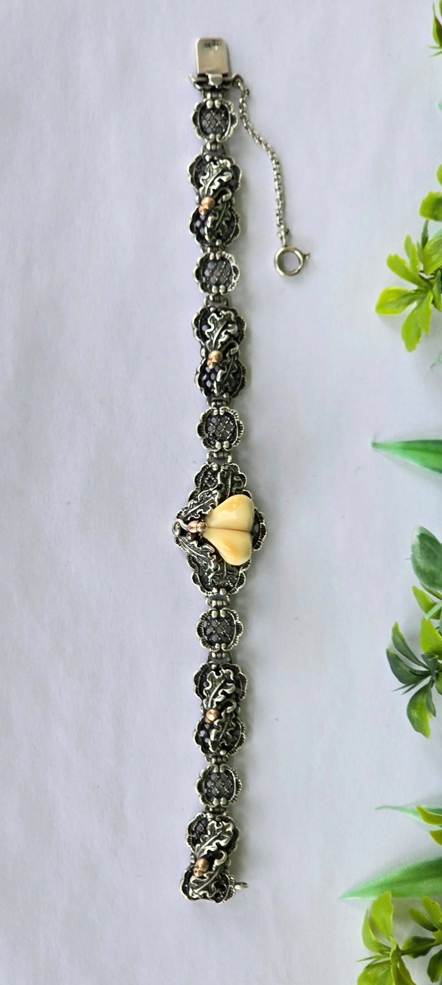 Brățară veche Grandel, din argint, cu dinți de cerb, frumos lucrată manual, stilizată cu ghinde din aur de 14K și frunze de stejar (anii 1930-1940, Salzburg,