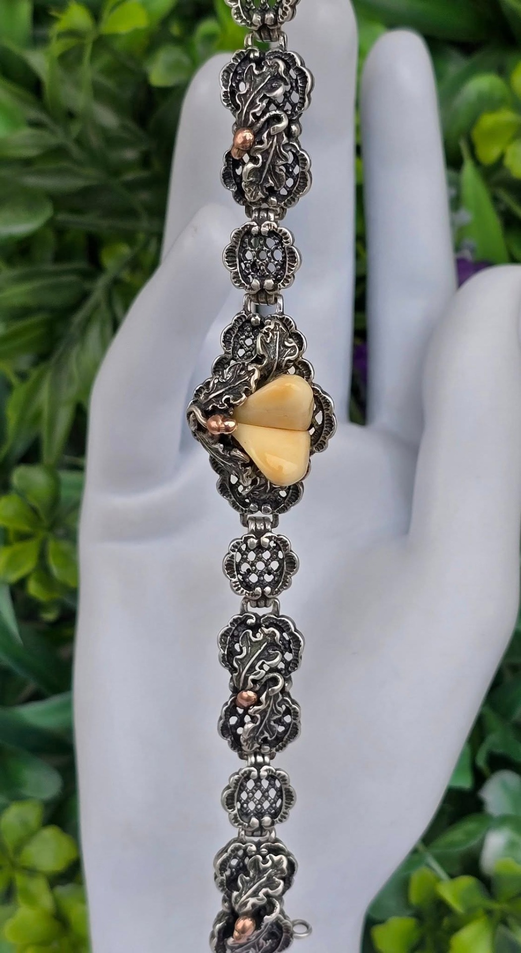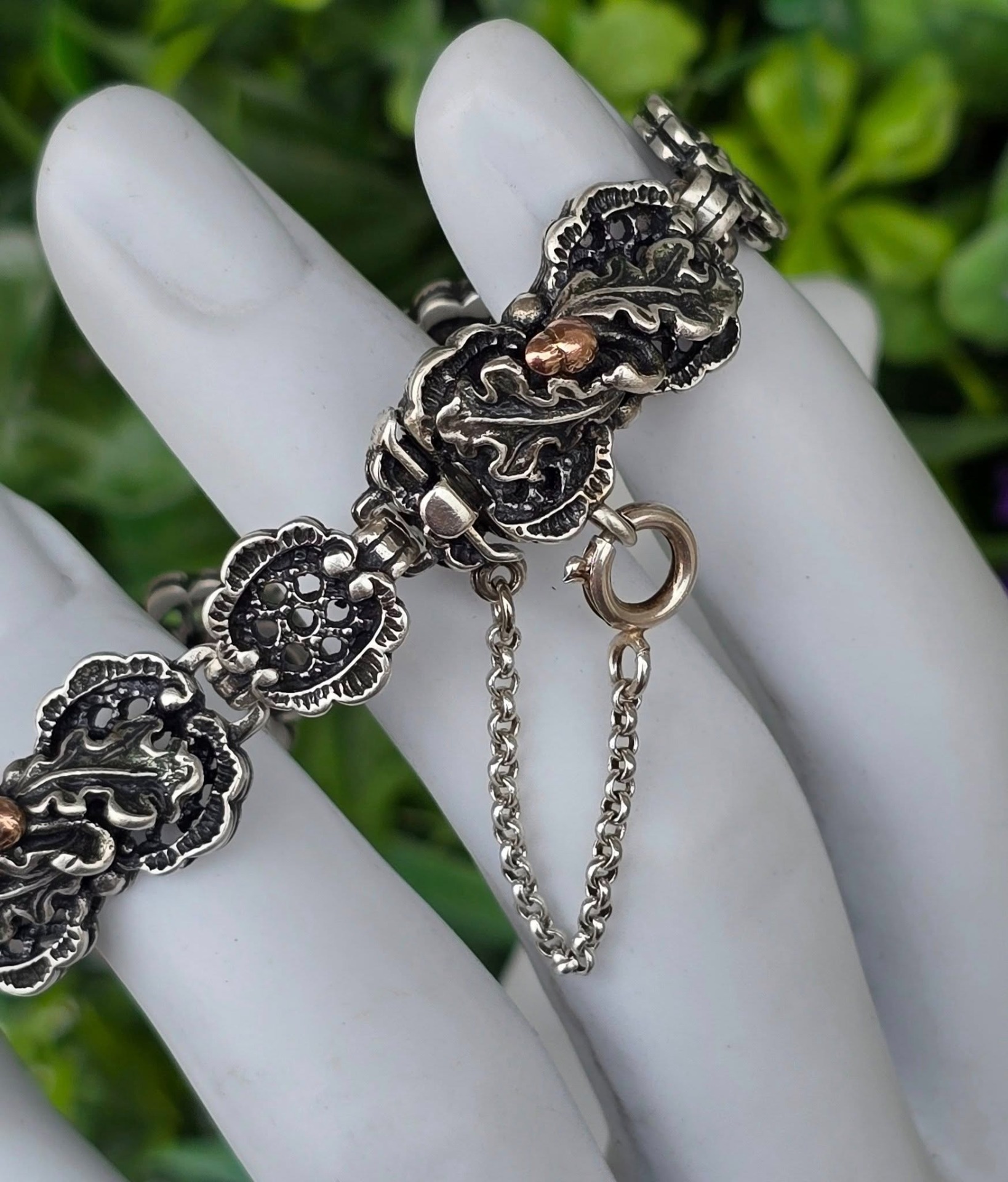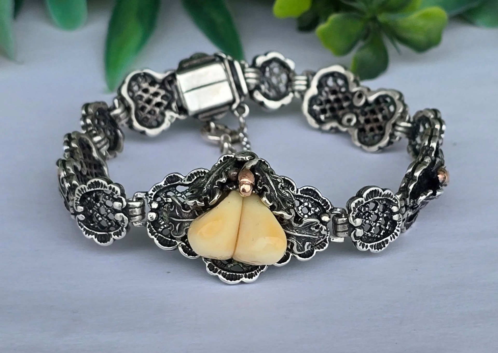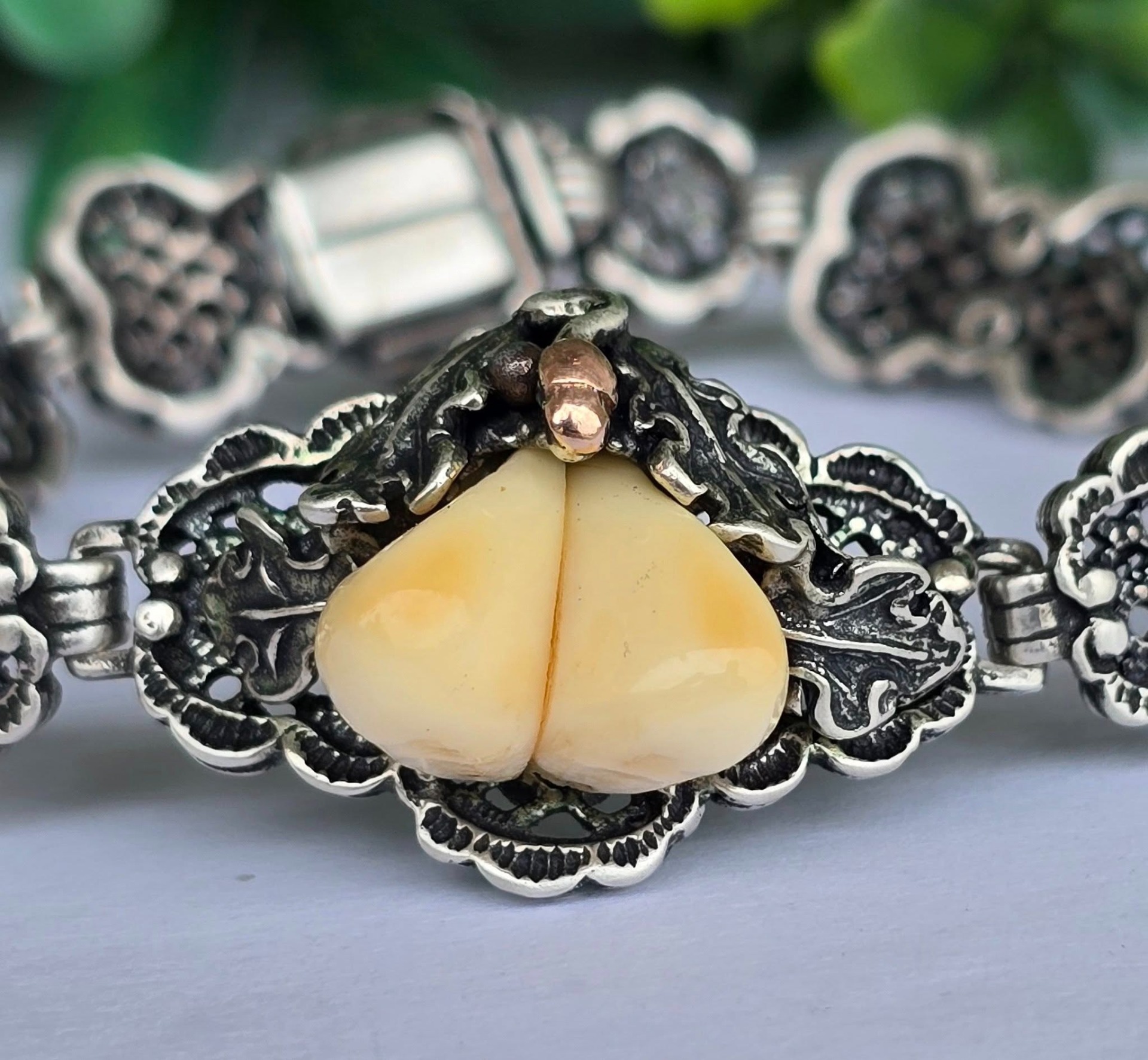 Brățară veche Grandel, din argint, cu dinți de cerb, frumos lucrată manual, stilizată cu ghinde din aur de 14K și frunze de stejar (anii 1930-1940, Salzburg,