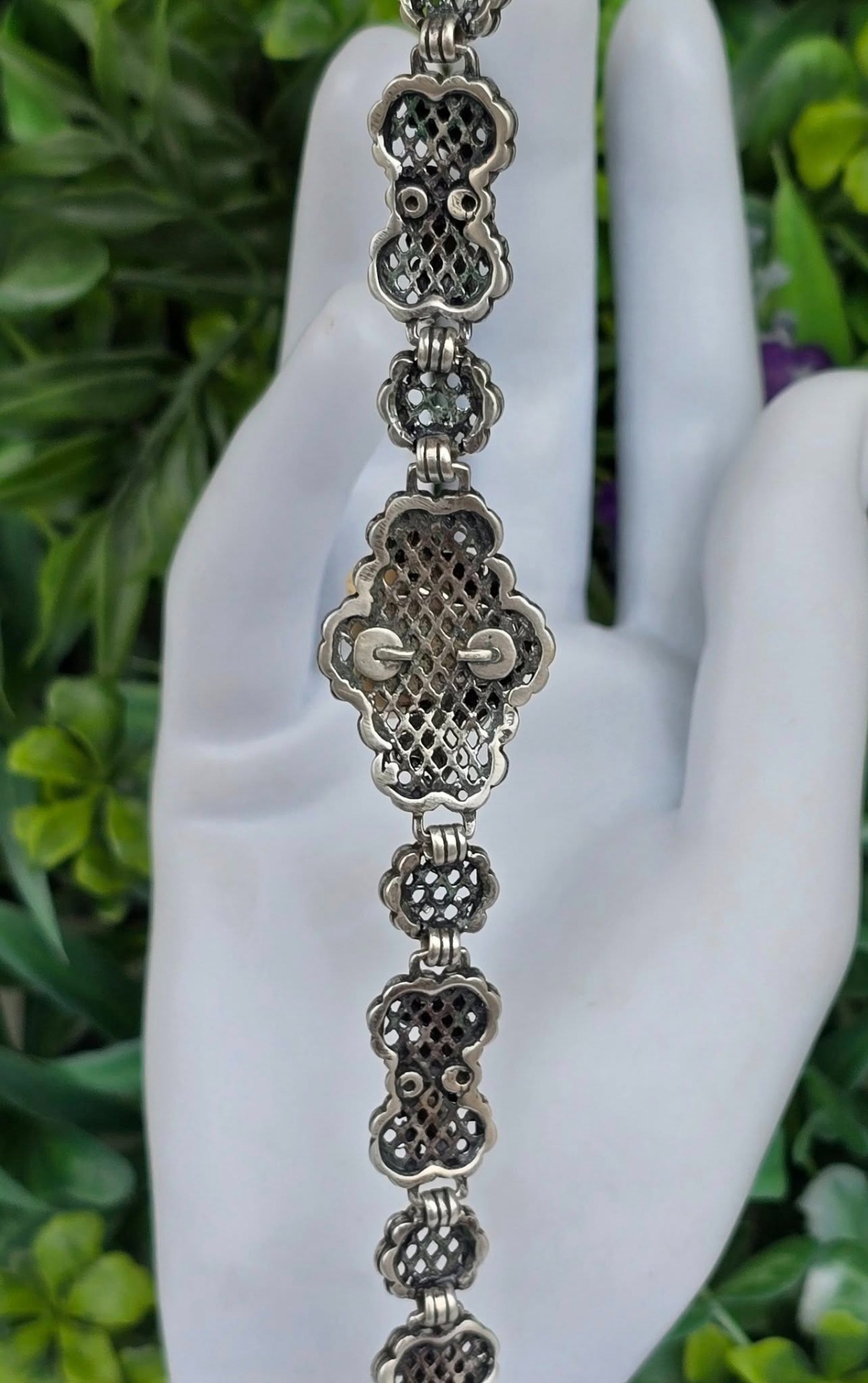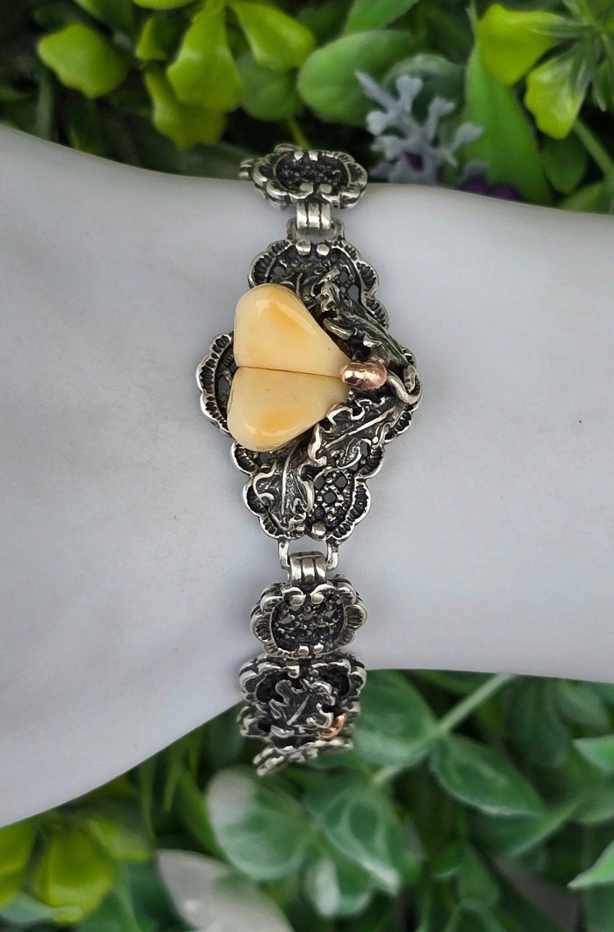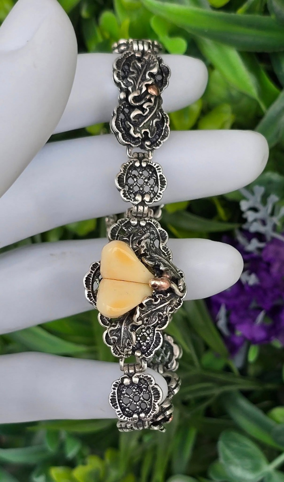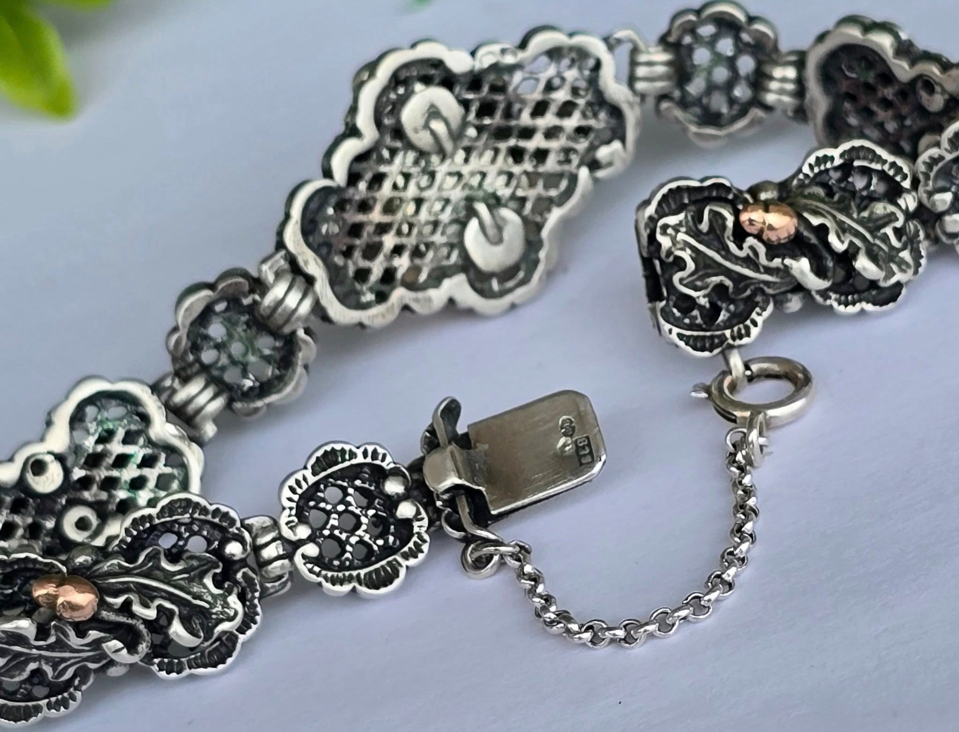 Brățară veche Grandel, din argint, cu dinți de cerb, frumos lucrată manual, stilizată cu ghinde din aur de 14K și frunze de stejar (anii 1930-1940, Salzburg,