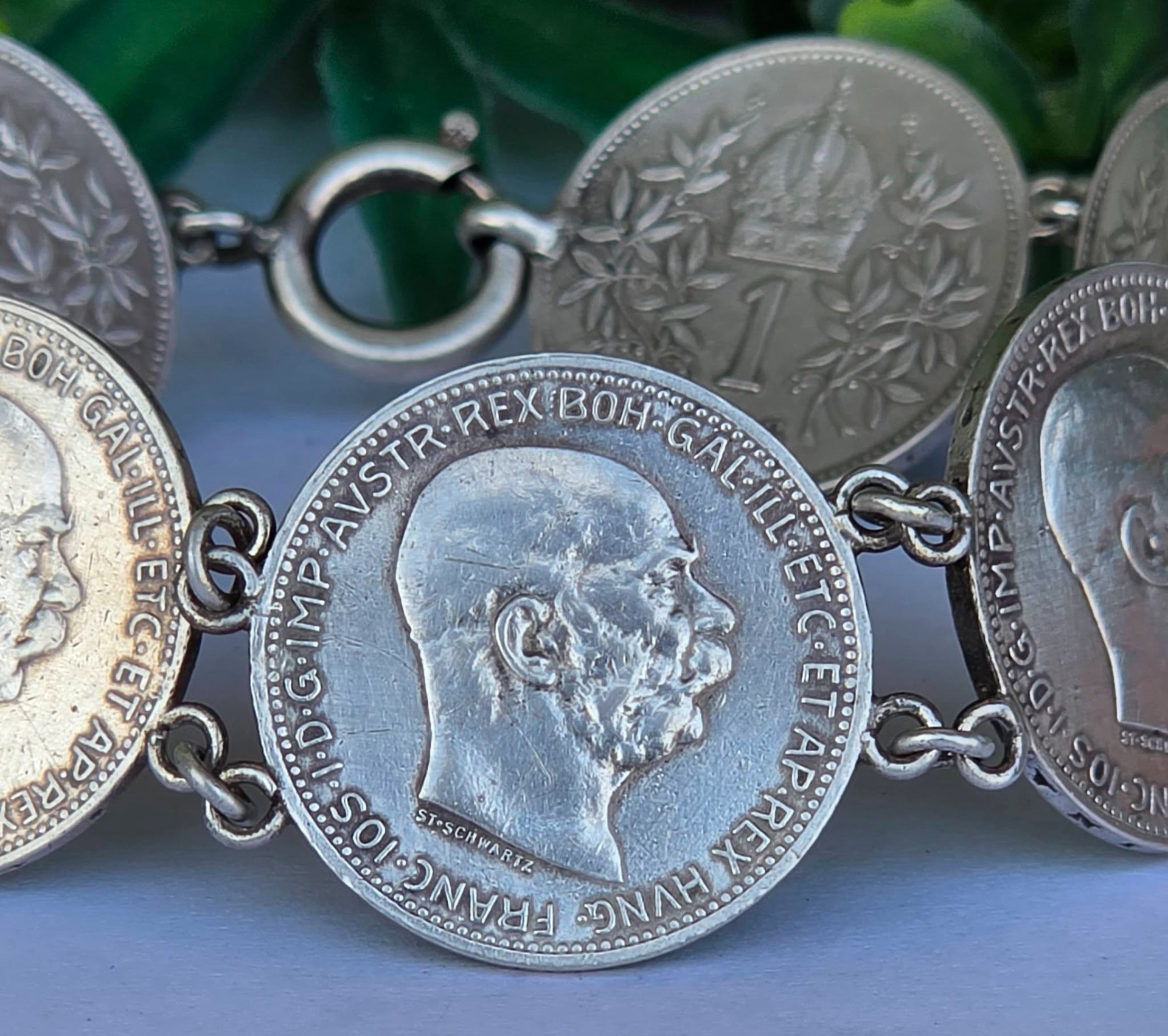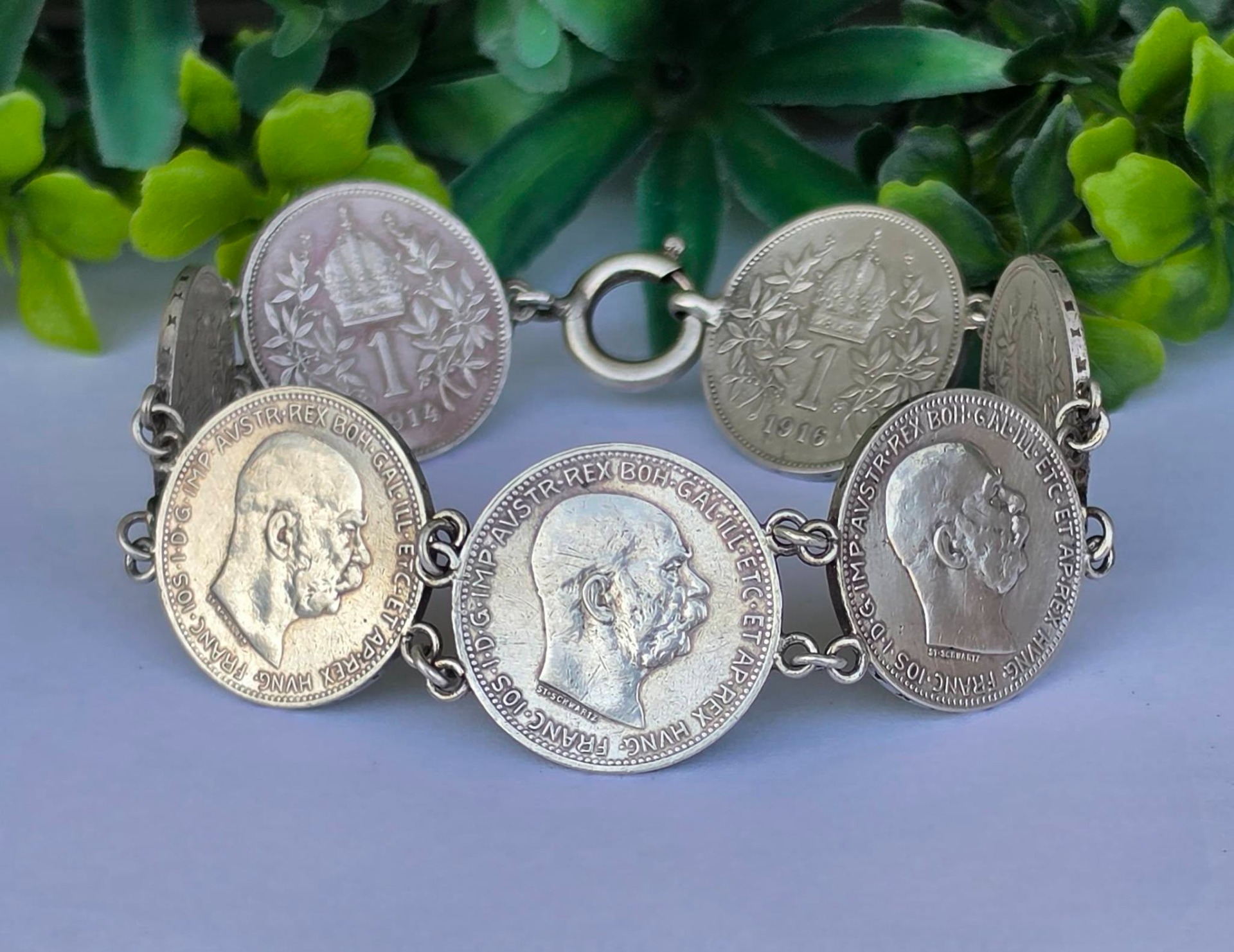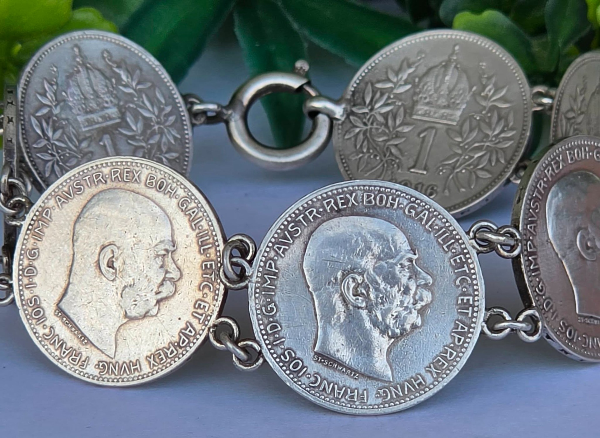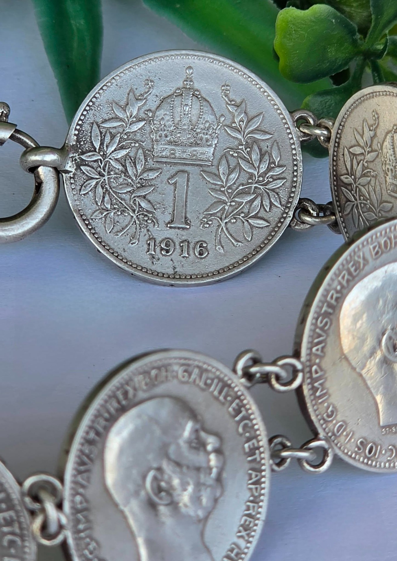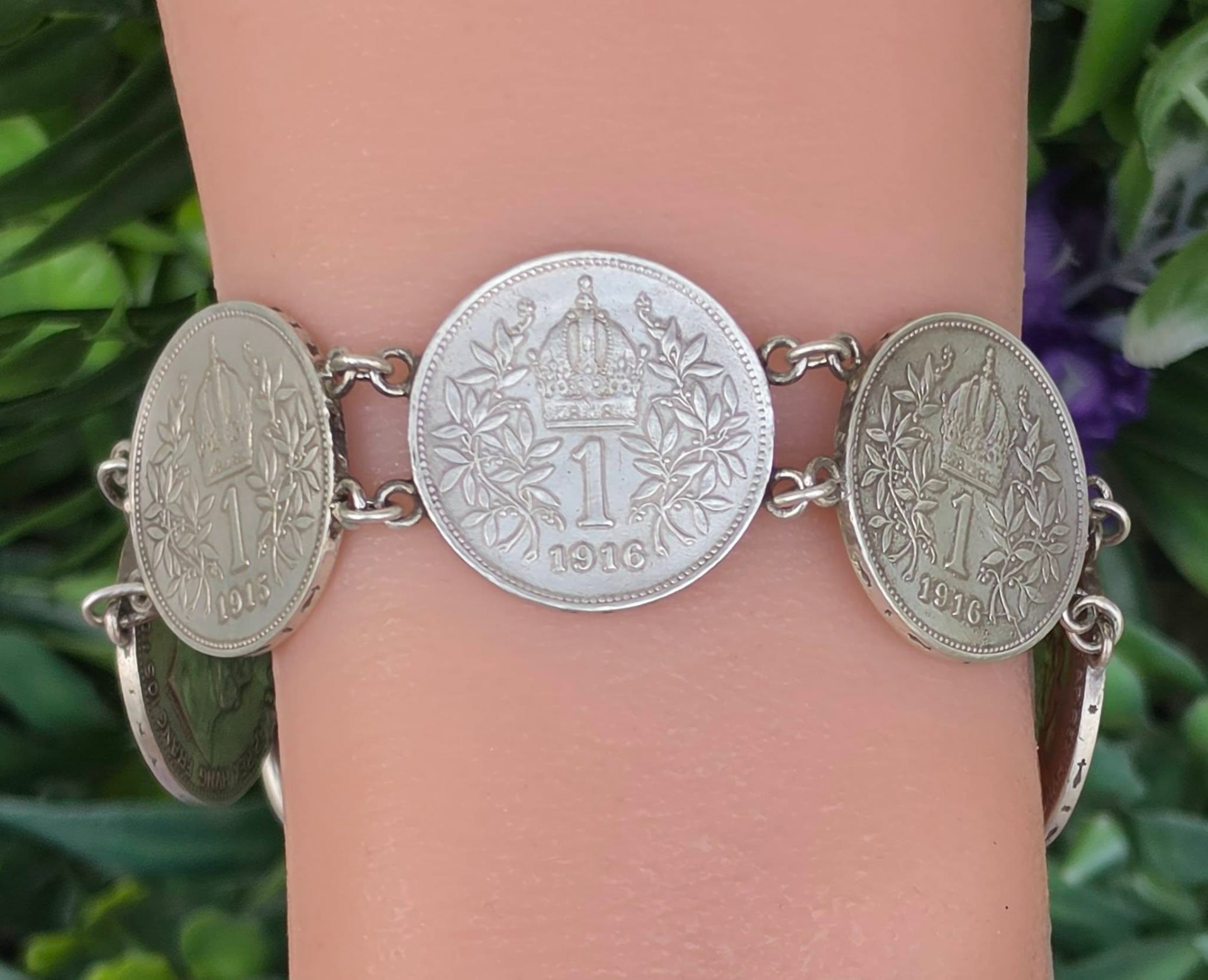 Brățară veche impresionantă, din argint, de colecție, cu 7 monede de o coroană din perioada Imperiului Austro-Ungar, monede cu mare însemnătate istorică, fiind bătute în anii 1914, 1915 și 1916, perioada de început a Primului Război Mondial, cu chipul împăratului Franz Joseph I, și printre ultimele apărute în Imperiu, ținând cont că acesta s-a dizolvat în anul 1918.