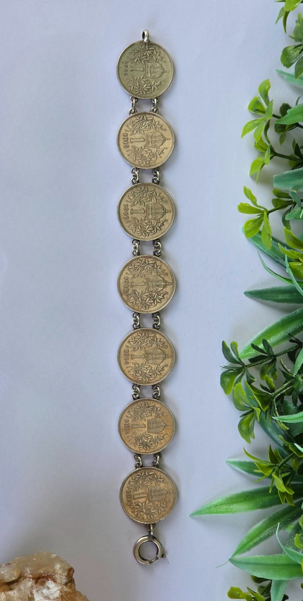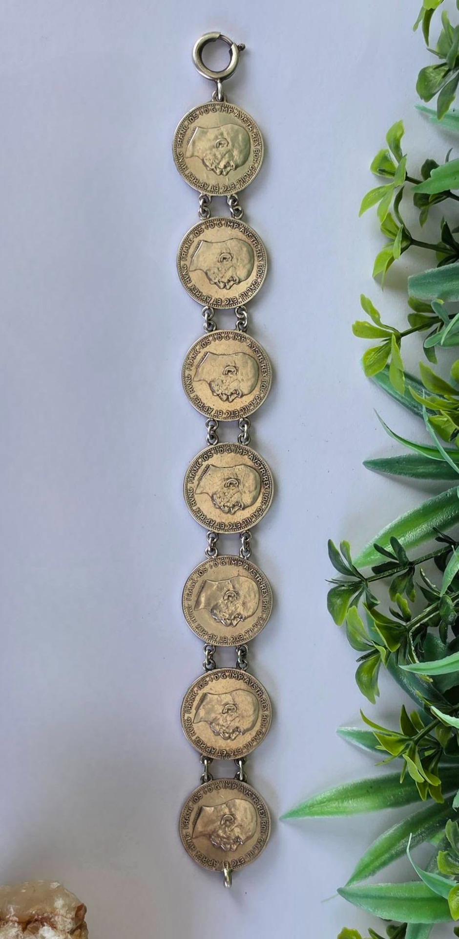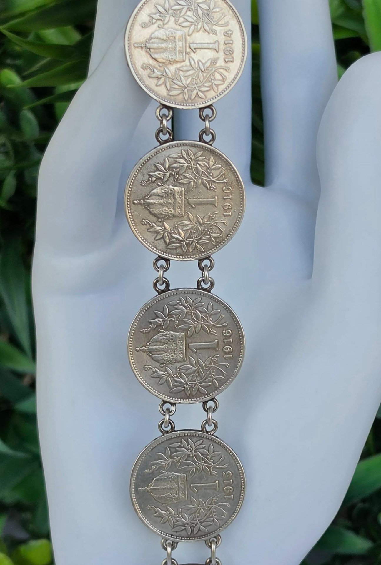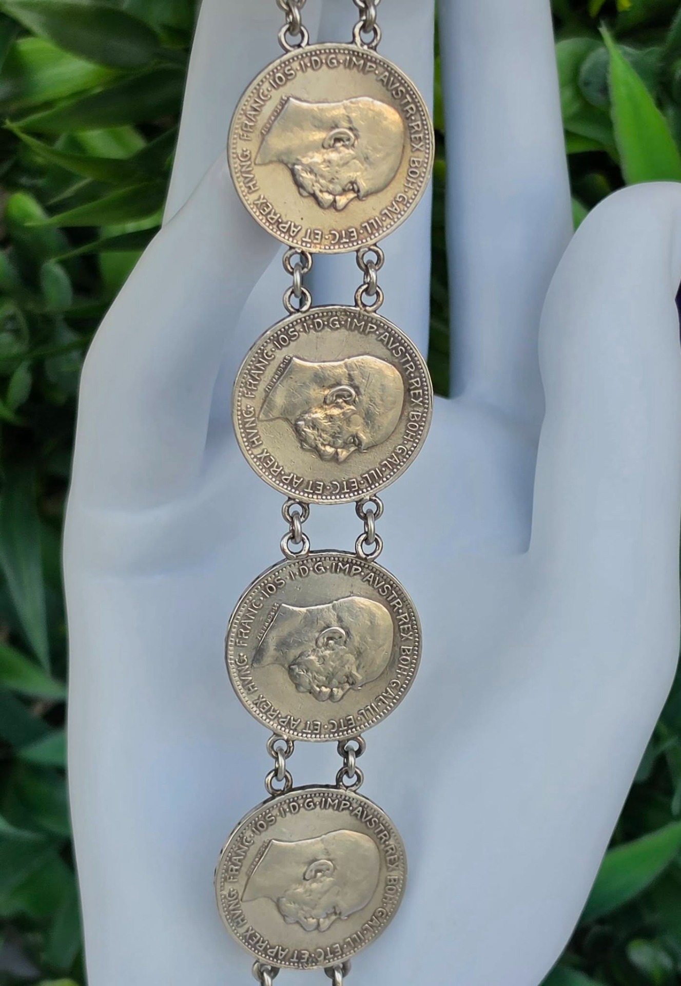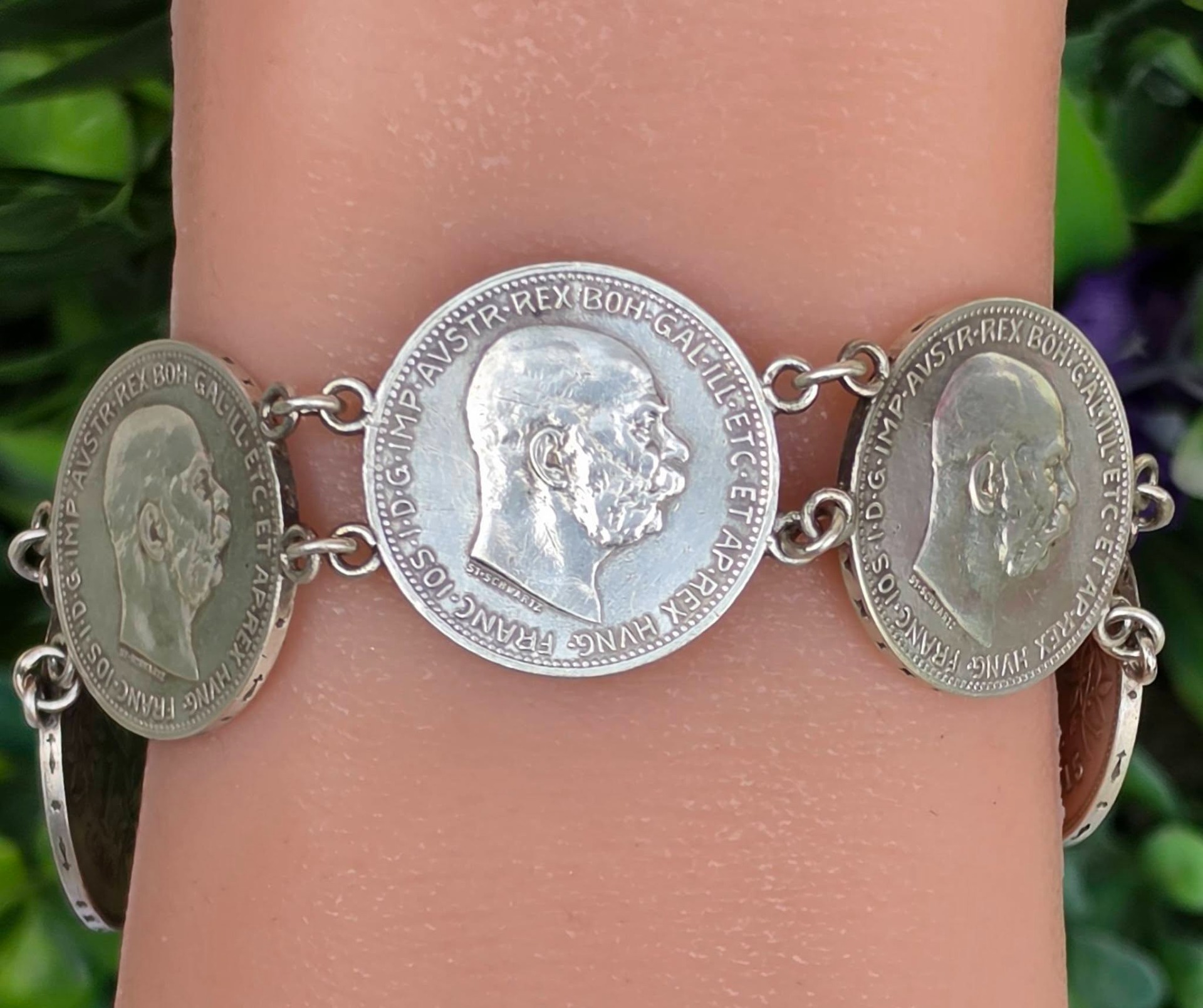Brățară veche impresionantă, din argint, de colecție, cu 7 monede de o coroană din perioada Imperiului Austro-Ungar, monede cu mare însemnătate istorică, fiind bătute în anii 1914, 1915 și 1916, perioada de început a Primului Război Mondial, cu chipul împăratului Franz Joseph I, și printre ultimele apărute în Imperiu, ținând cont că acesta s-a dizolvat în anul 1918.