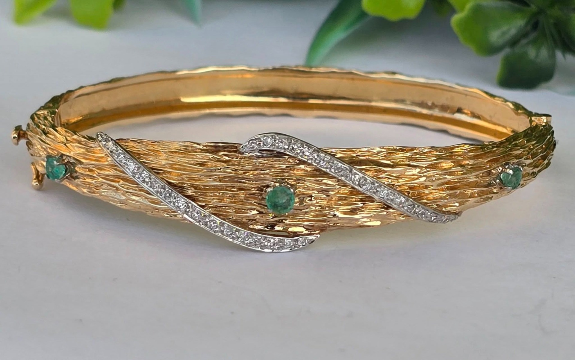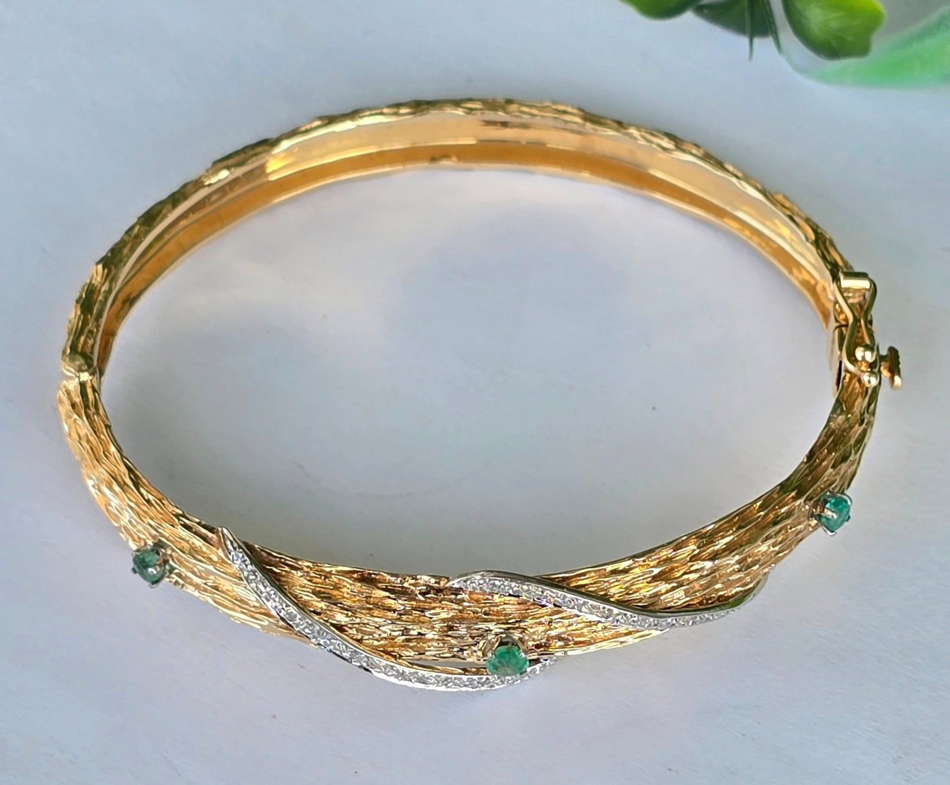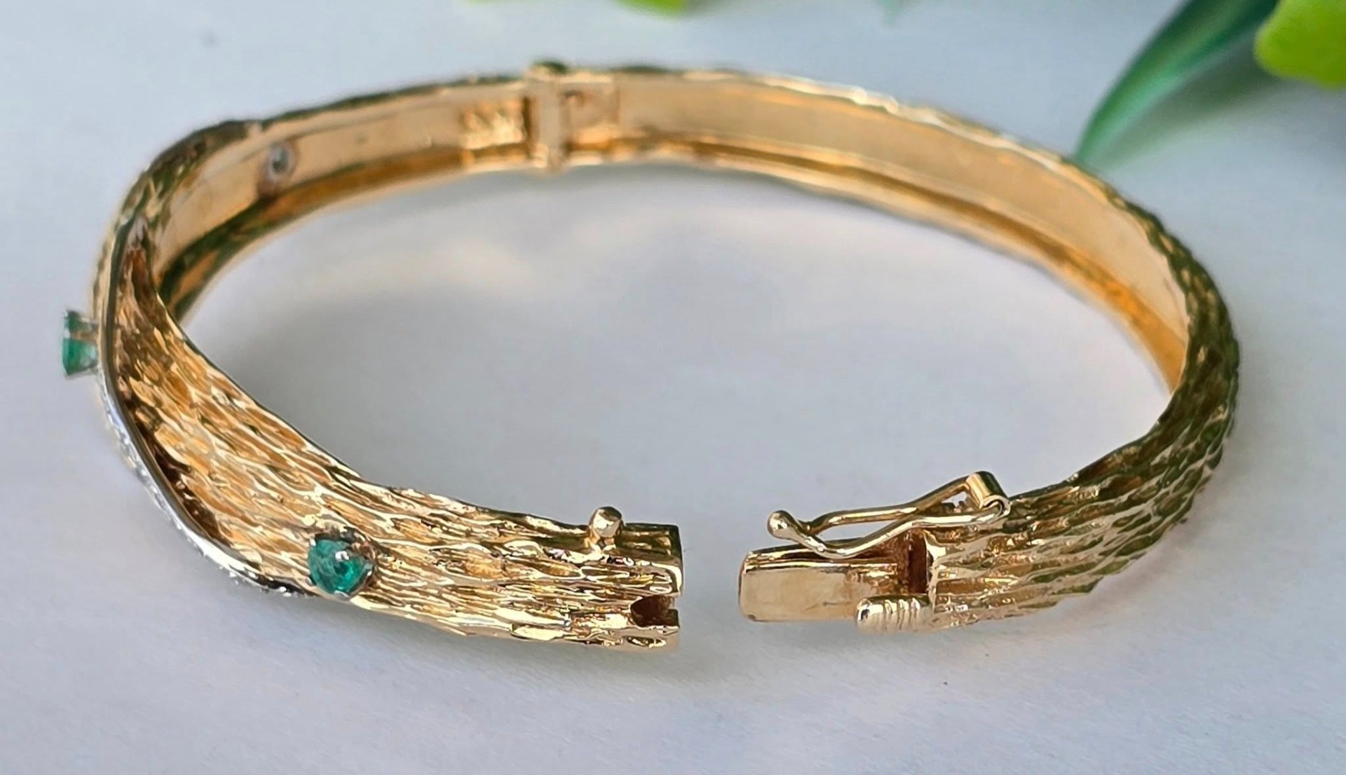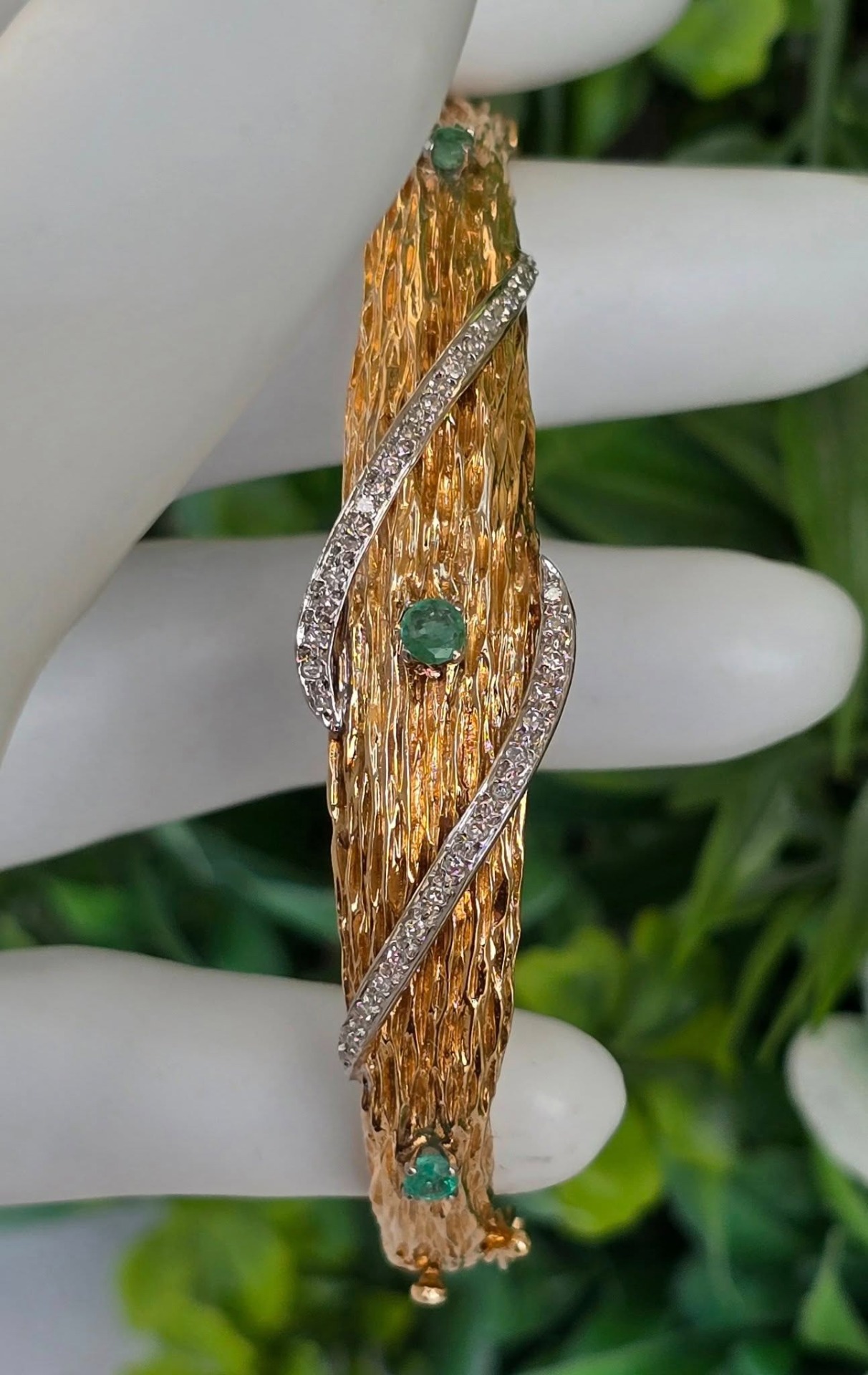 Brățară veche impresionantă, texturată, din aur de 14K, cu 32 diamante și 3 smaralde naturale, manufactură deosebită.