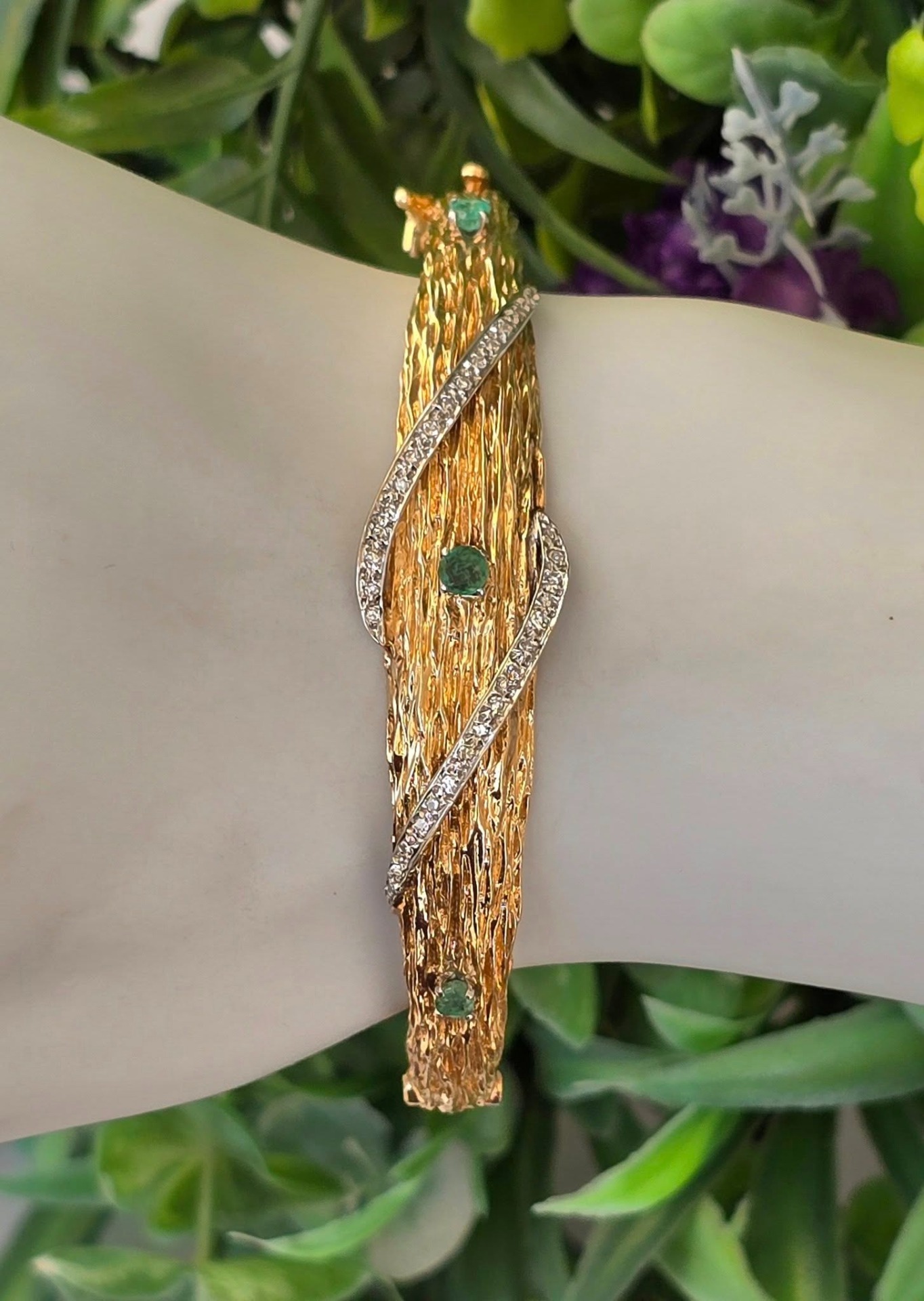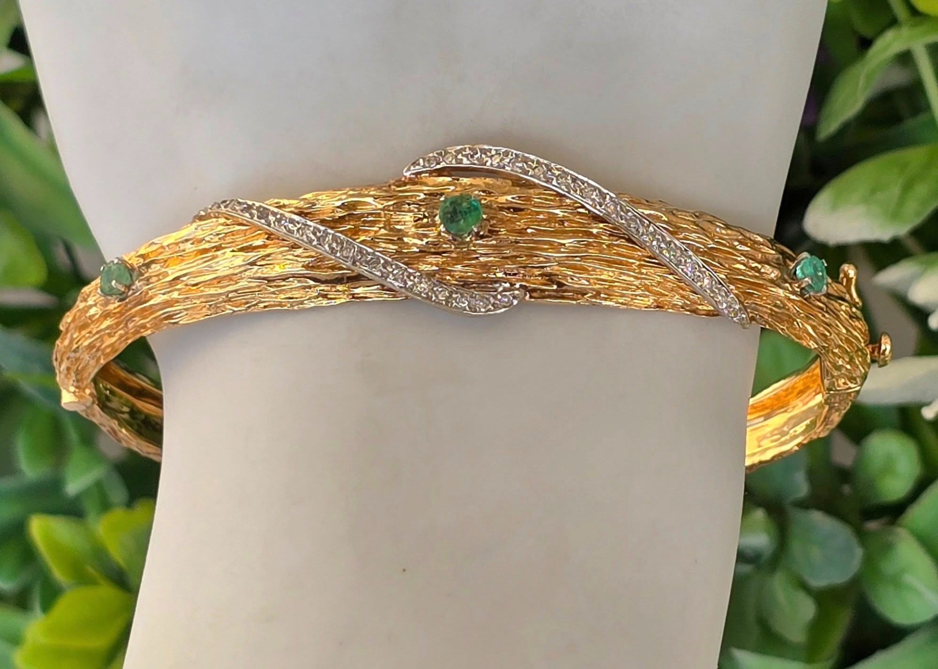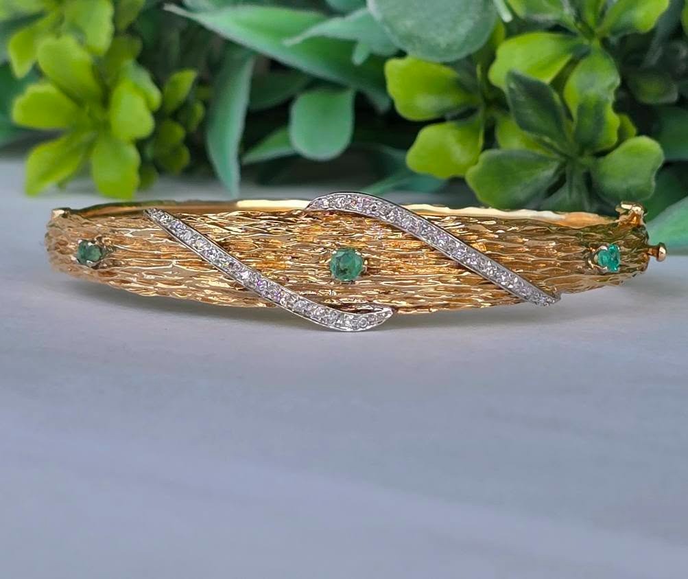 Brățară veche impresionantă, texturată, din aur de 14K, cu 32 diamante și 3 smaralde naturale, manufactură deosebită.