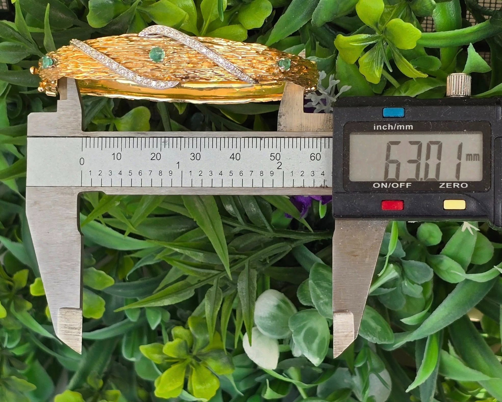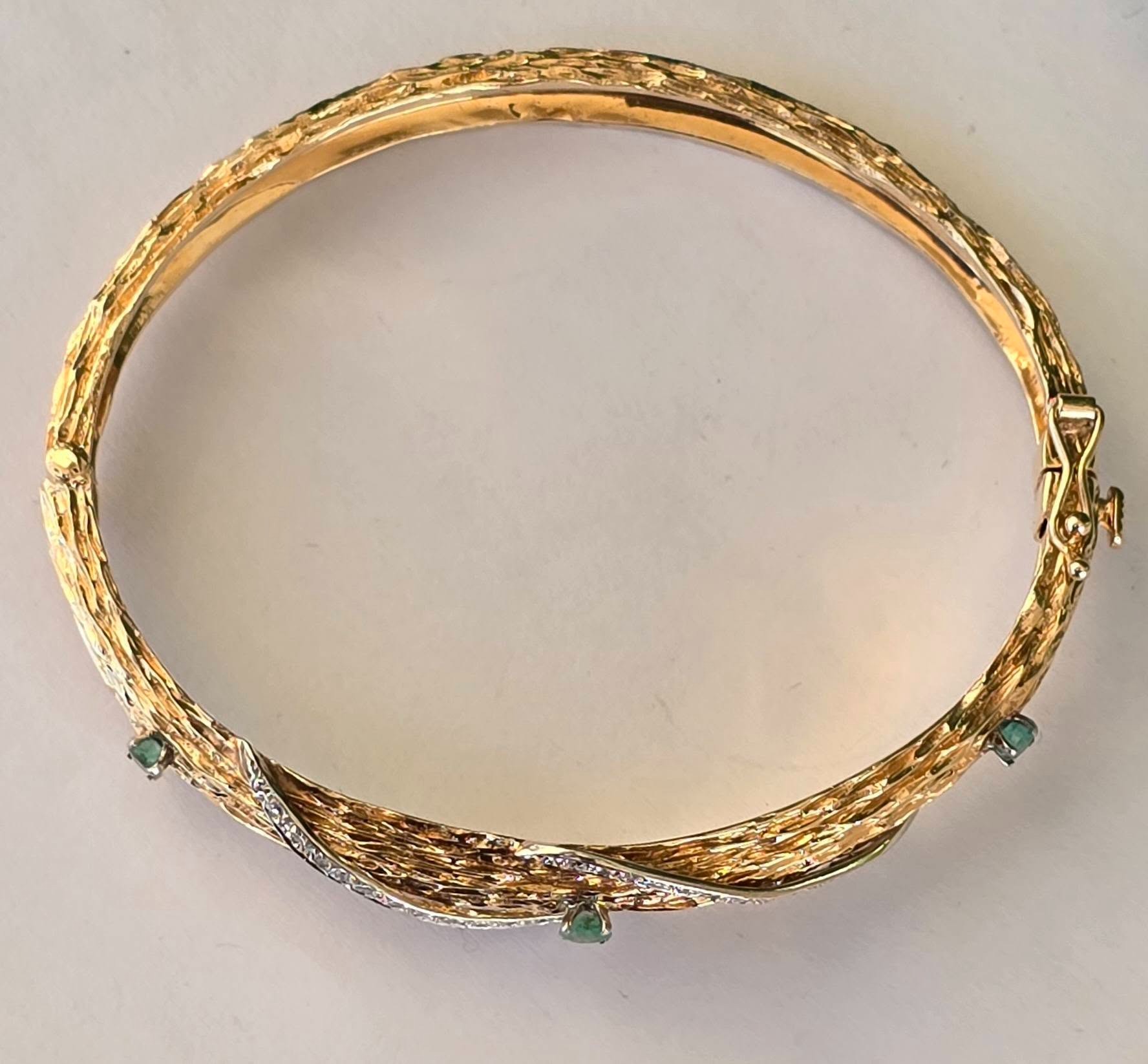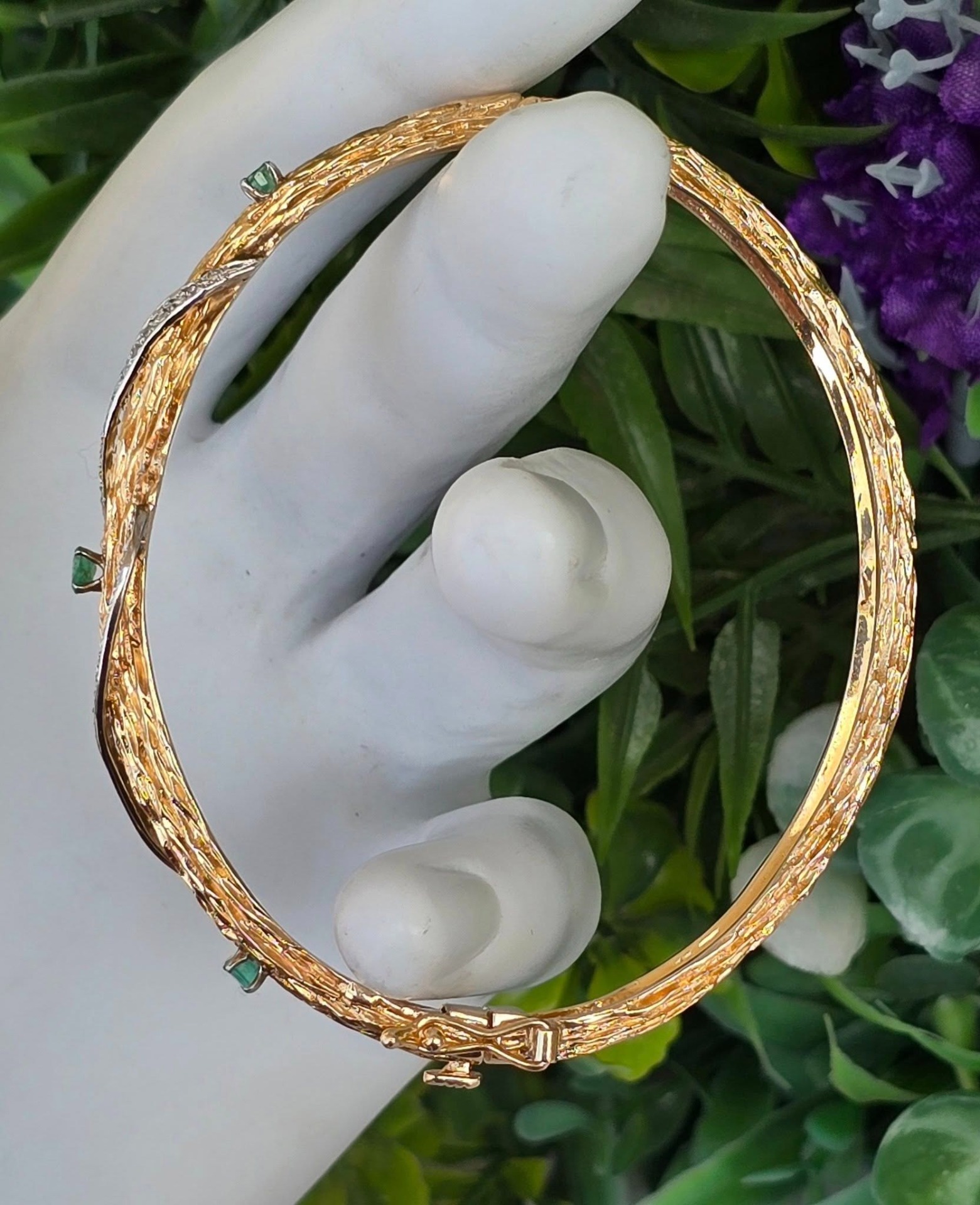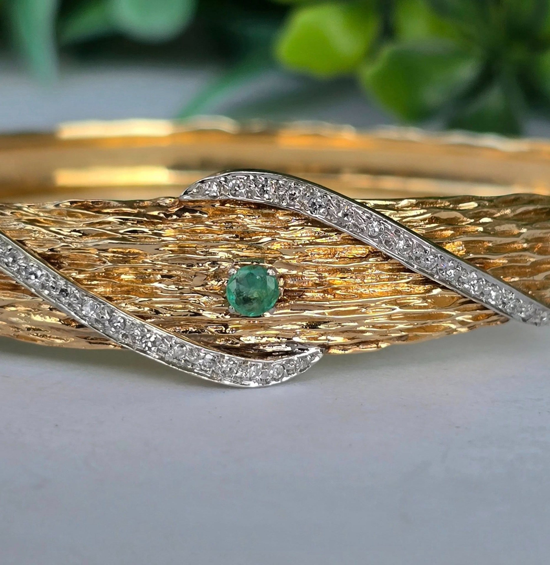 Brățară veche impresionantă, texturată, din aur de 14K, cu 32 diamante și 3 smaralde naturale, manufactură deosebită.