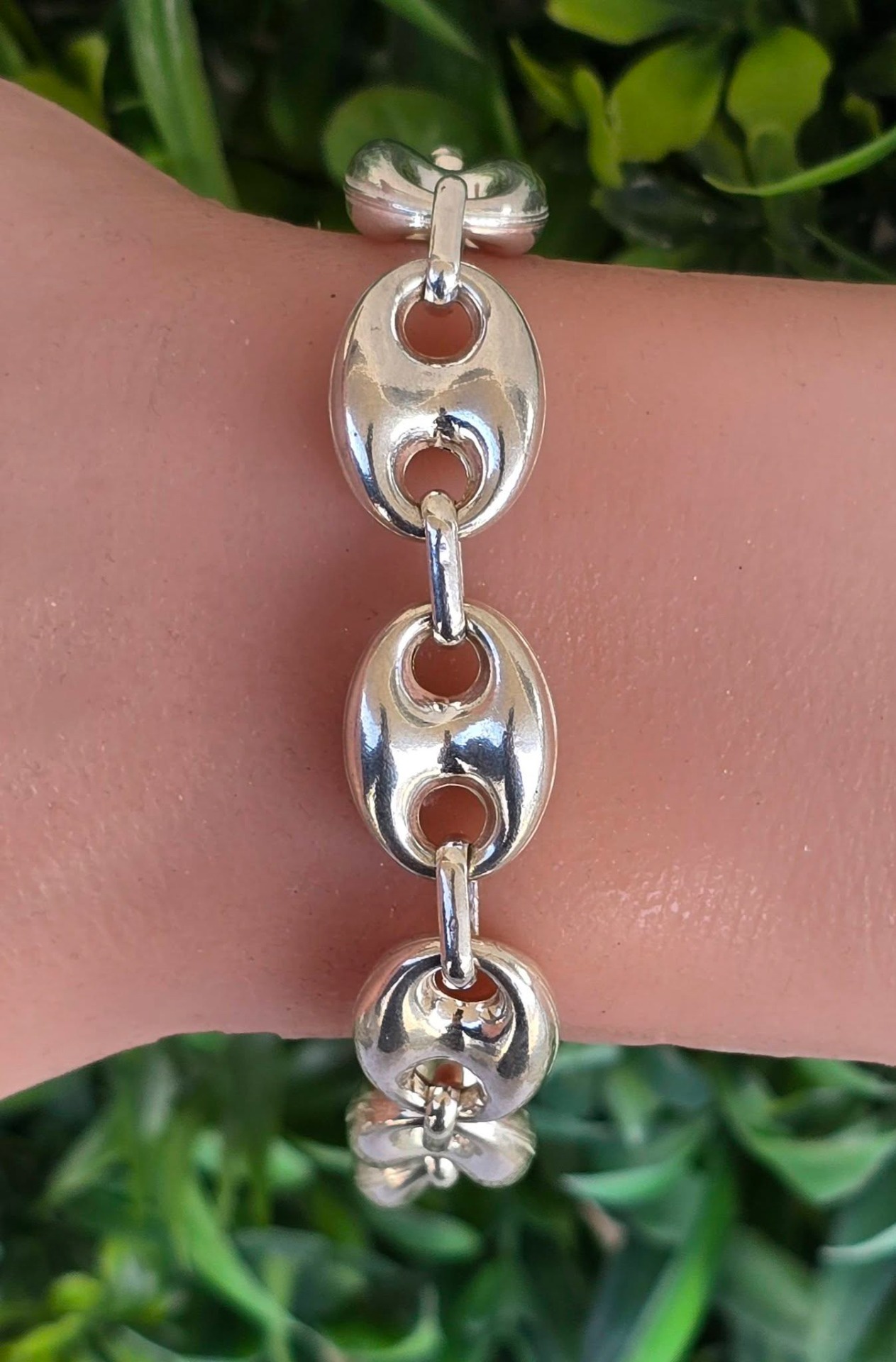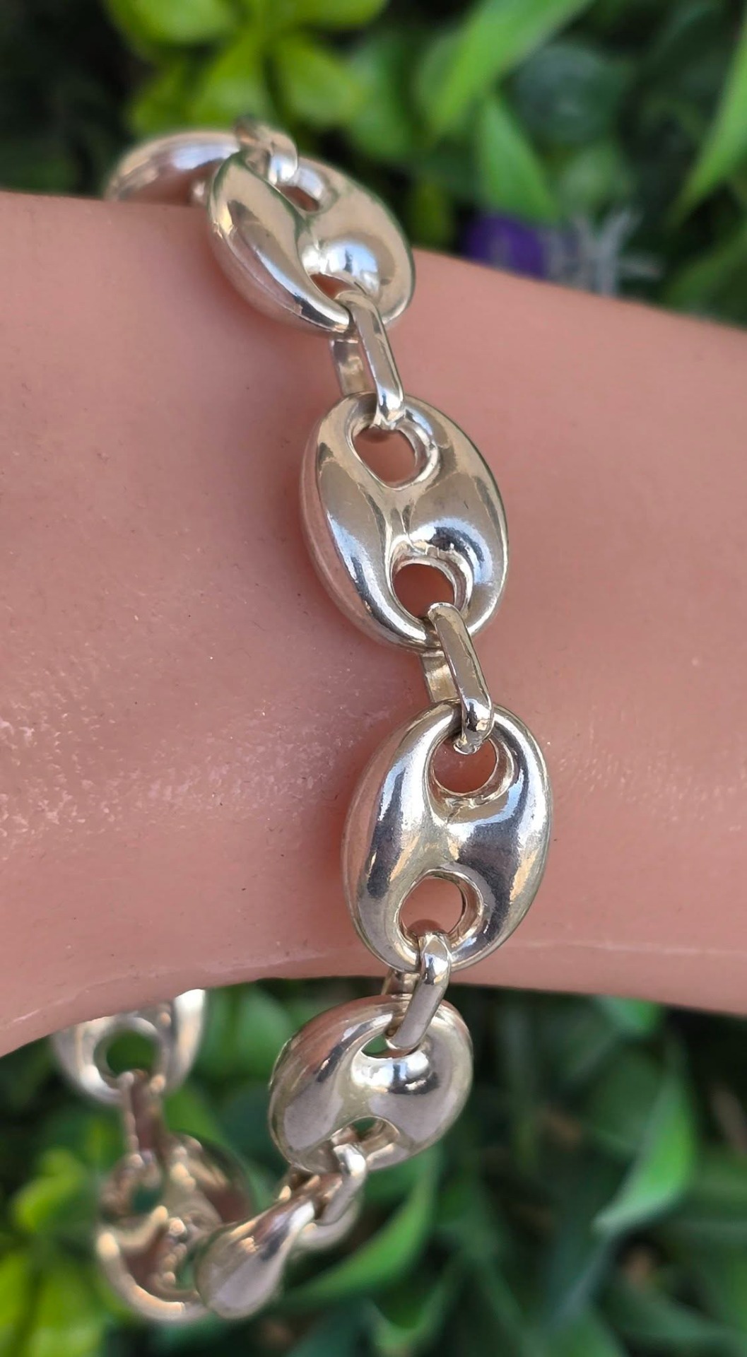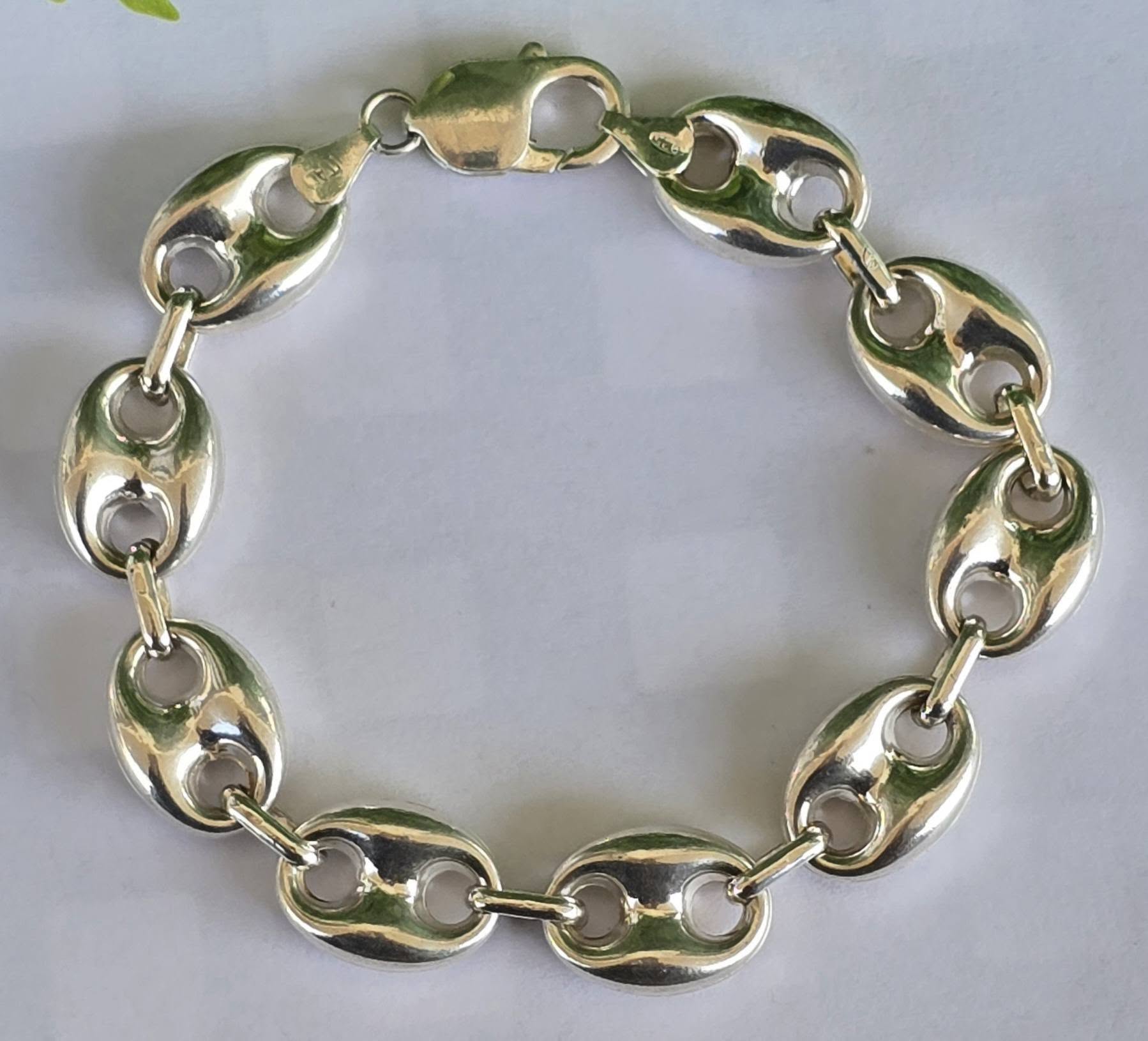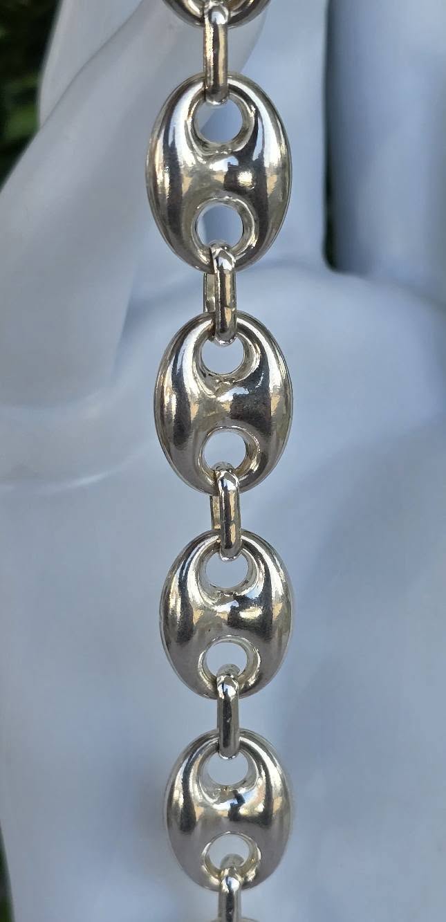 Brățară veche spectaculoasă, din argint, manufactură cunoscută ca "Gucci link", cu verigi "puff coffee beans" (boabe de cafea bombate) goale pe interior, aspect ce-i oferă un volum generos și luxos fără a fi foarte grea.