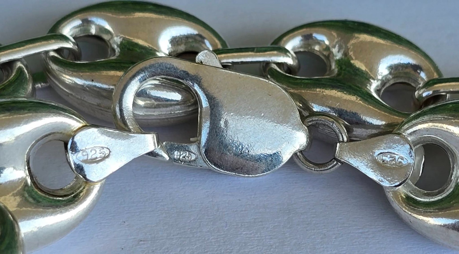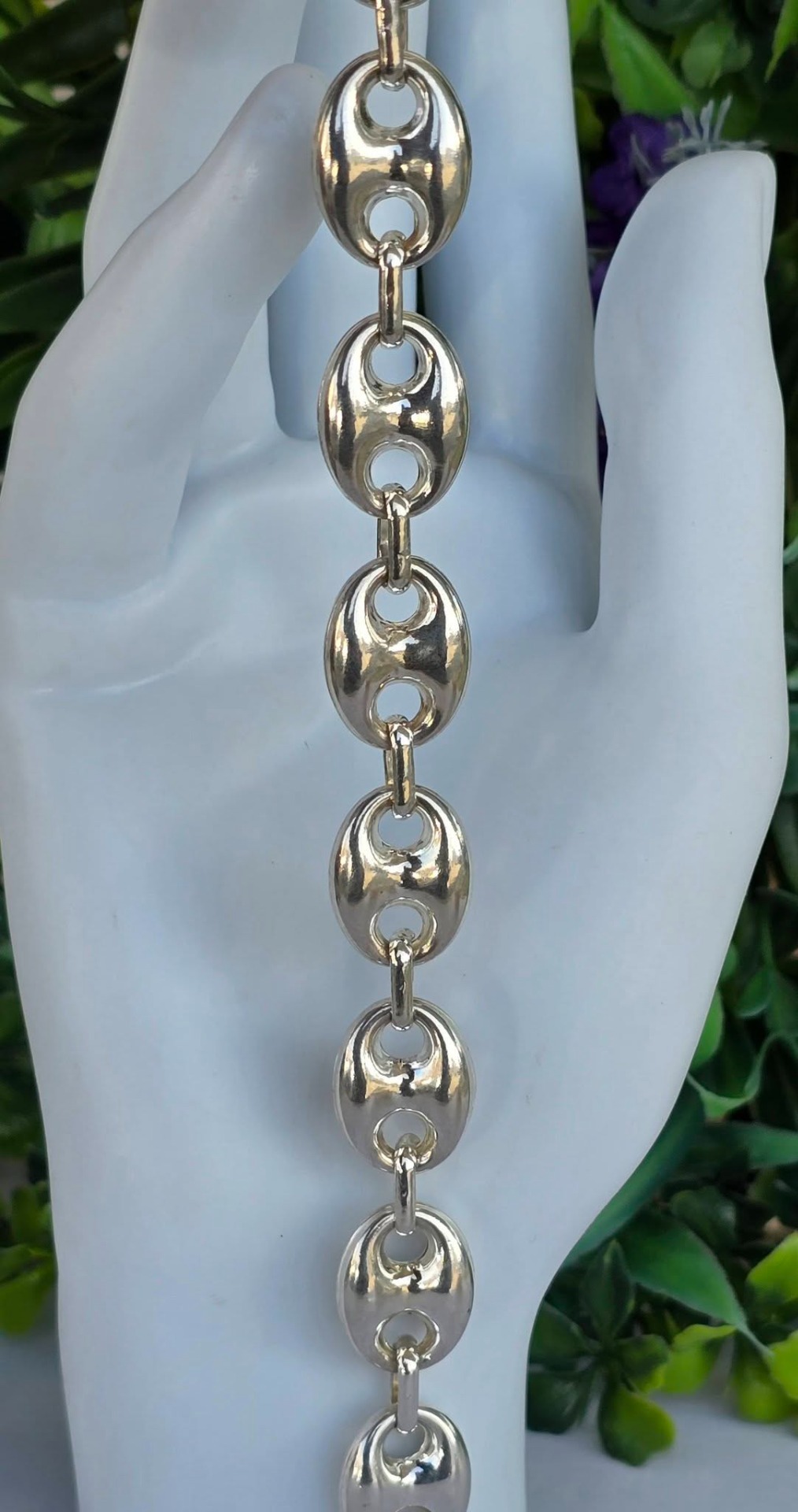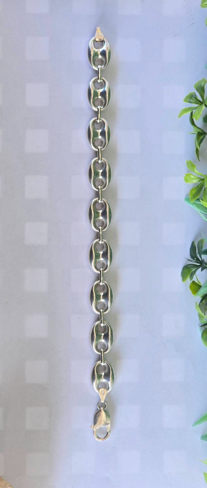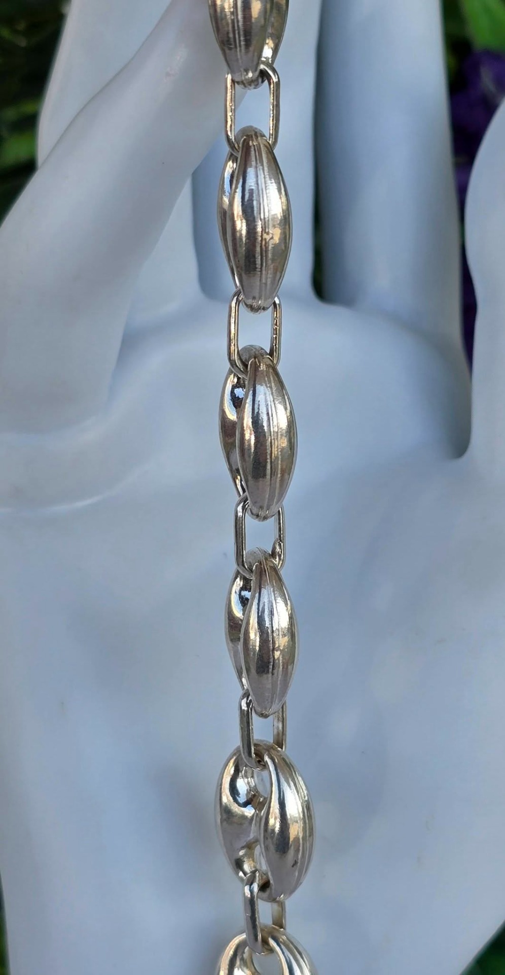 Brățară veche spectaculoasă, din argint, manufactură cunoscută ca "Gucci link", cu verigi "puff coffee beans" (boabe de cafea bombate) goale pe interior, aspect ce-i oferă un volum generos și luxos fără a fi foarte grea.