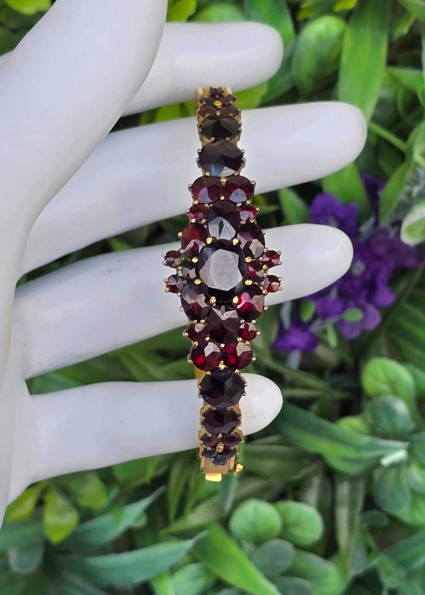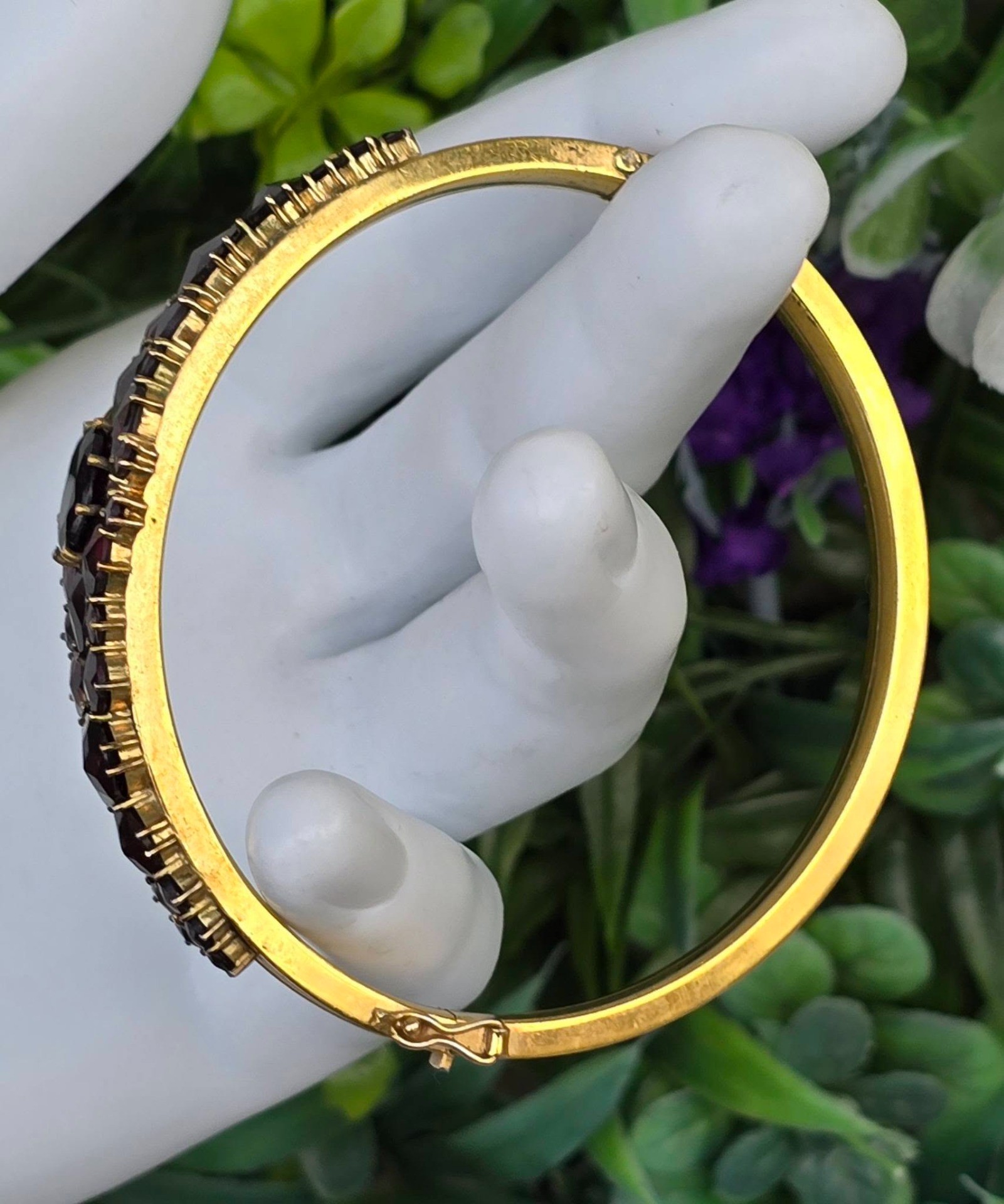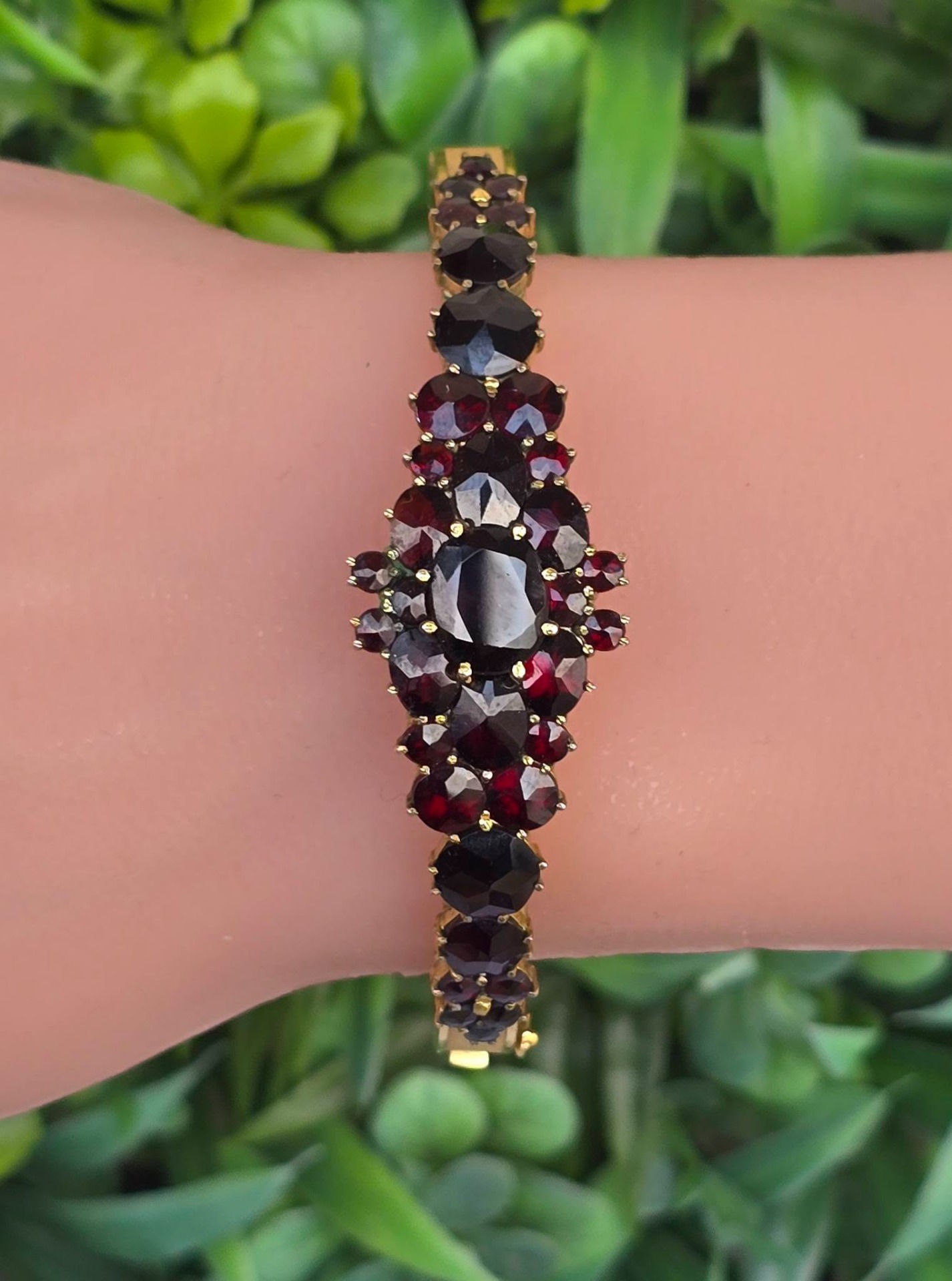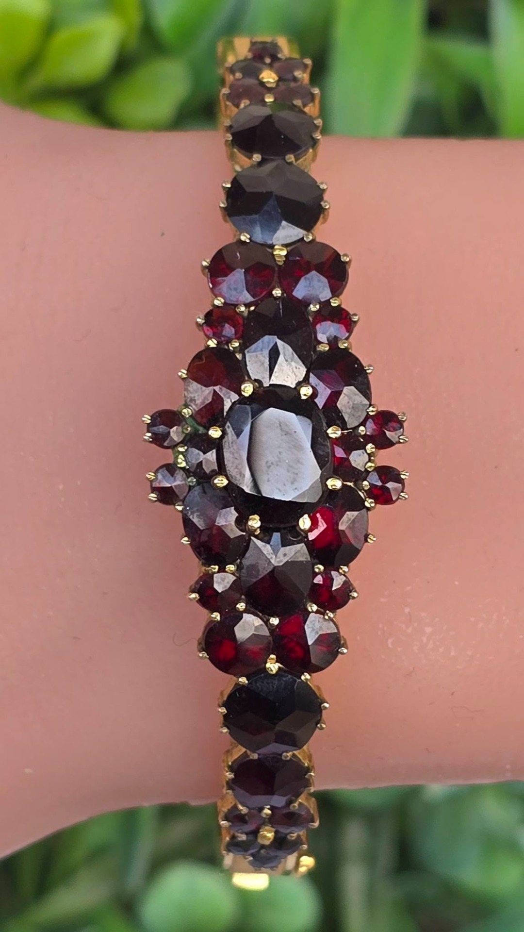 Brățară veche superbă, de colecție, din metal dublu aurit ("AMERIKANER=gold doible"), cu 35 granate Bohemia naturale, manufactură Andreas Daub, faimoasă casă de