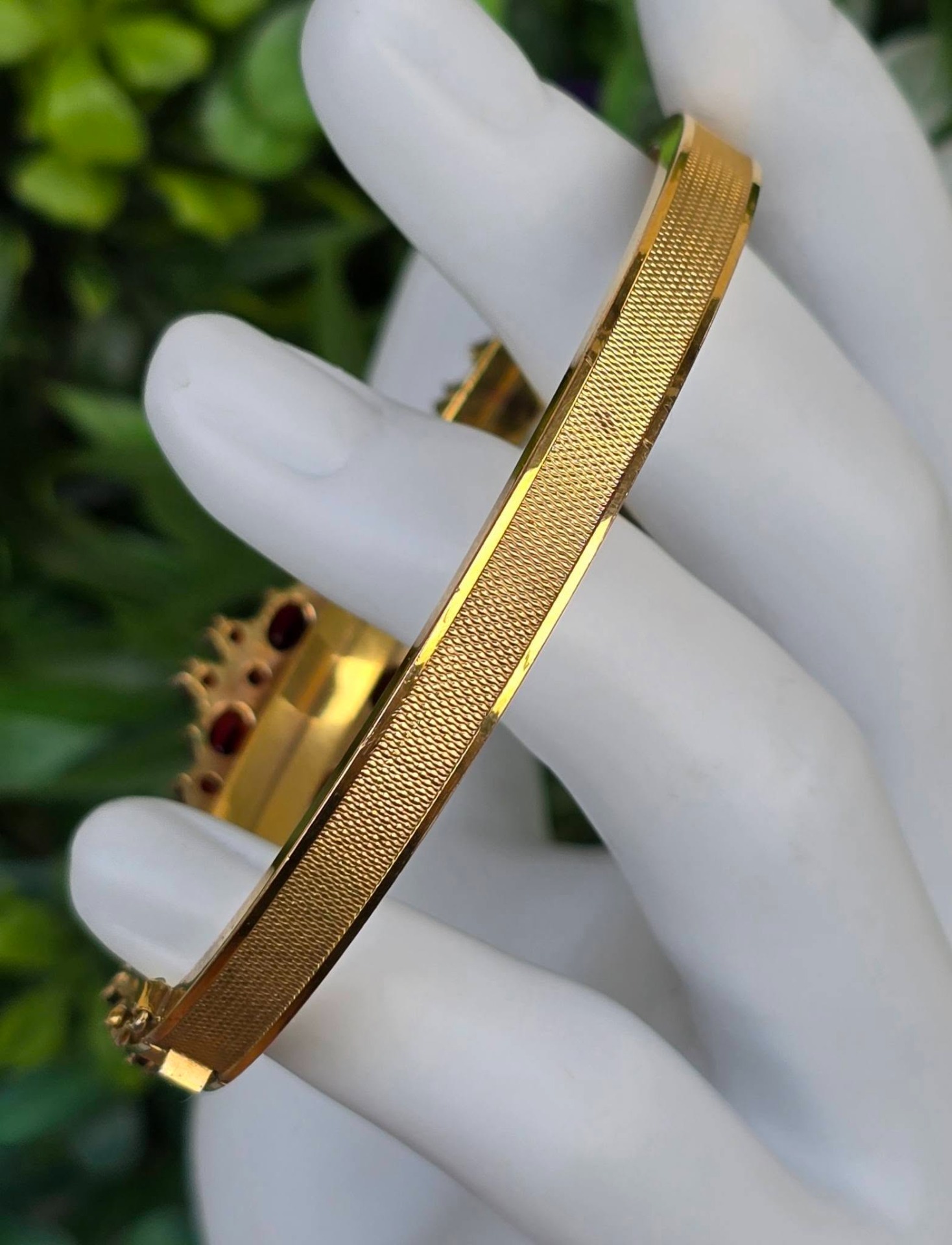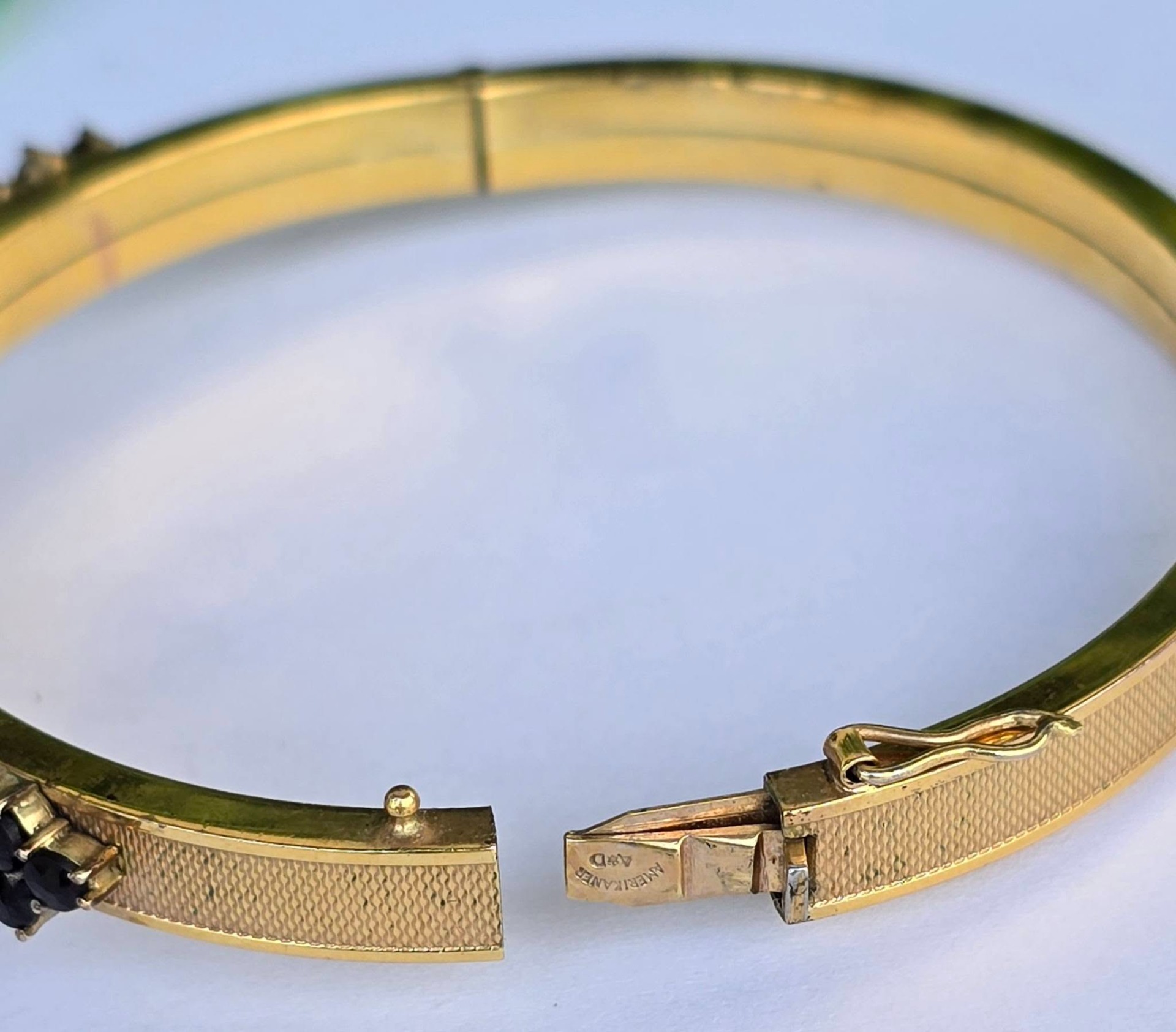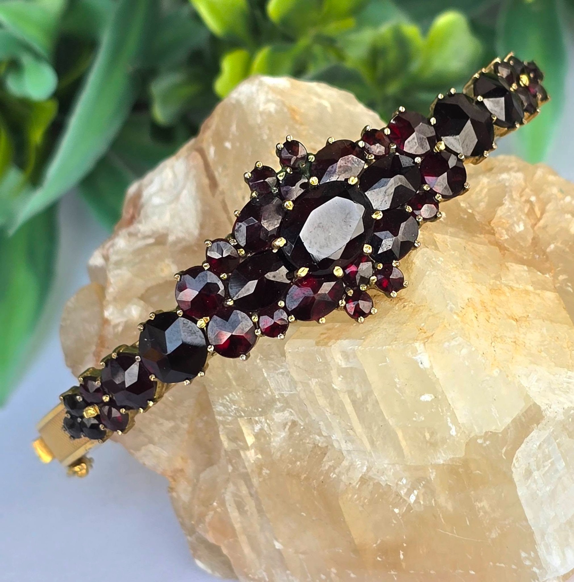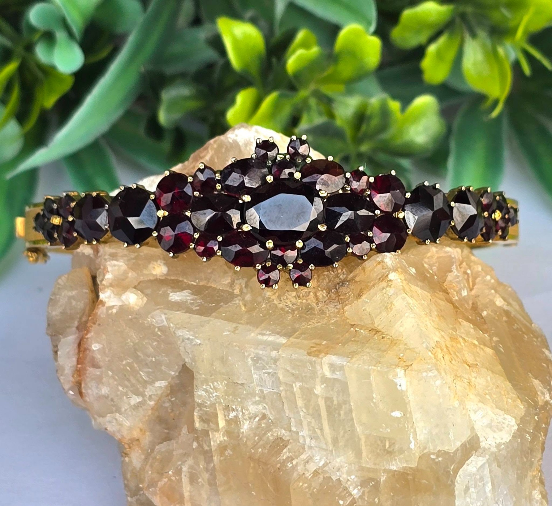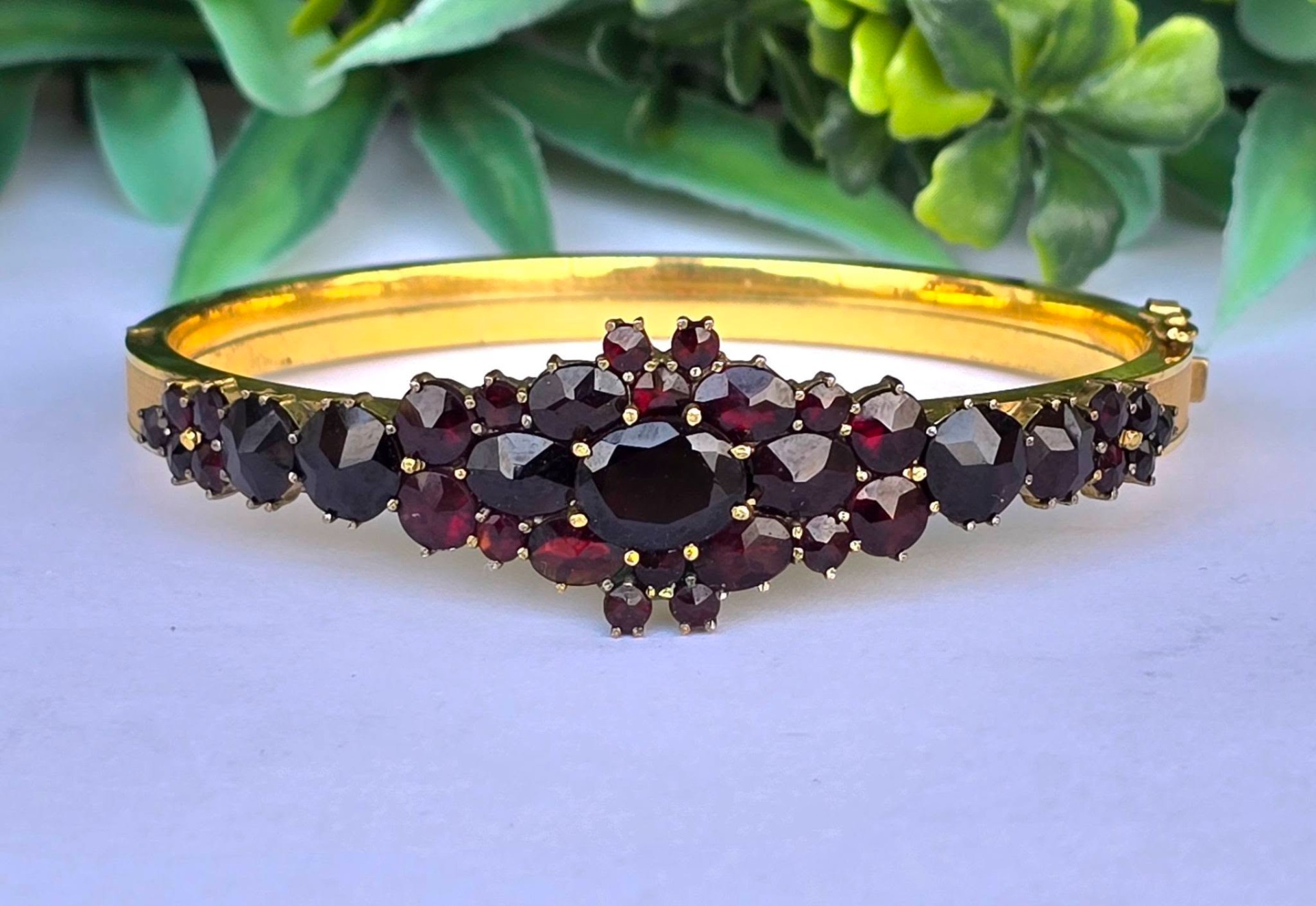 Brățară veche superbă, de colecție, din metal dublu aurit ("AMERIKANER=gold doible"), cu 35 granate Bohemia naturale, manufactură Andreas Daub, faimoasă casă de