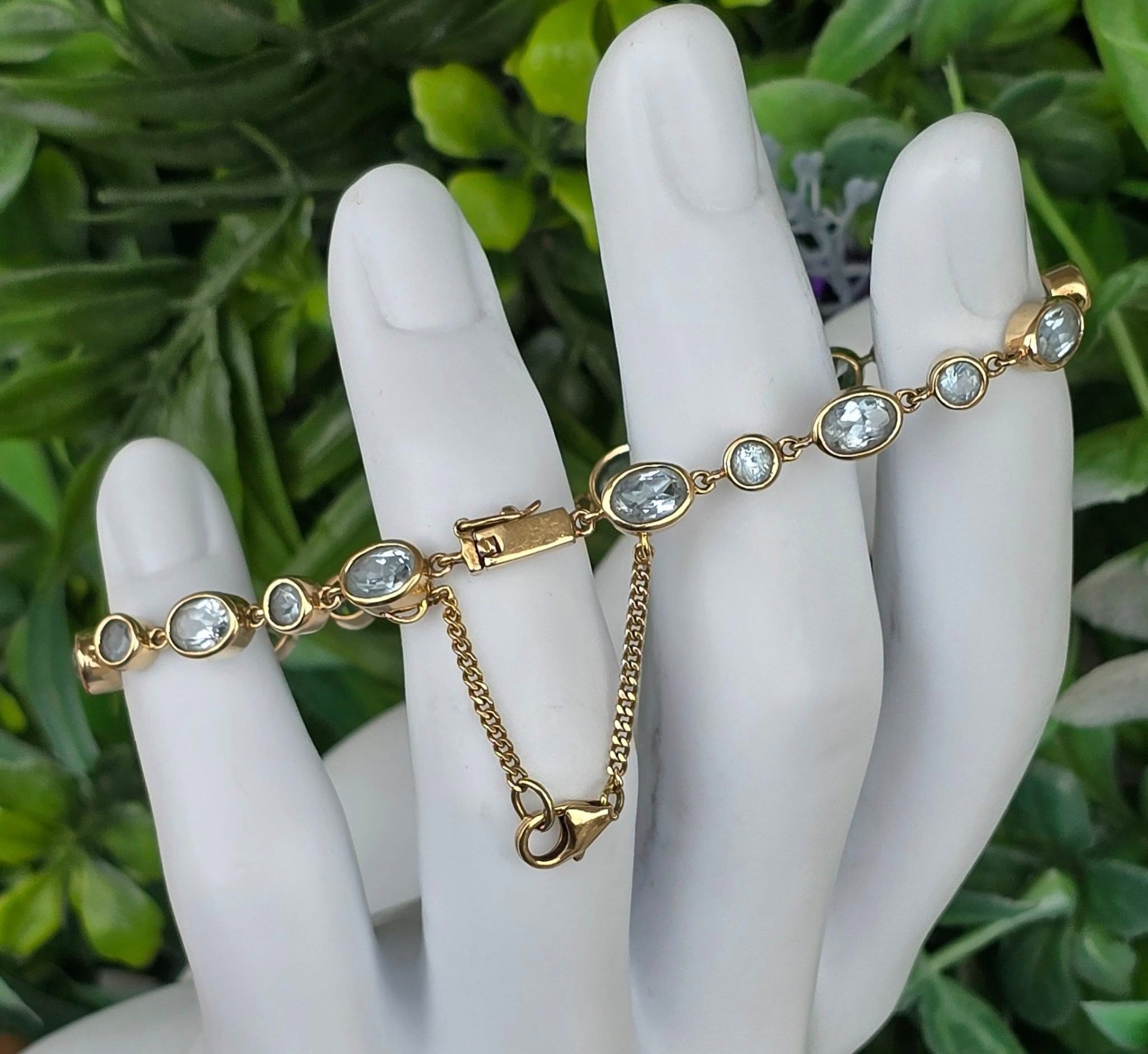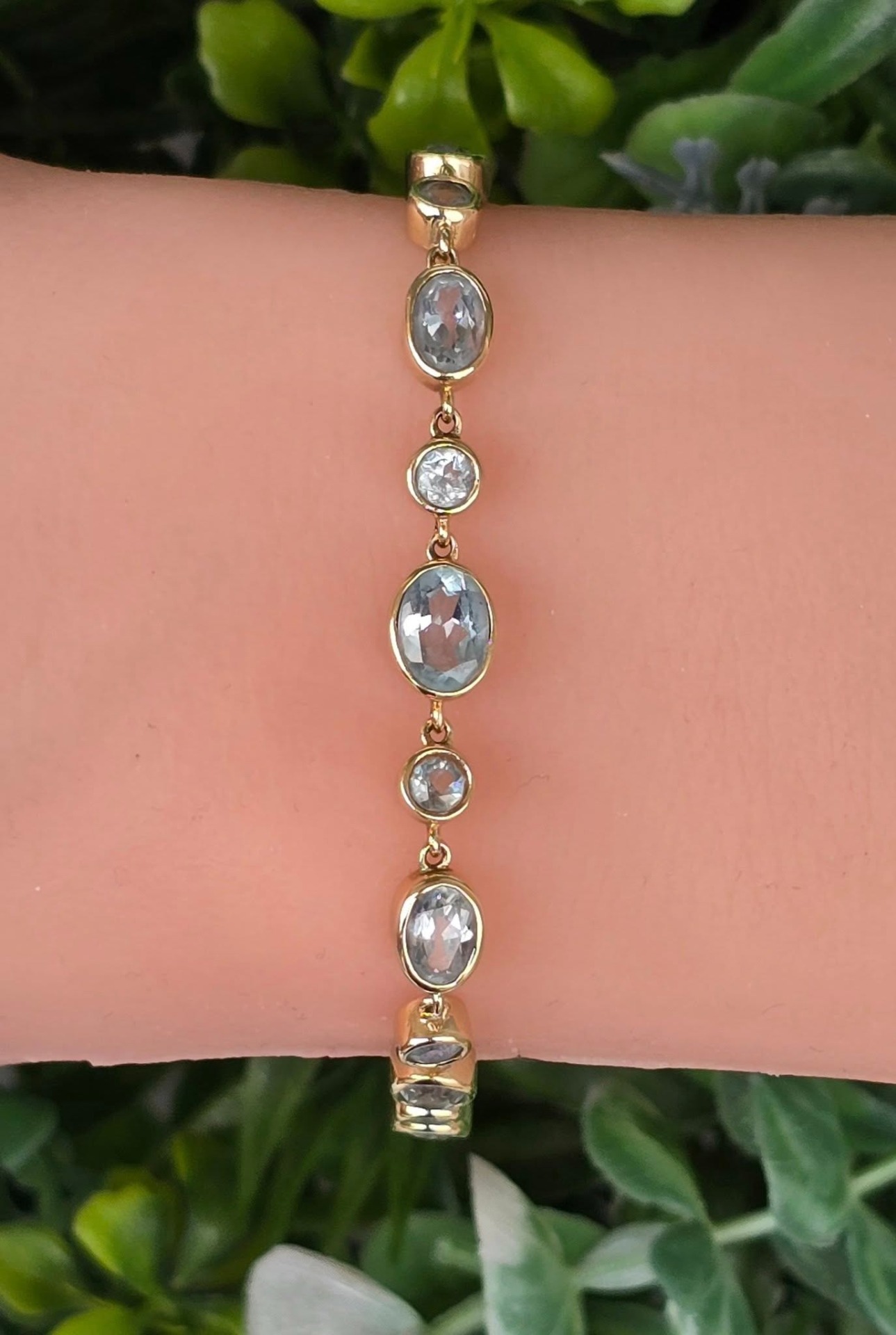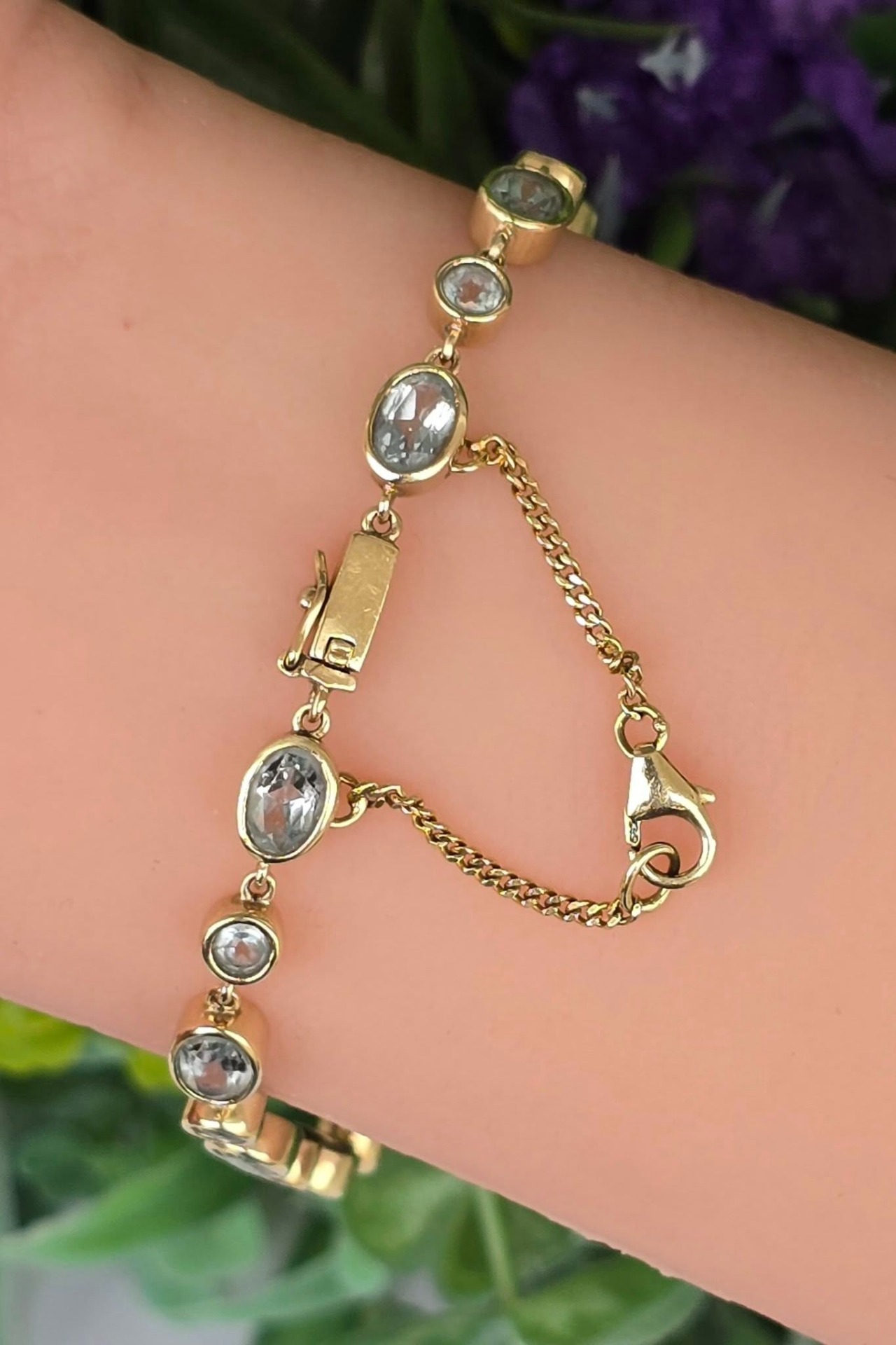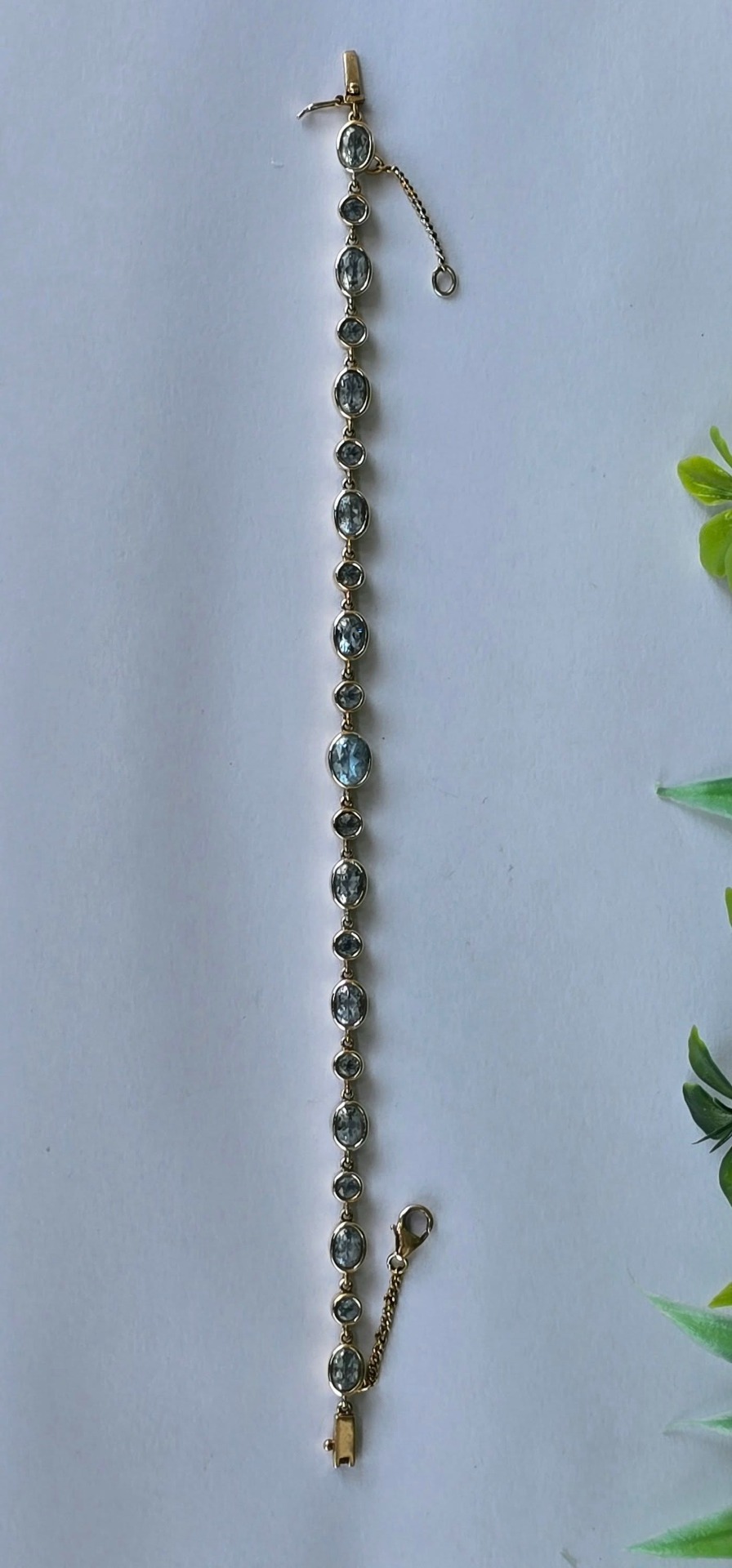 Brățară veche superbă, din aur de 9K, cu 21 topaze "sky blue" naturale și lănțișor de siguranță din aur de 14K.