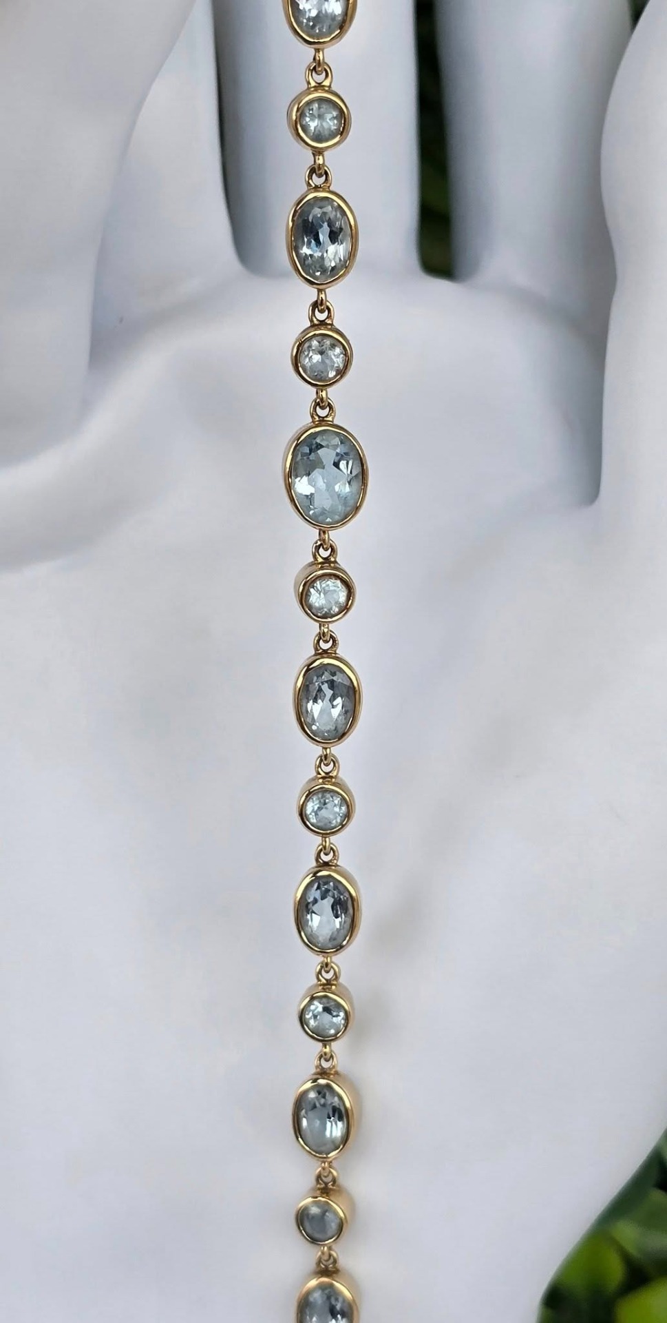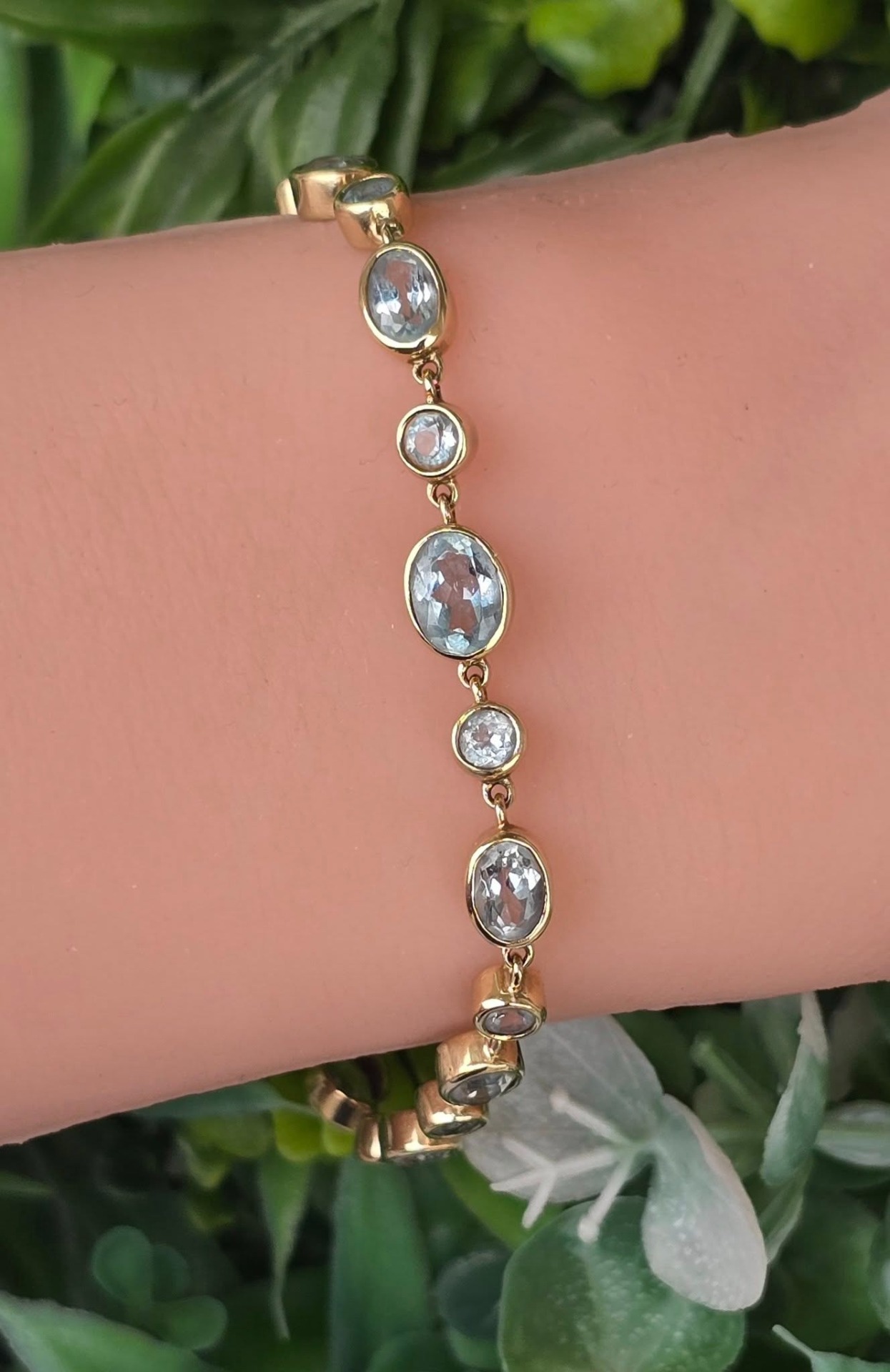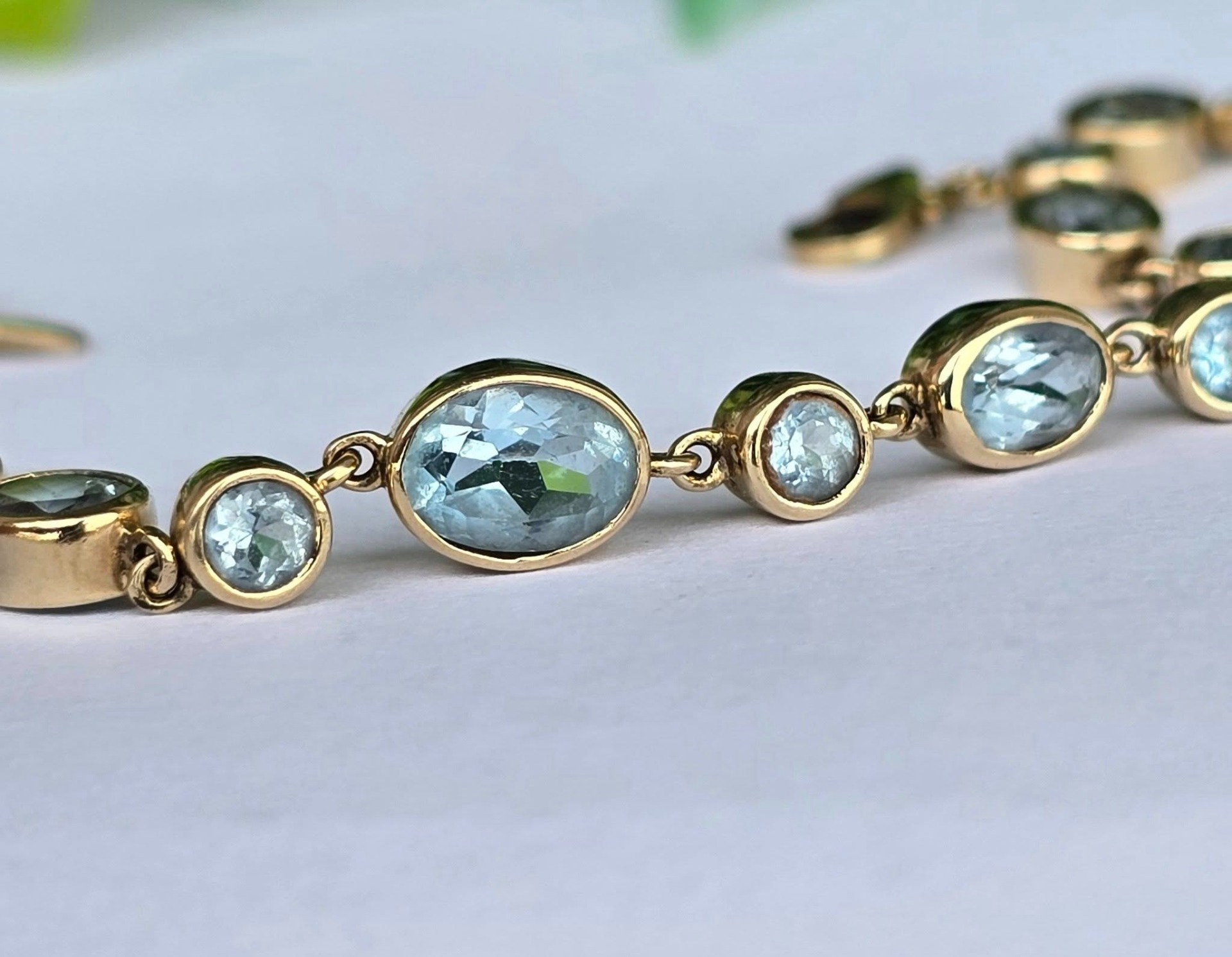 Brățară veche superbă, din aur de 9K, cu 21 topaze "sky blue" naturale și lănțișor de siguranță din aur de 14K.
