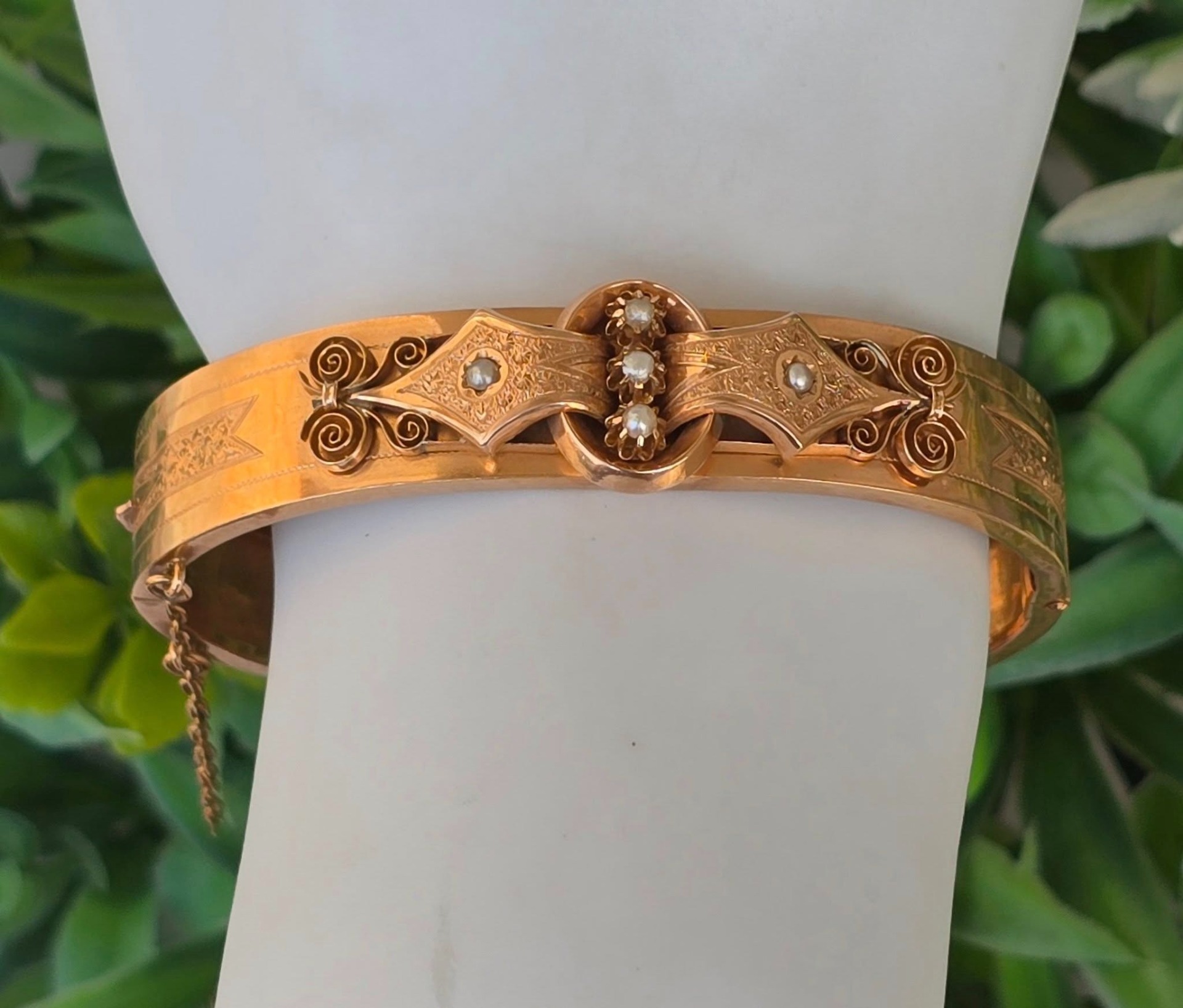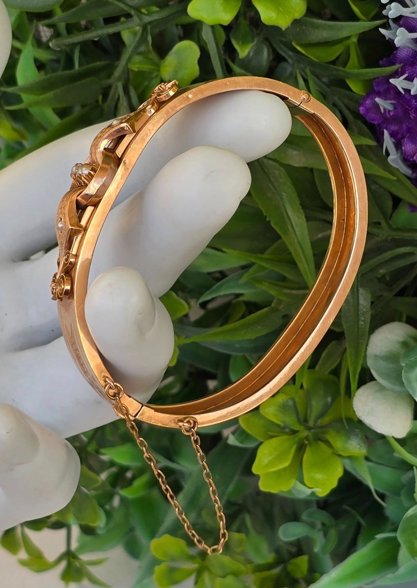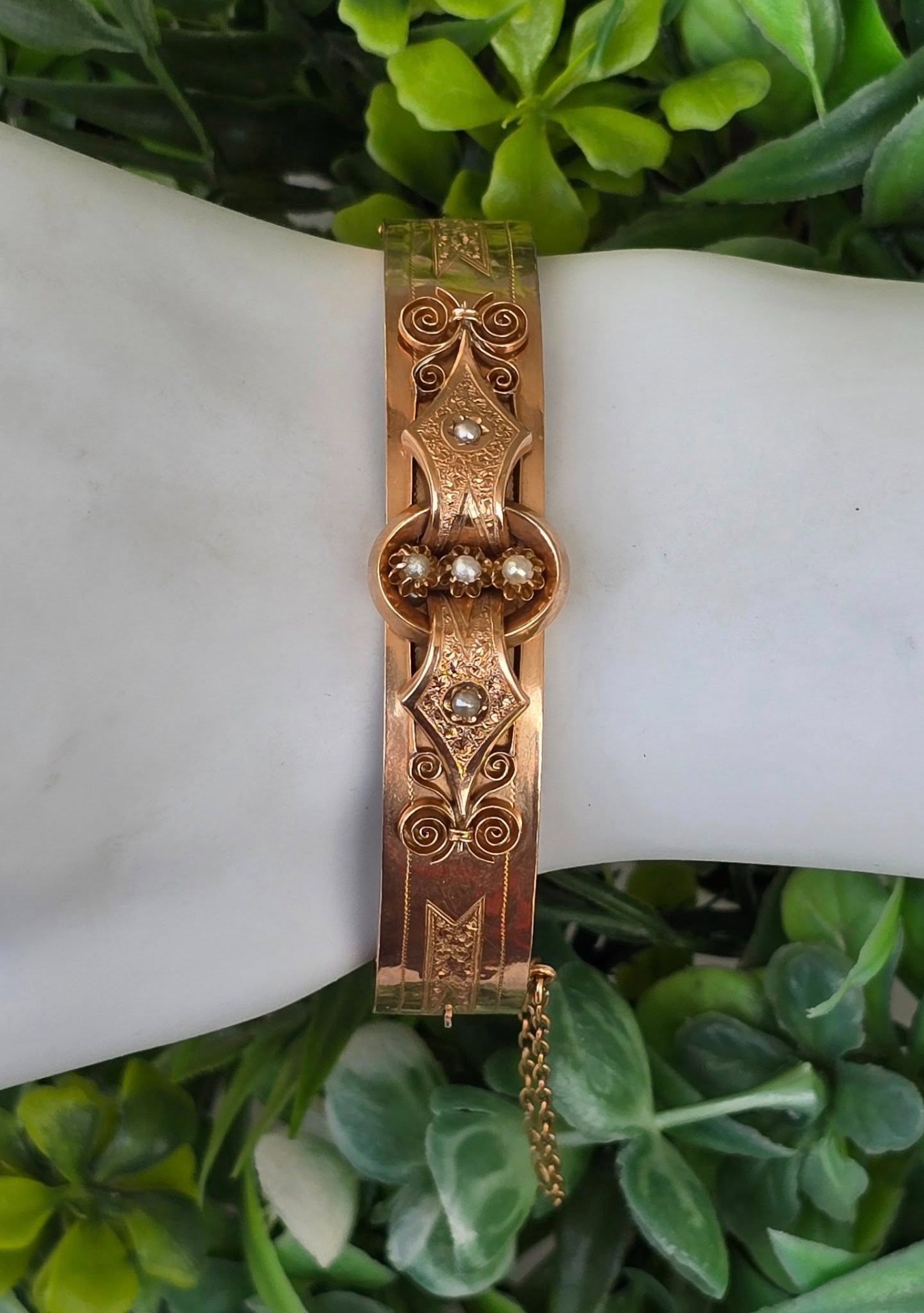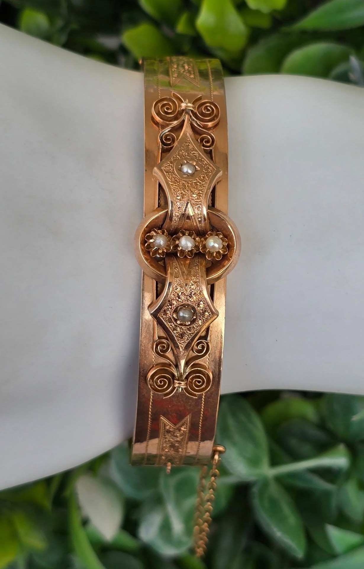 Brățară victoriană superbă, foarte rară, din aur de 14K, cu "seed pearls" naturale, manufactură de excepție caracteristică sfârșitului de secol XIX, foarte greu