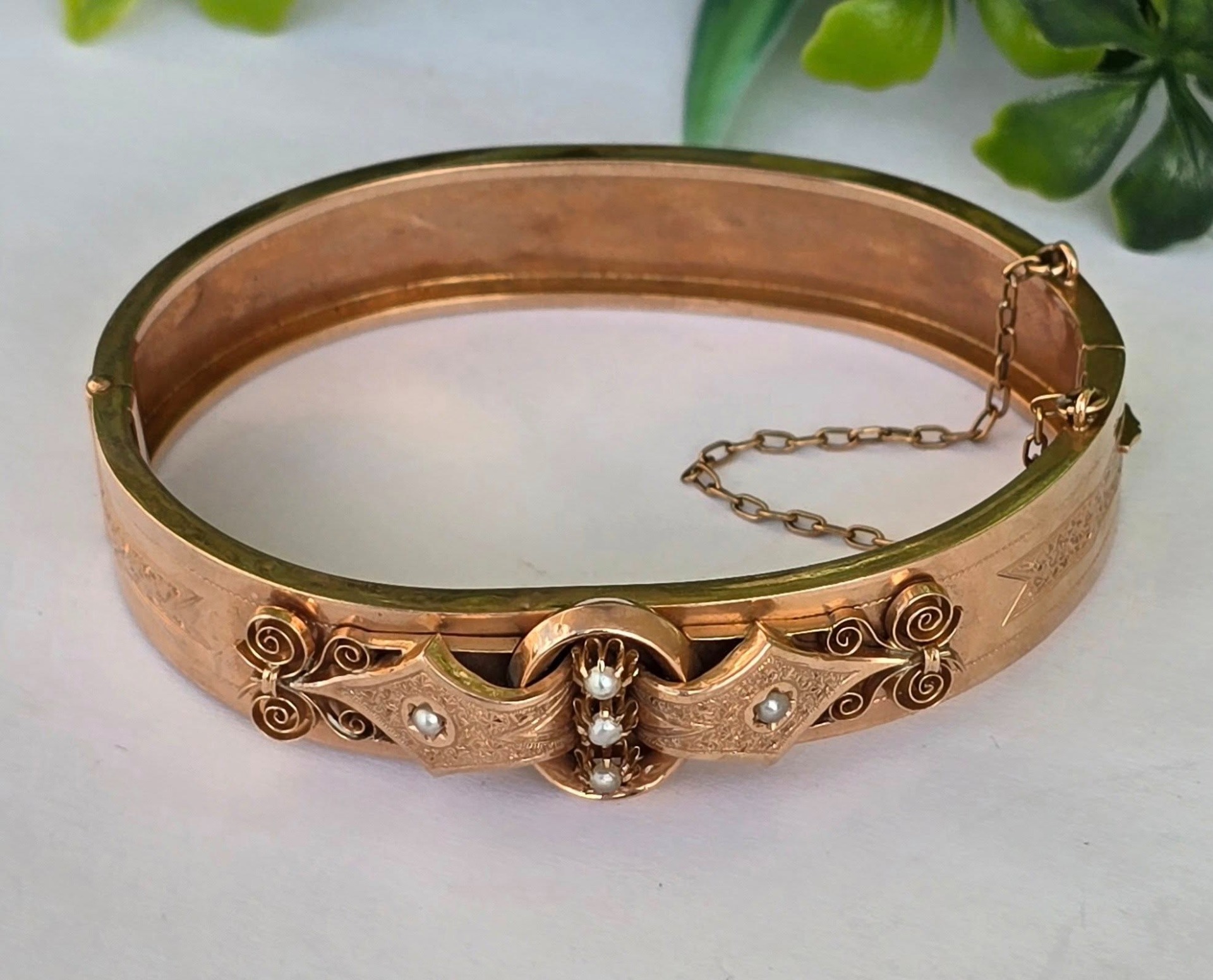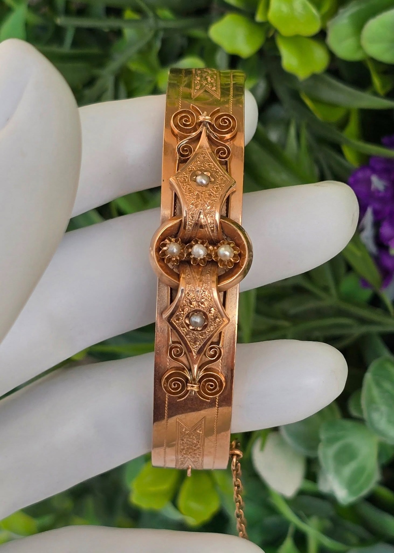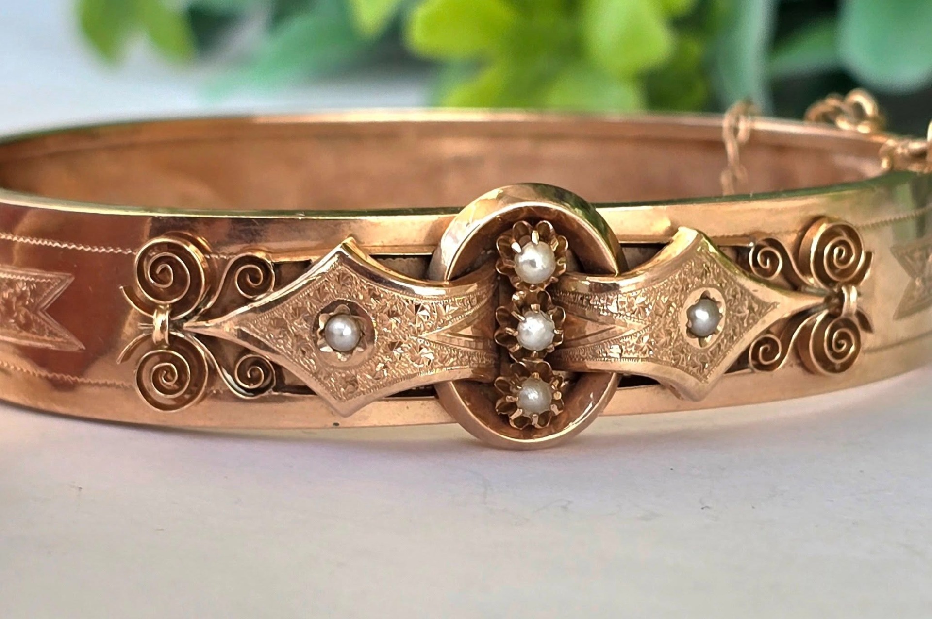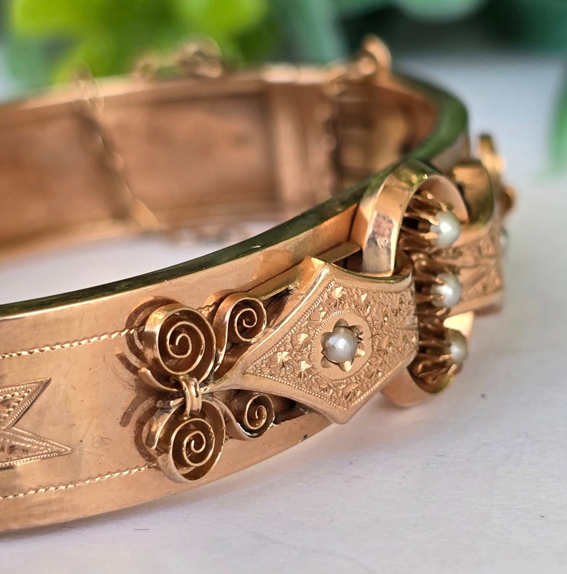 Brățară victoriană superbă, foarte rară, din aur de 14K, cu "seed pearls" naturale, manufactură de excepție caracteristică sfârșitului de secol XIX, foarte greu
