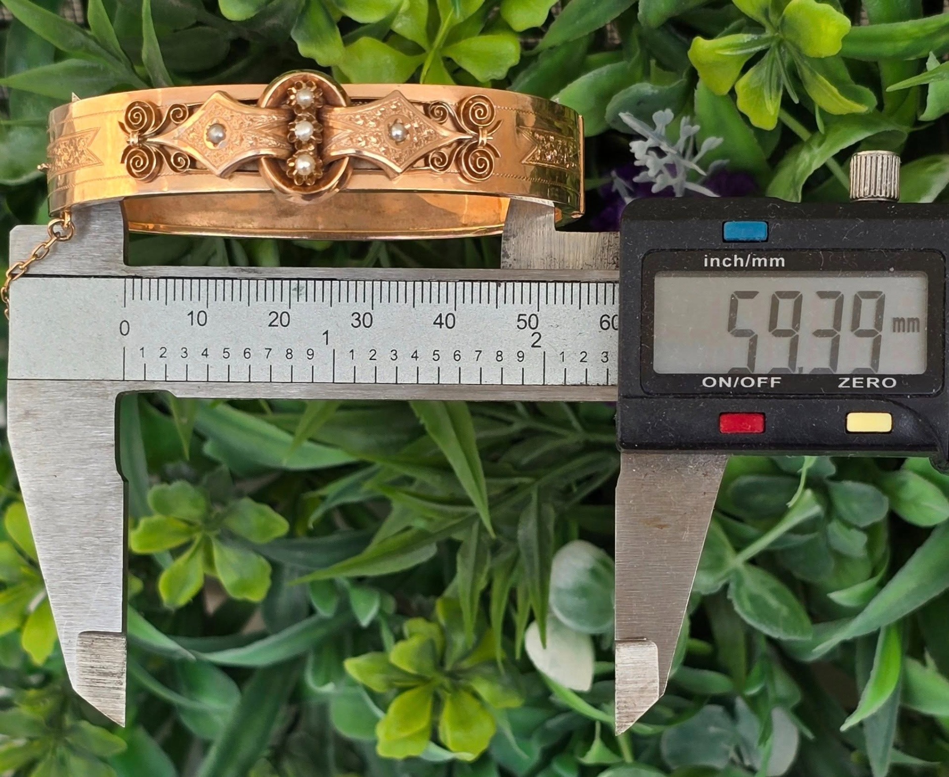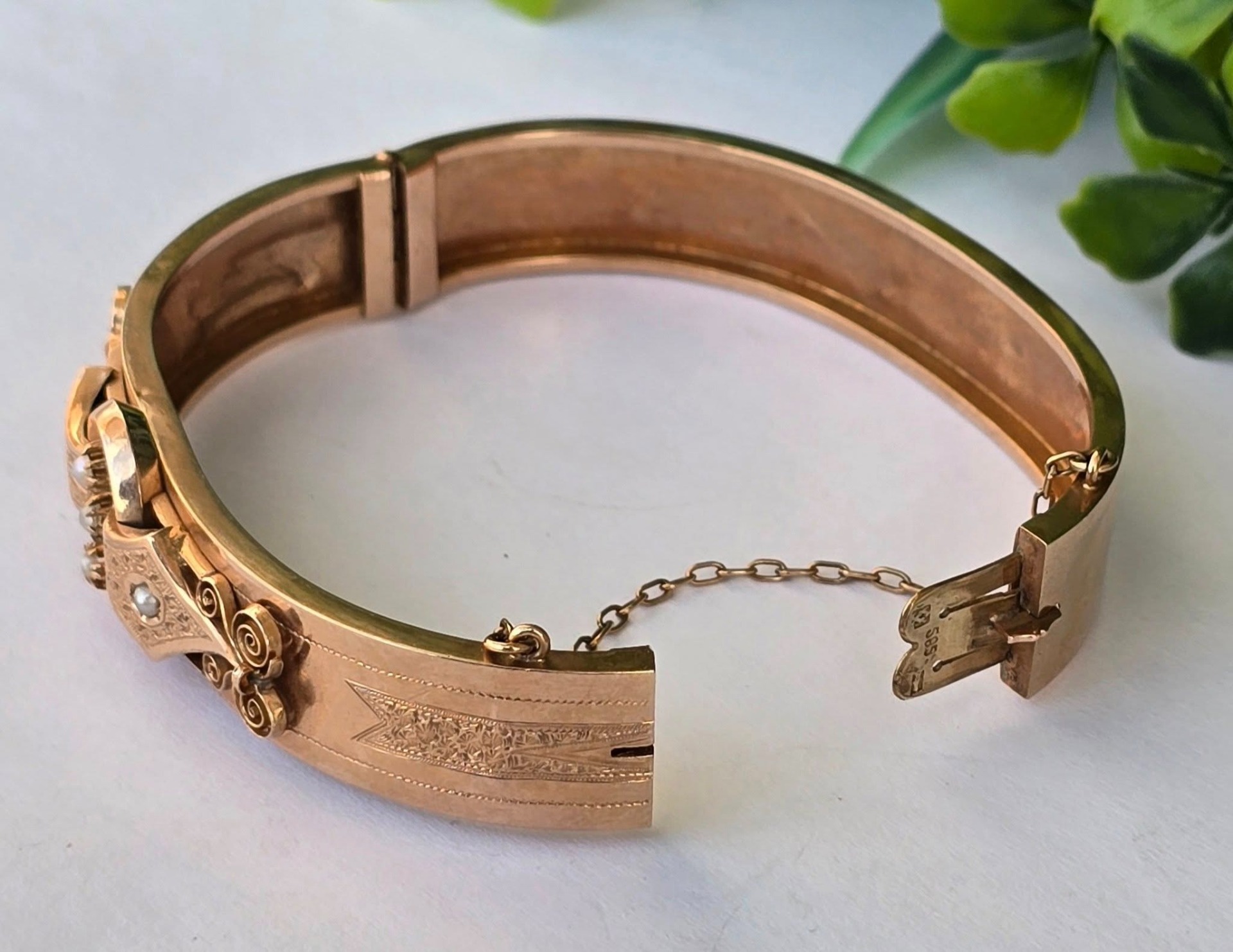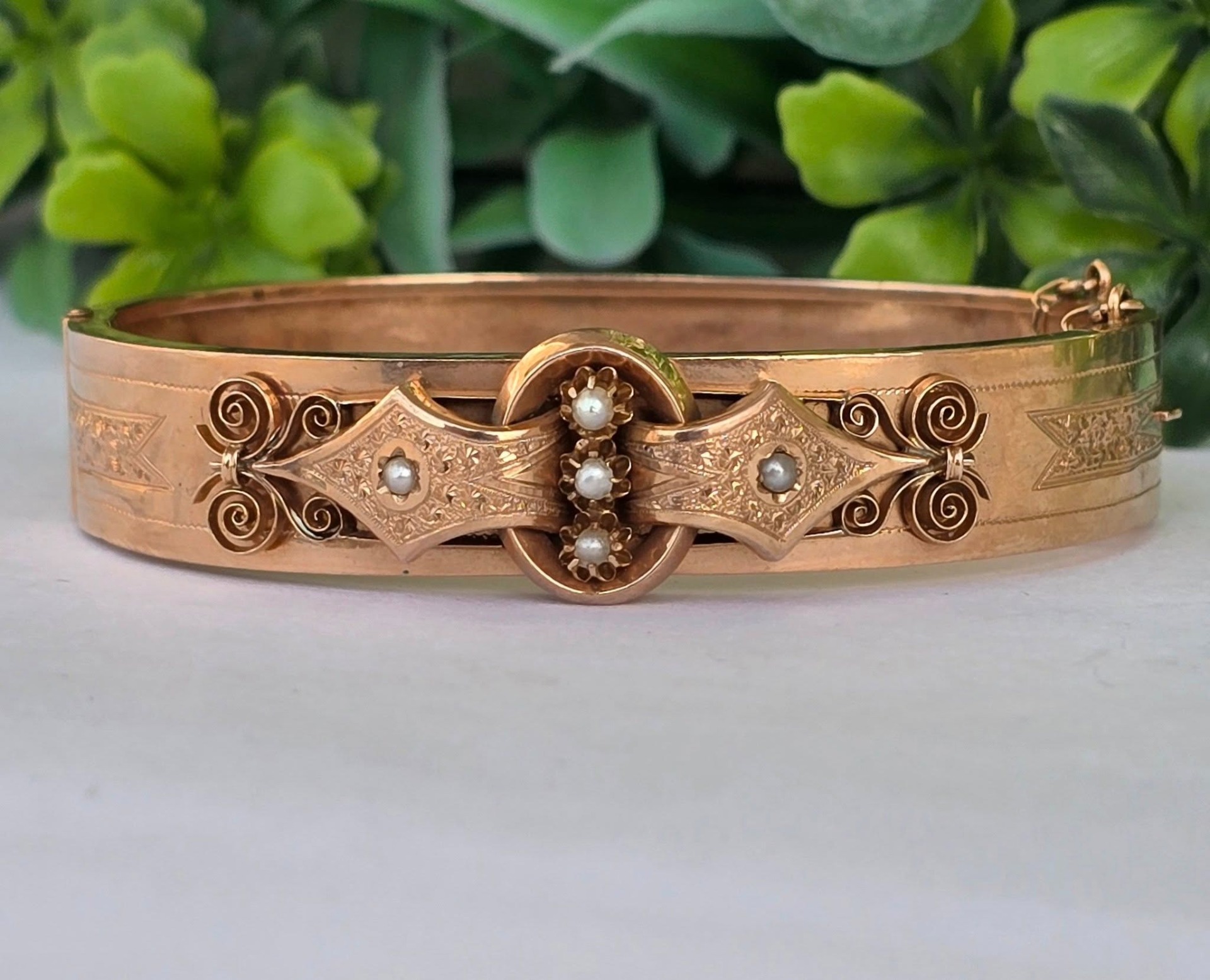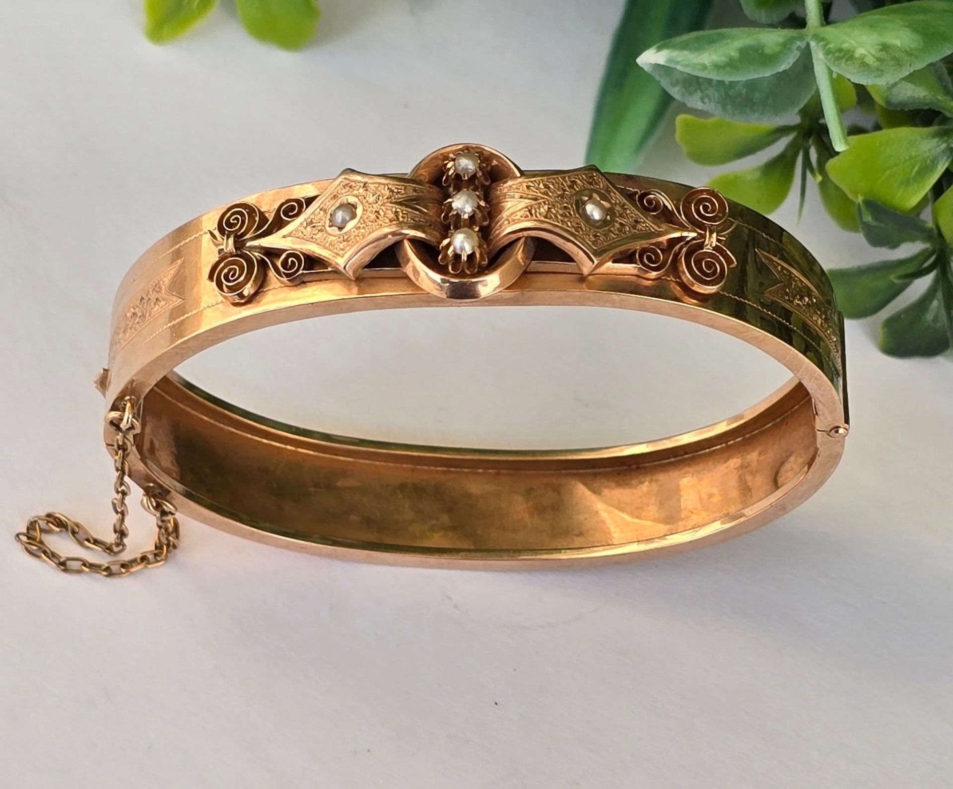 Brățară victoriană superbă, foarte rară, din aur de 14K, cu "seed pearls" naturale, manufactură de excepție caracteristică sfârșitului de secol XIX, foarte greu