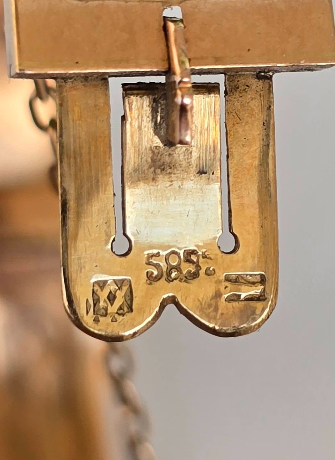 Prezintă marcaj 585 pentru puritate aur de 14K și marcaj de meșter neidentificat.