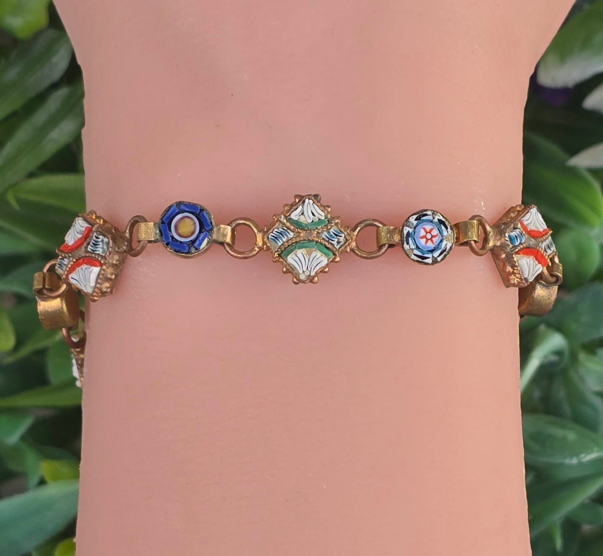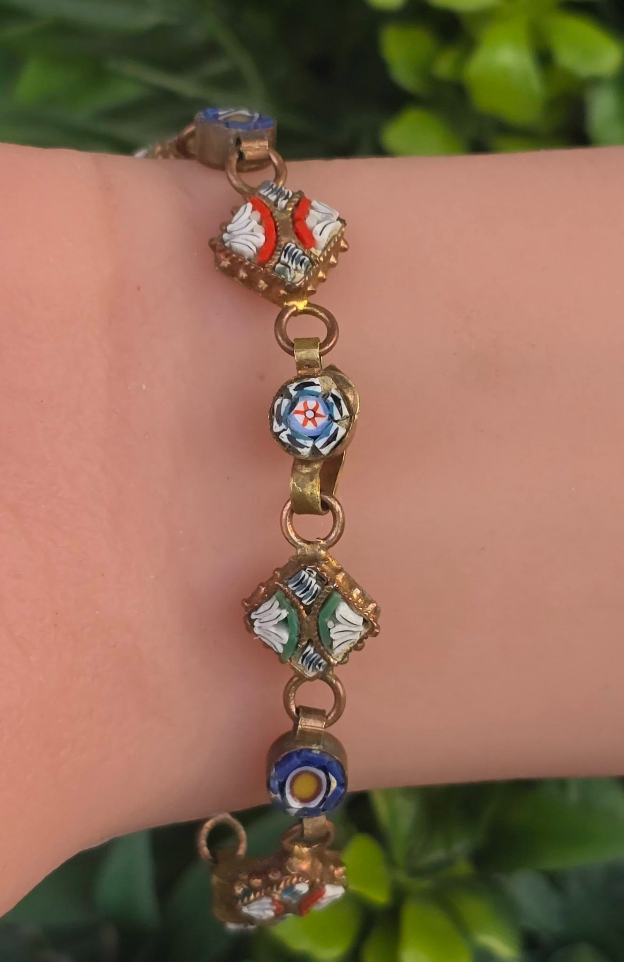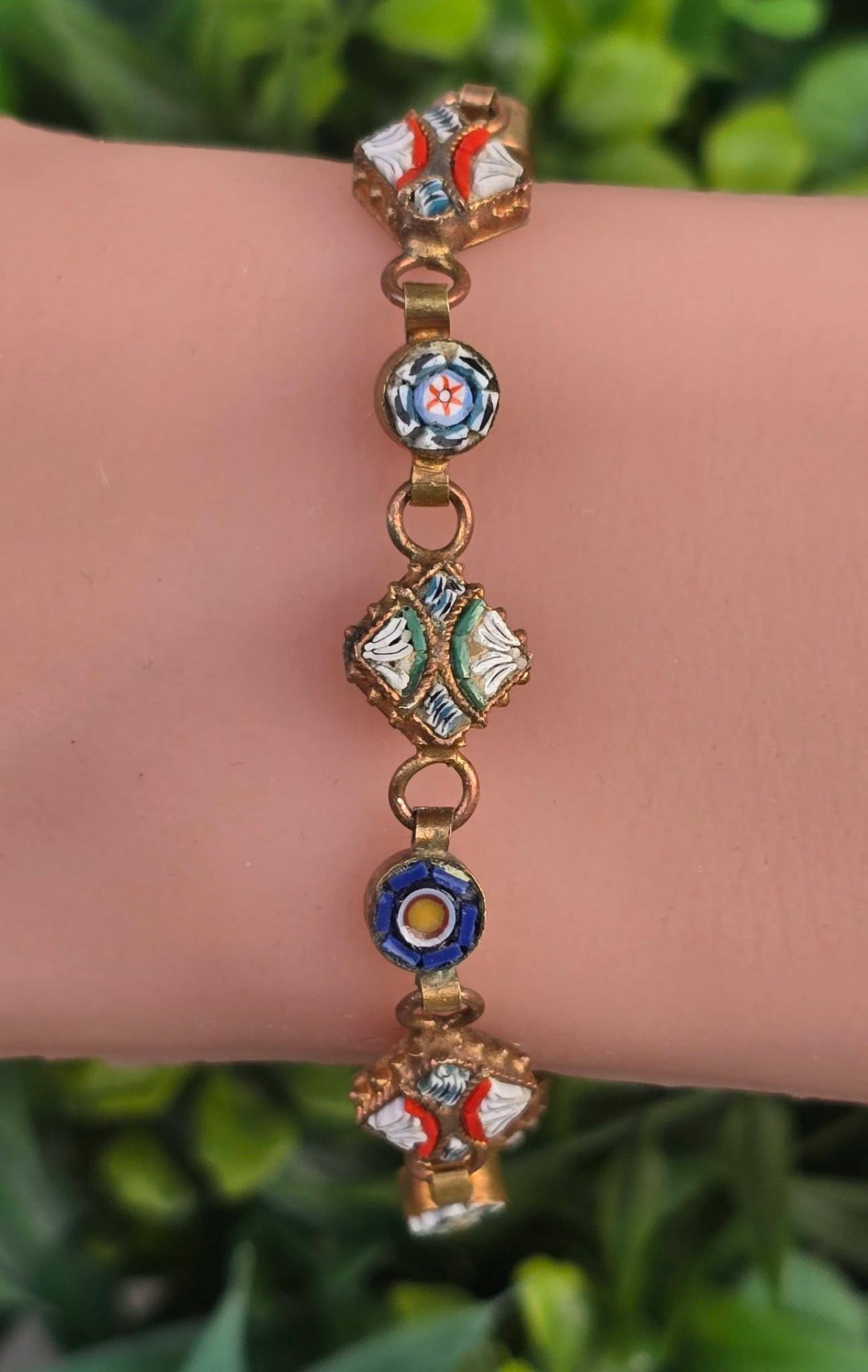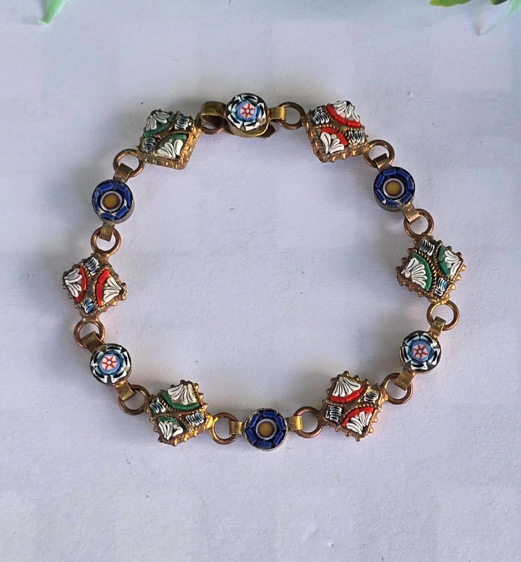 Brățară vintage din alamă, cu micromozaic "Millefiori", manufactură deosebită în motiv floral (anii 1970, Italia).