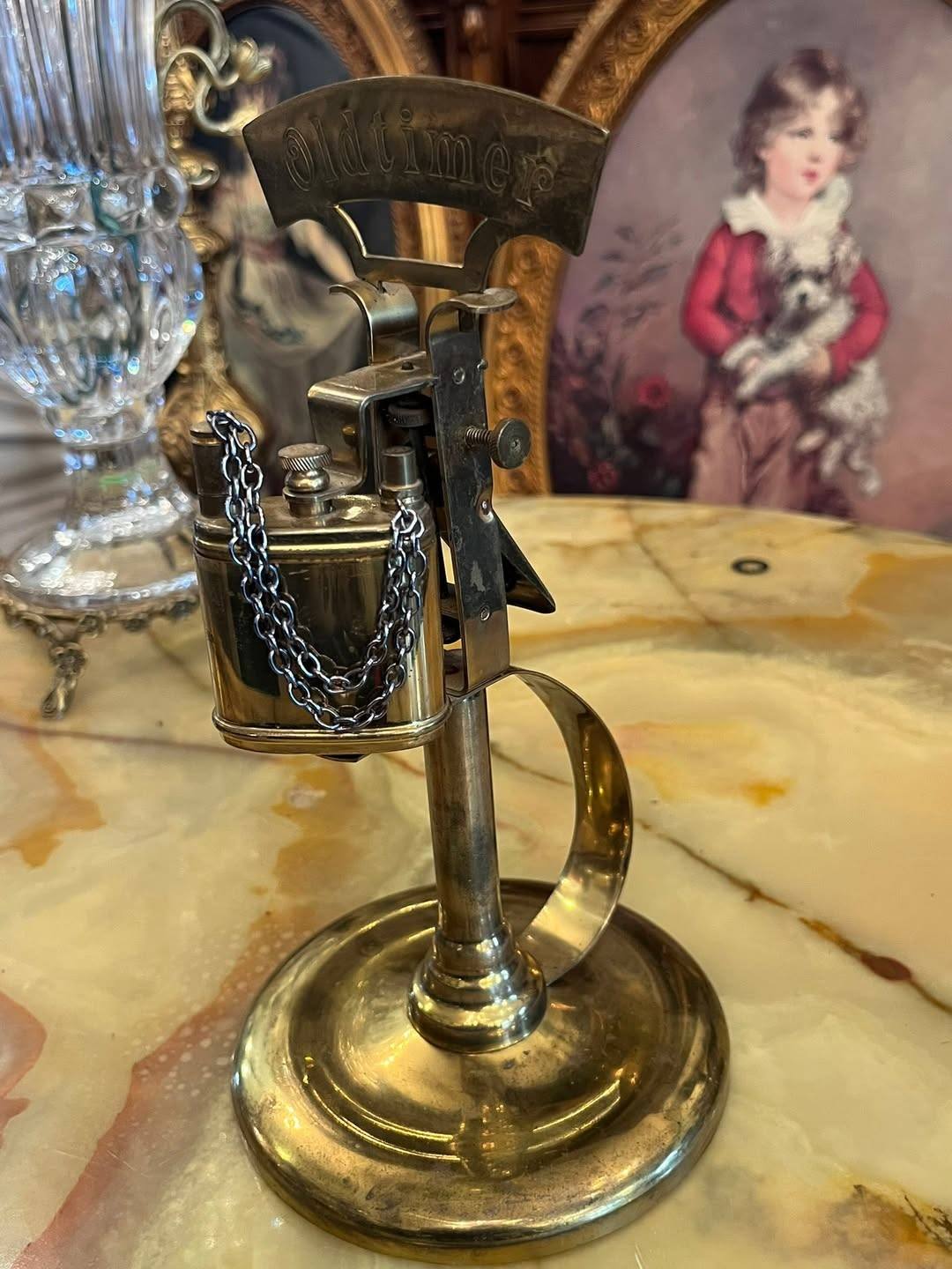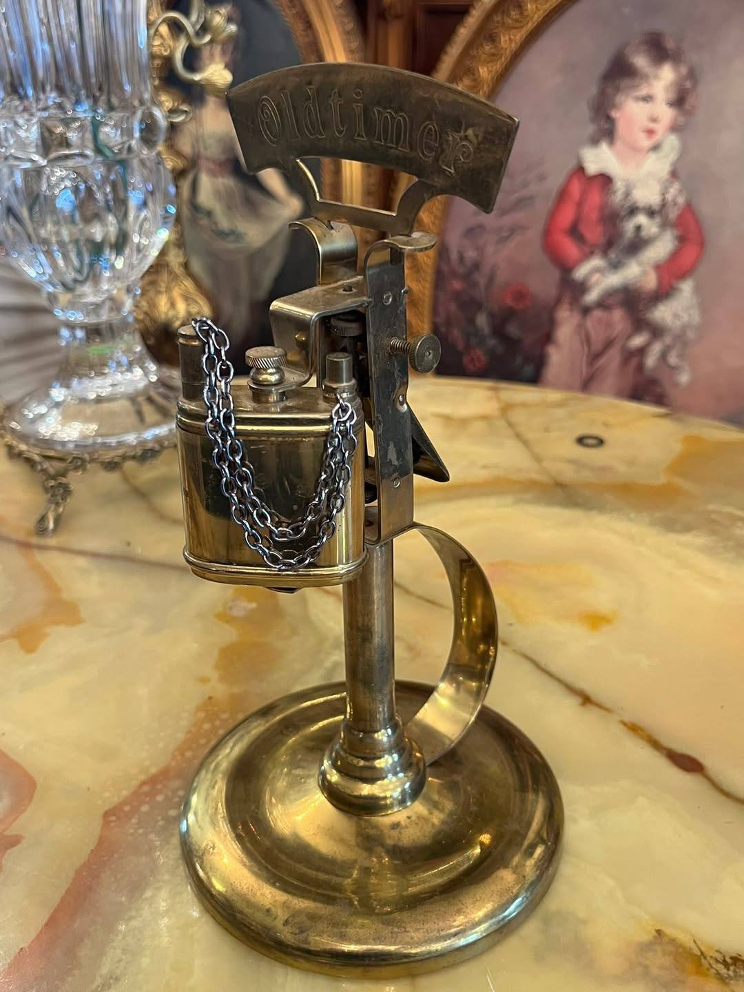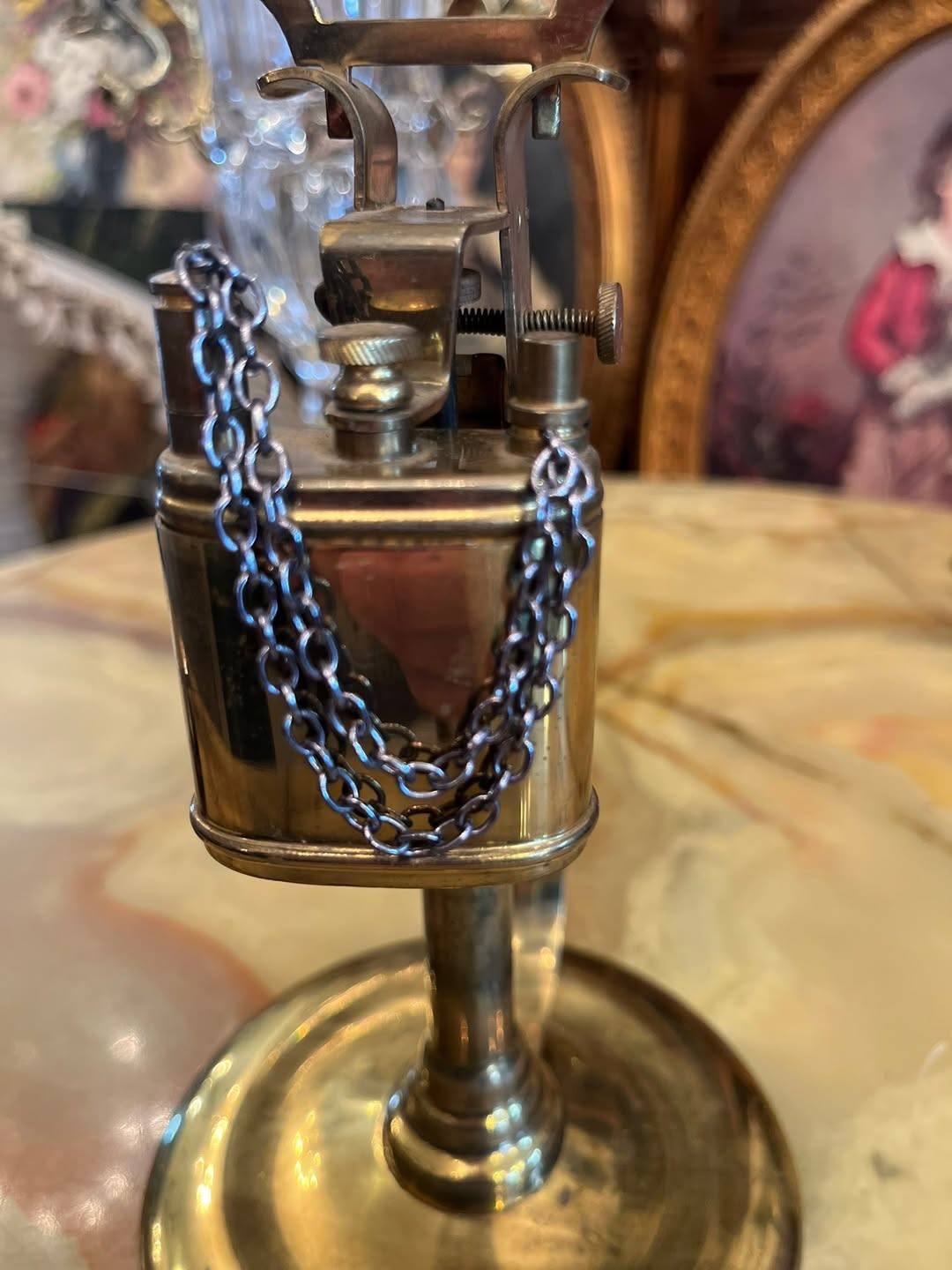 Bricheta este montată pe un suport stabil, de tip stativ, și este prevăzută cu lanț decorativ și mecanism specific brichetelor vechi. Aspectul elegant și patina metalului îi oferă un aer autentic, fiind o piesă interesantă pentru colecționari sau pentru decor.