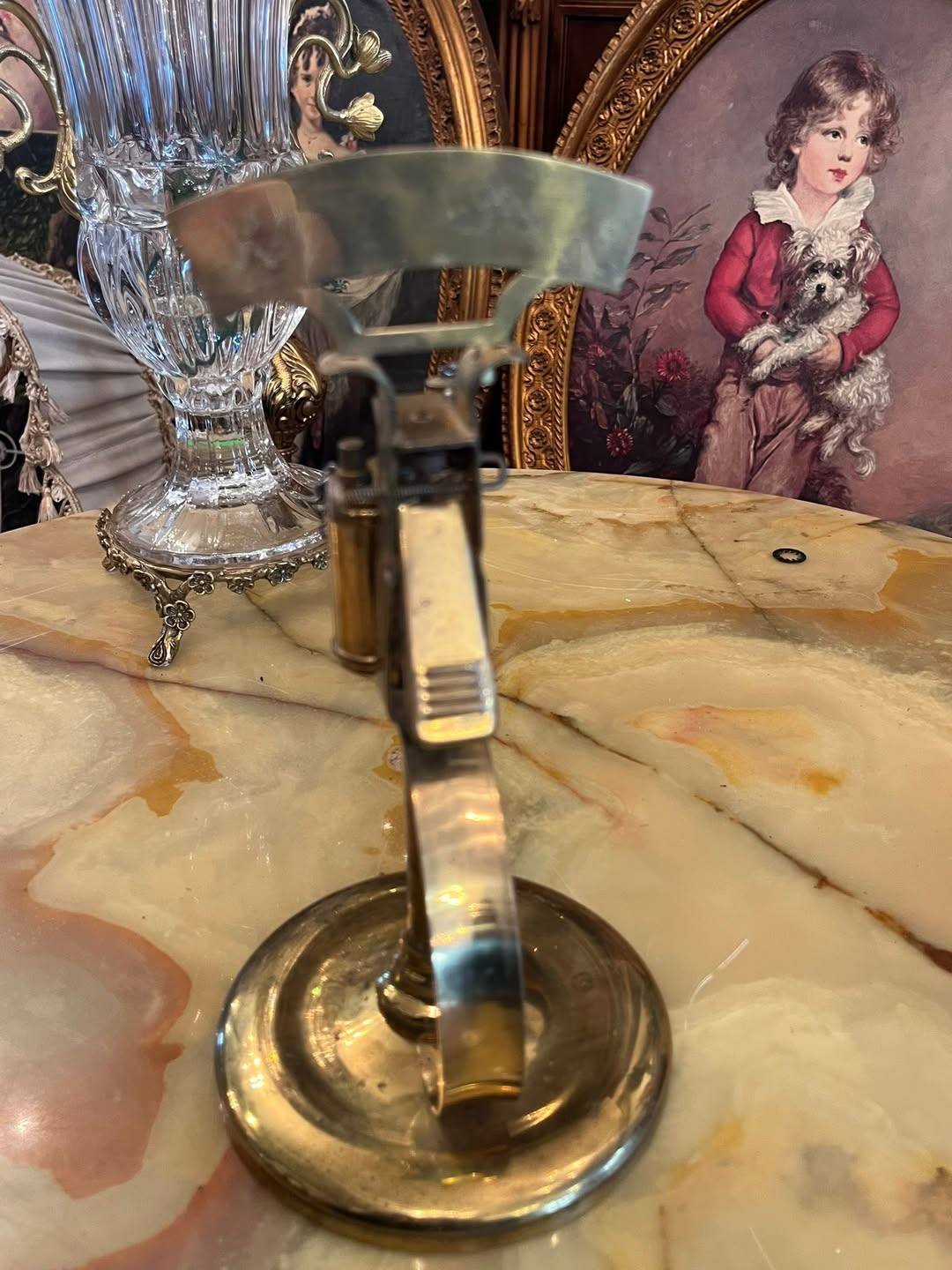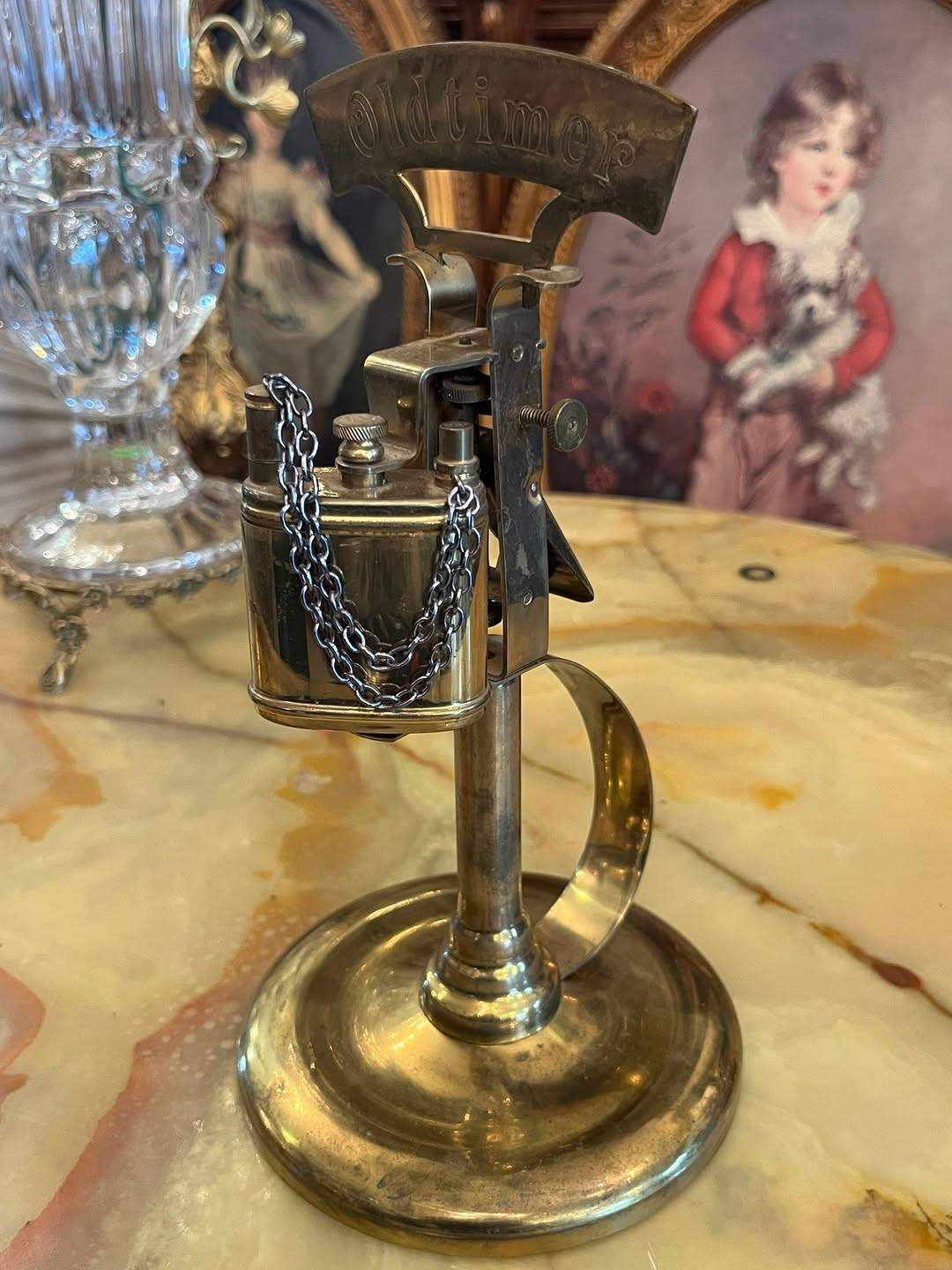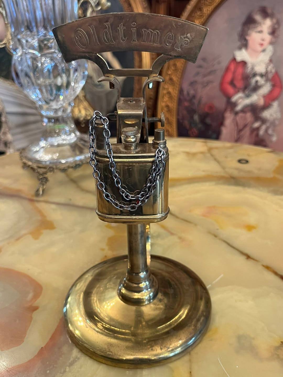 Bricheta este montată pe un suport stabil, de tip stativ, și este prevăzută cu lanț decorativ și mecanism specific brichetelor vechi. Aspectul elegant și patina metalului îi oferă un aer autentic, fiind o piesă interesantă pentru colecționari sau pentru decor.