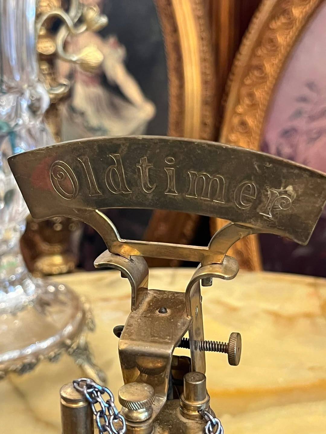 Brichetă de masă vintage decorativă, realizată din metal, cu design inspirat din mecanismele industriale vechi. În partea superioară apare inscripția „Oldtimer”, sugerând stilul clasic și caracterul retro al piesei.