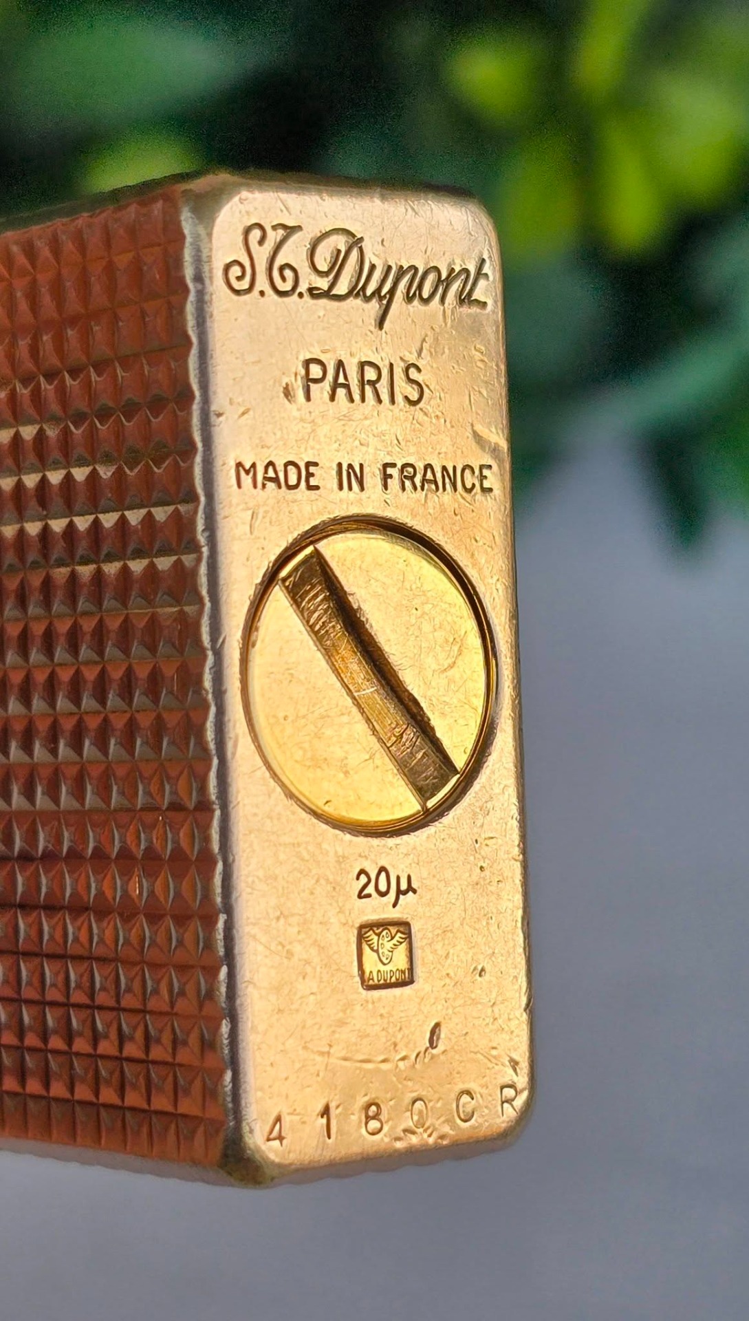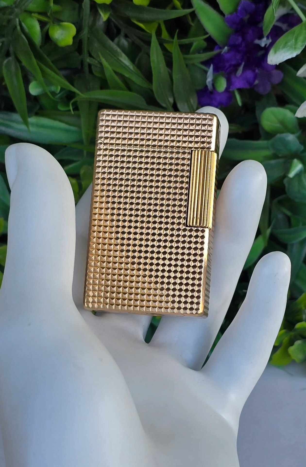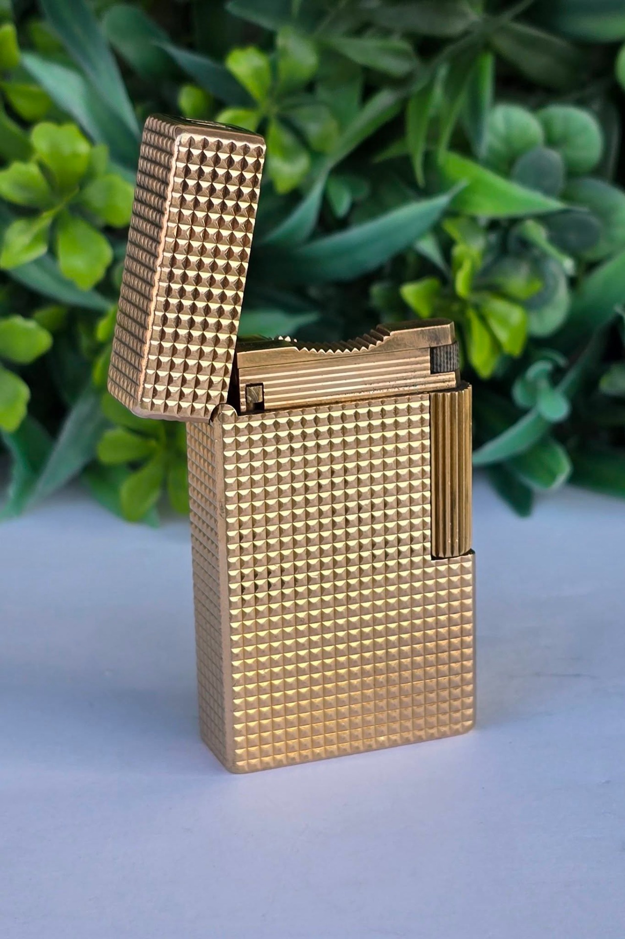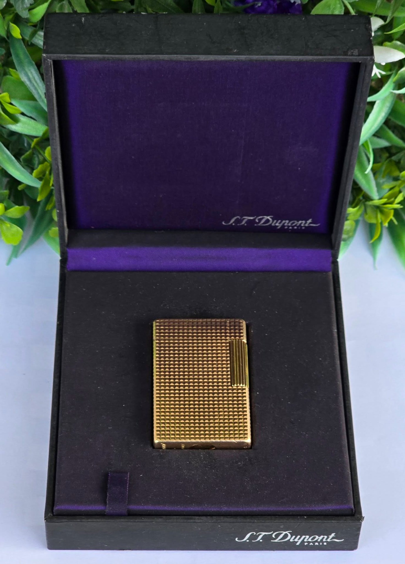 Brichetă vintage S.T. DUPONT autentică, de colecție, placată cu aur (20 microni), pe gaz, funcțională, în stare bună, cu foarte puține urme de uzură, în cutie