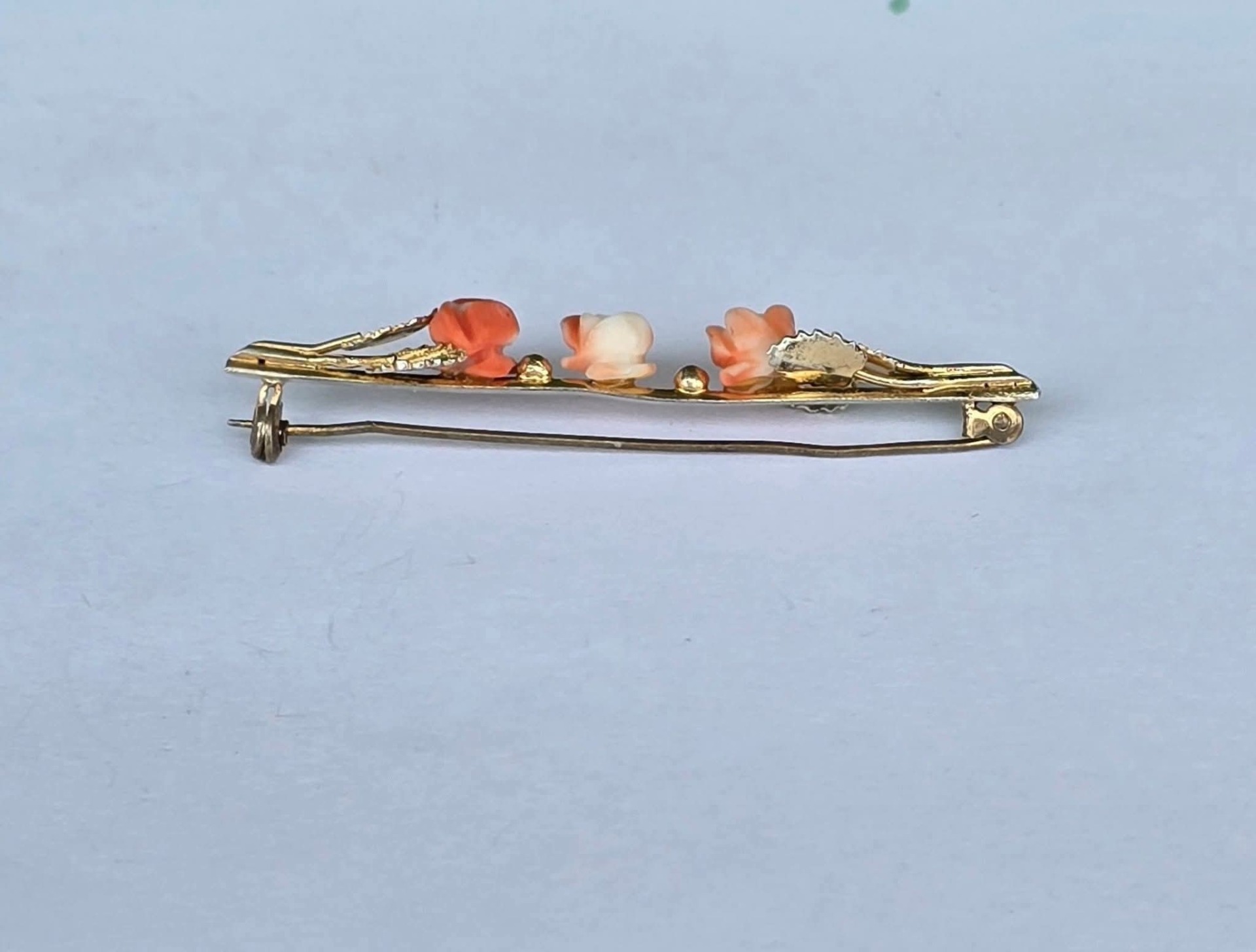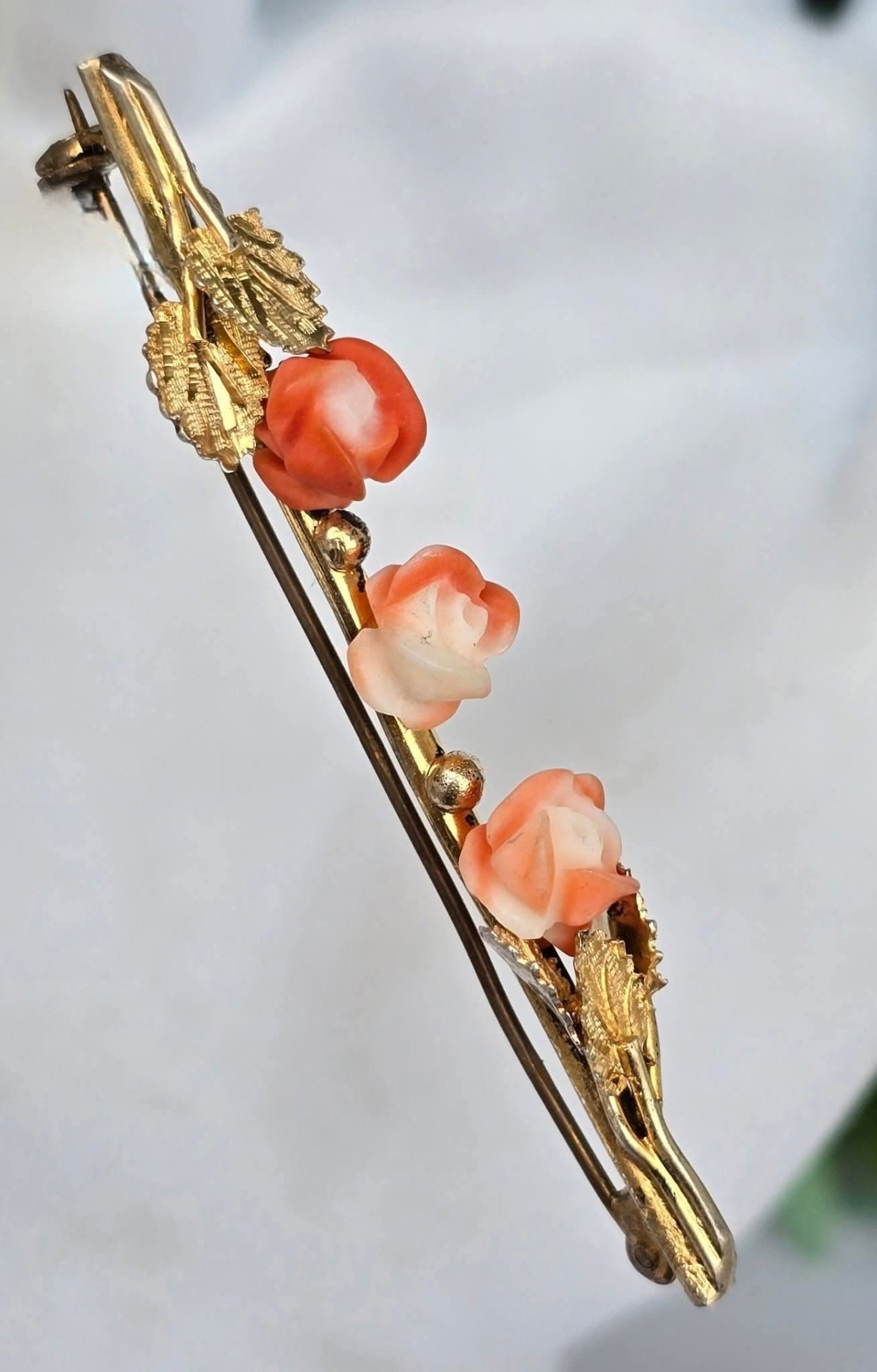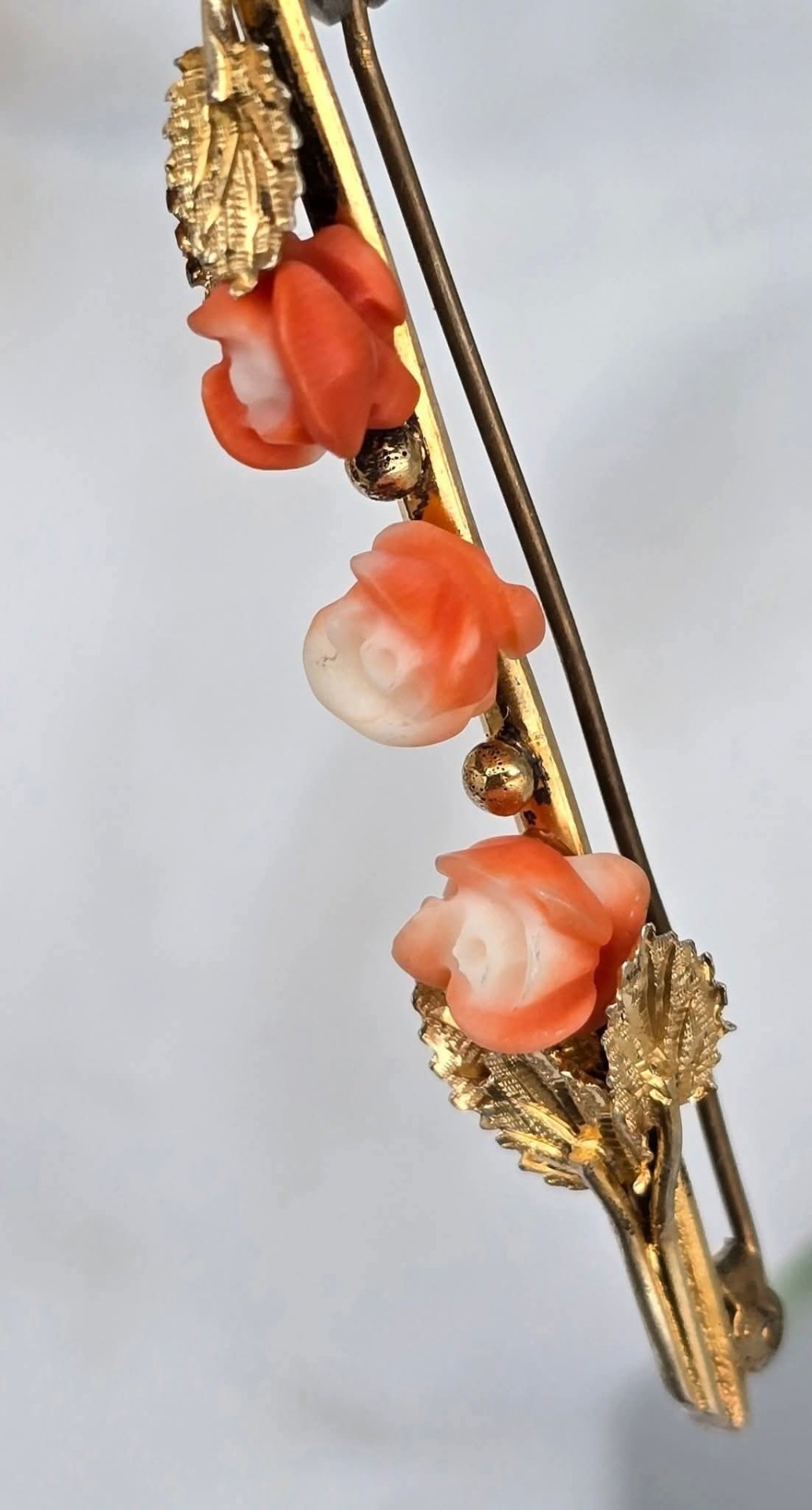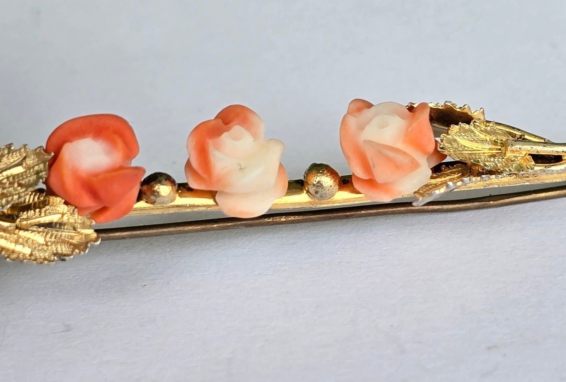 Broșă (ac de rever) veche din argint aurit, cu coral natural sculptat manual, manufactură complexă în motiv floral (încep.sec.XX, Italia).