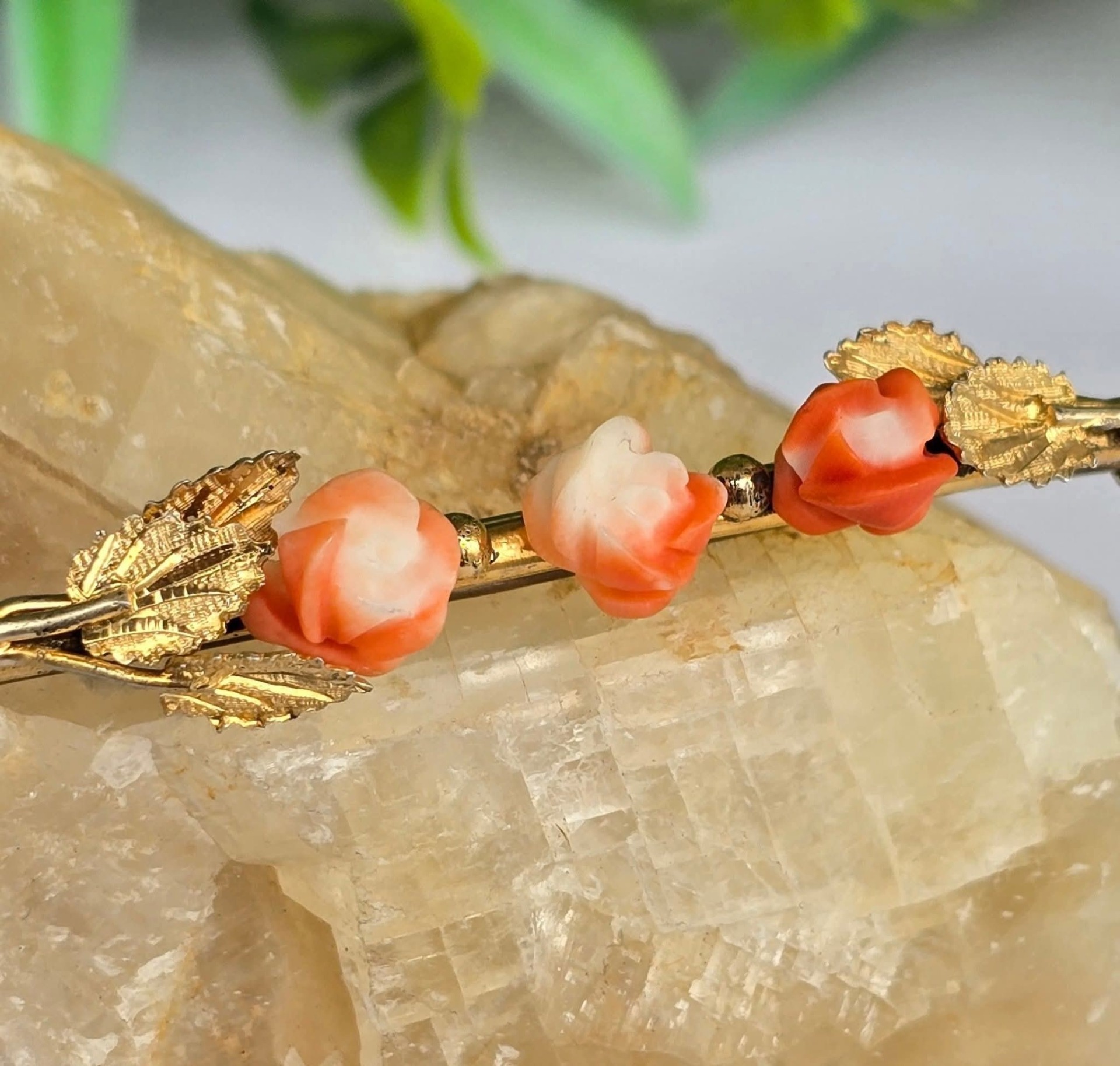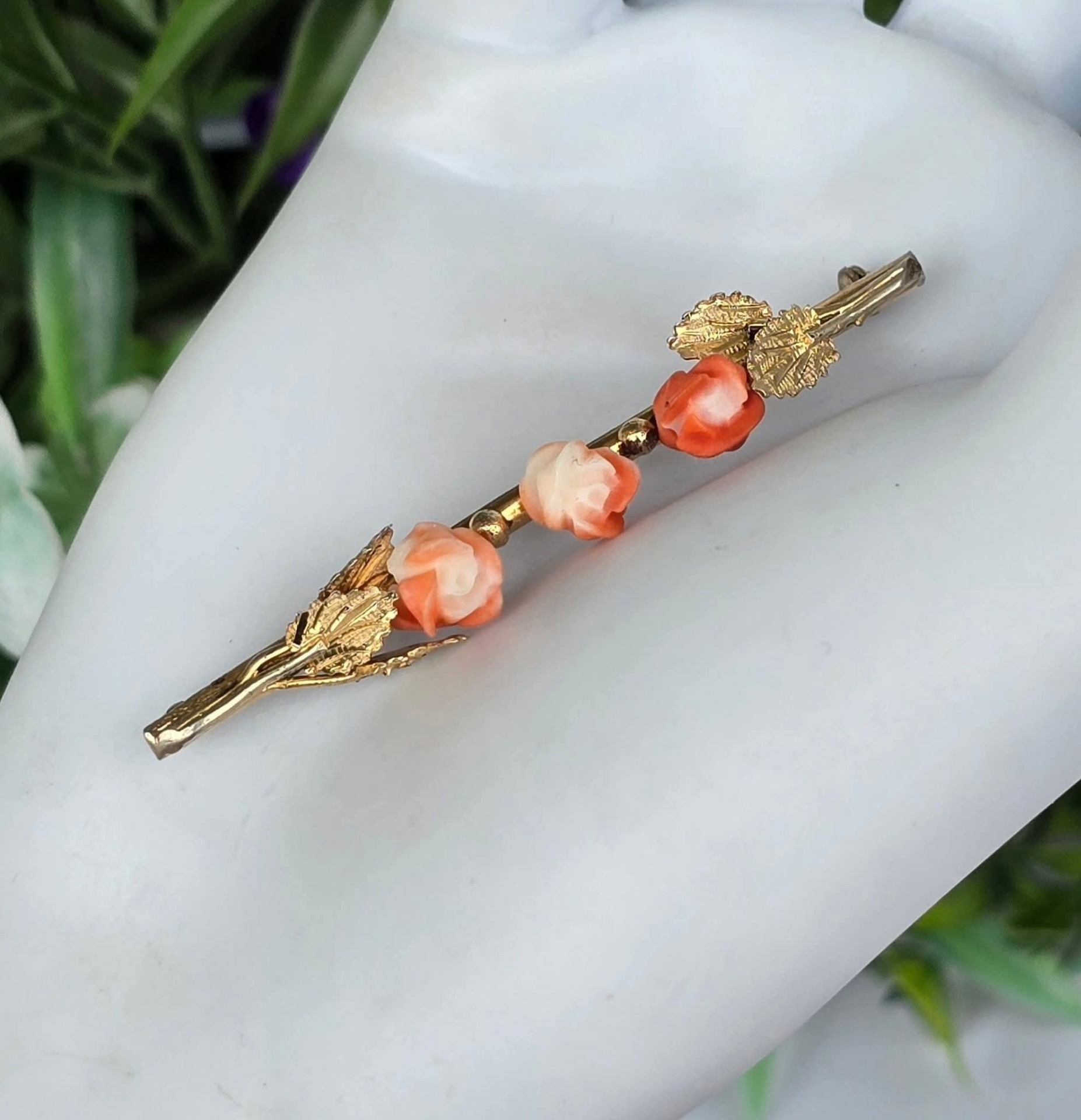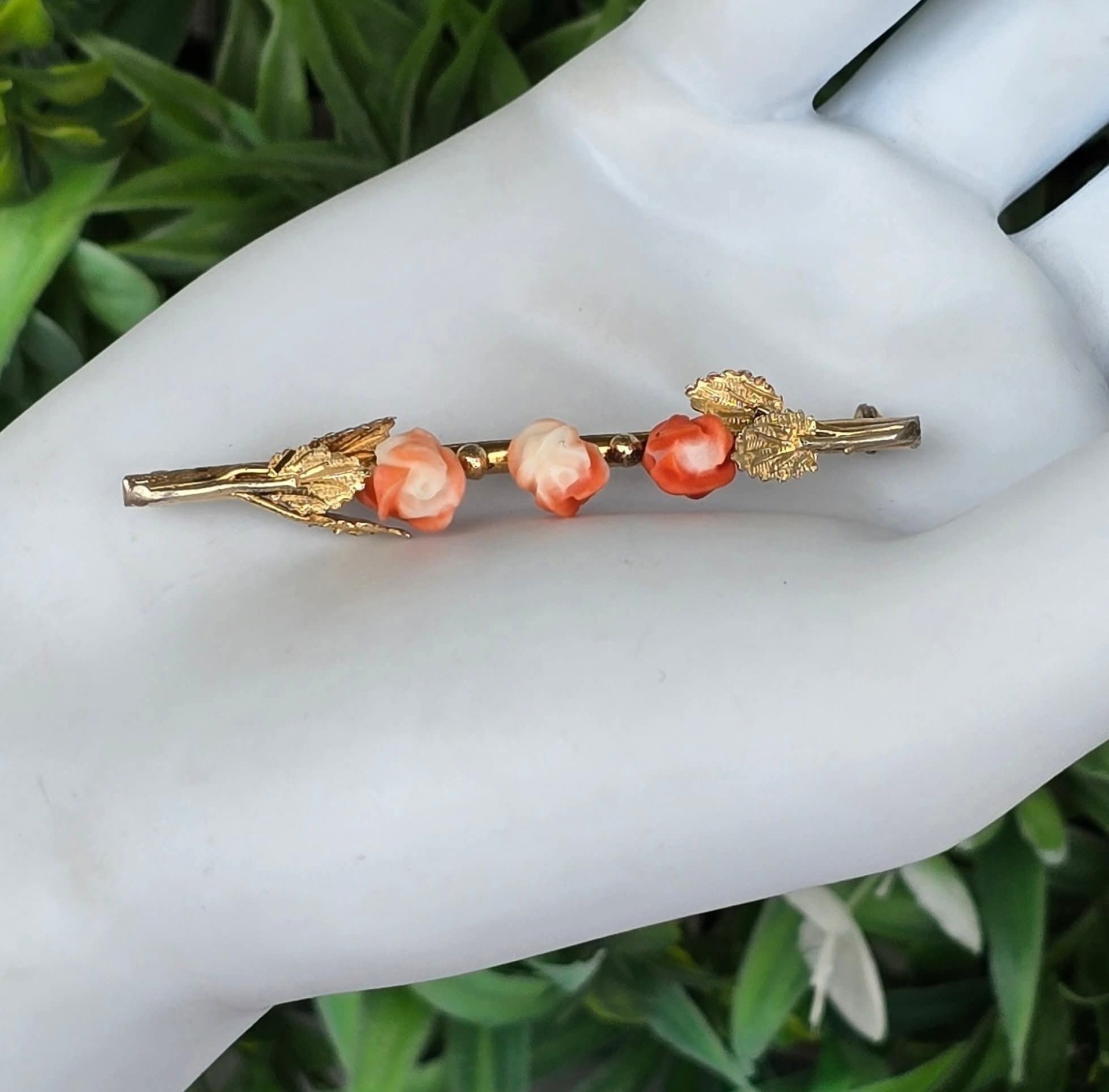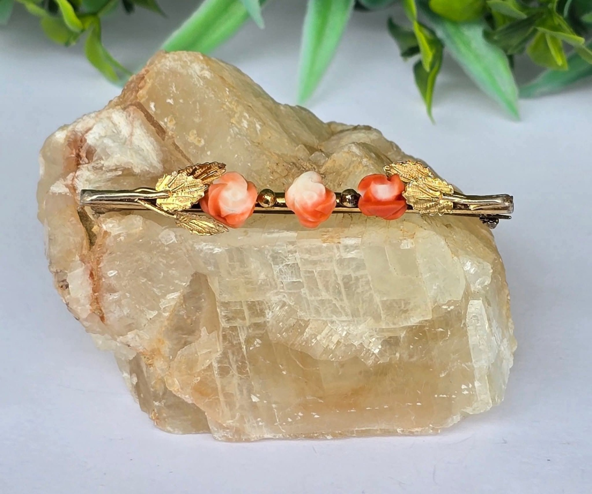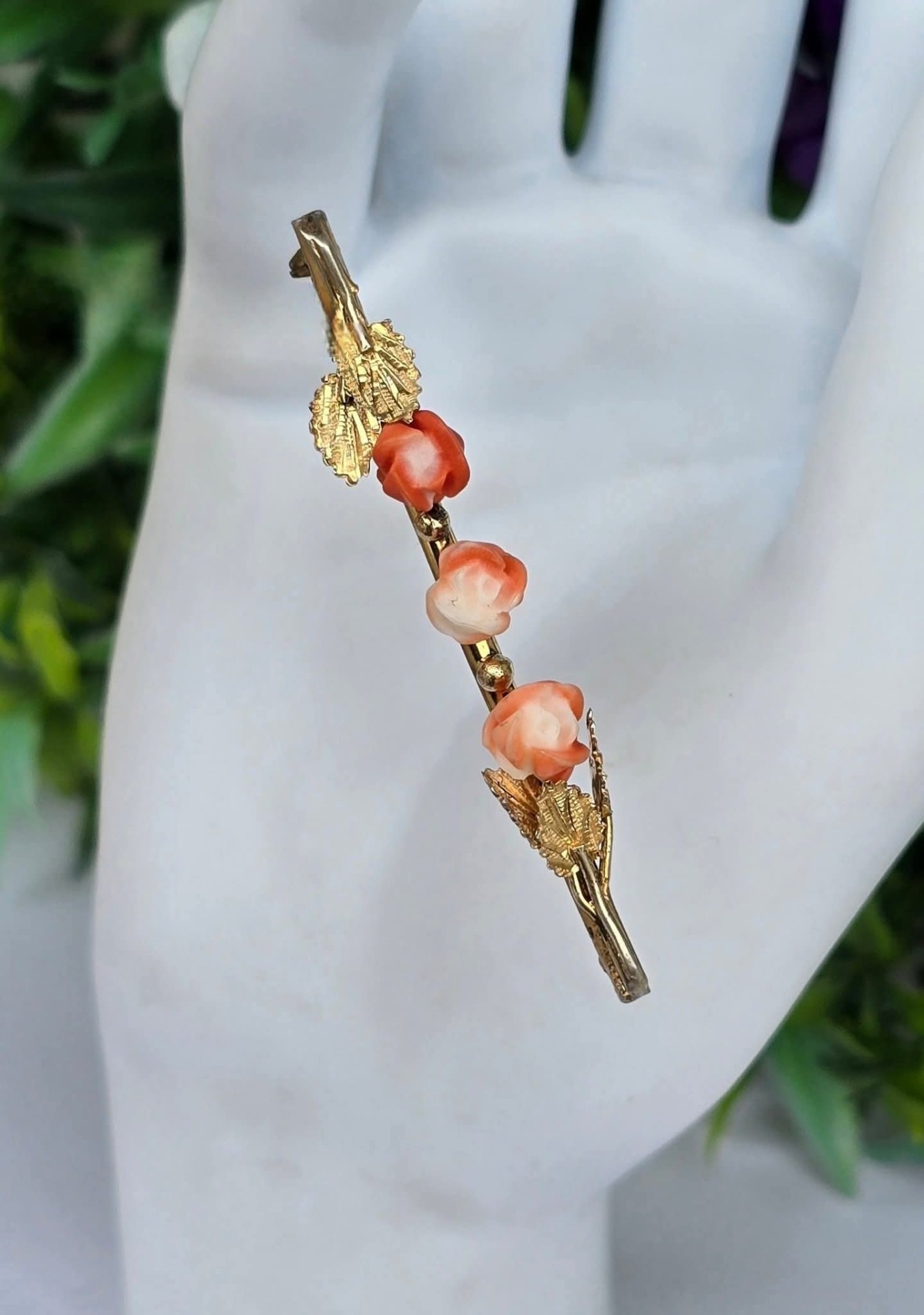 Broșă (ac de rever) veche din argint aurit, cu coral natural sculptat manual, manufactură complexă în motiv floral (încep.sec.XX, Italia).