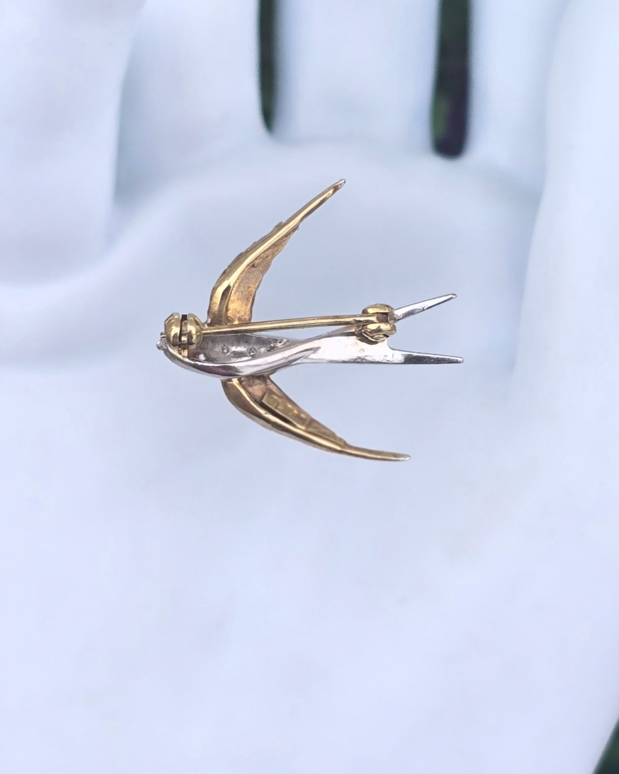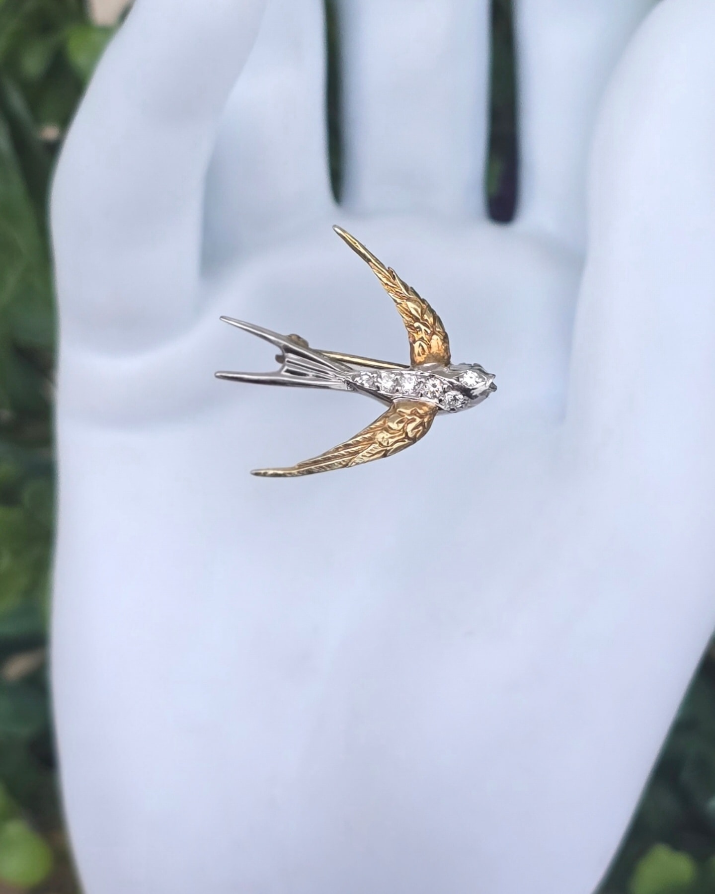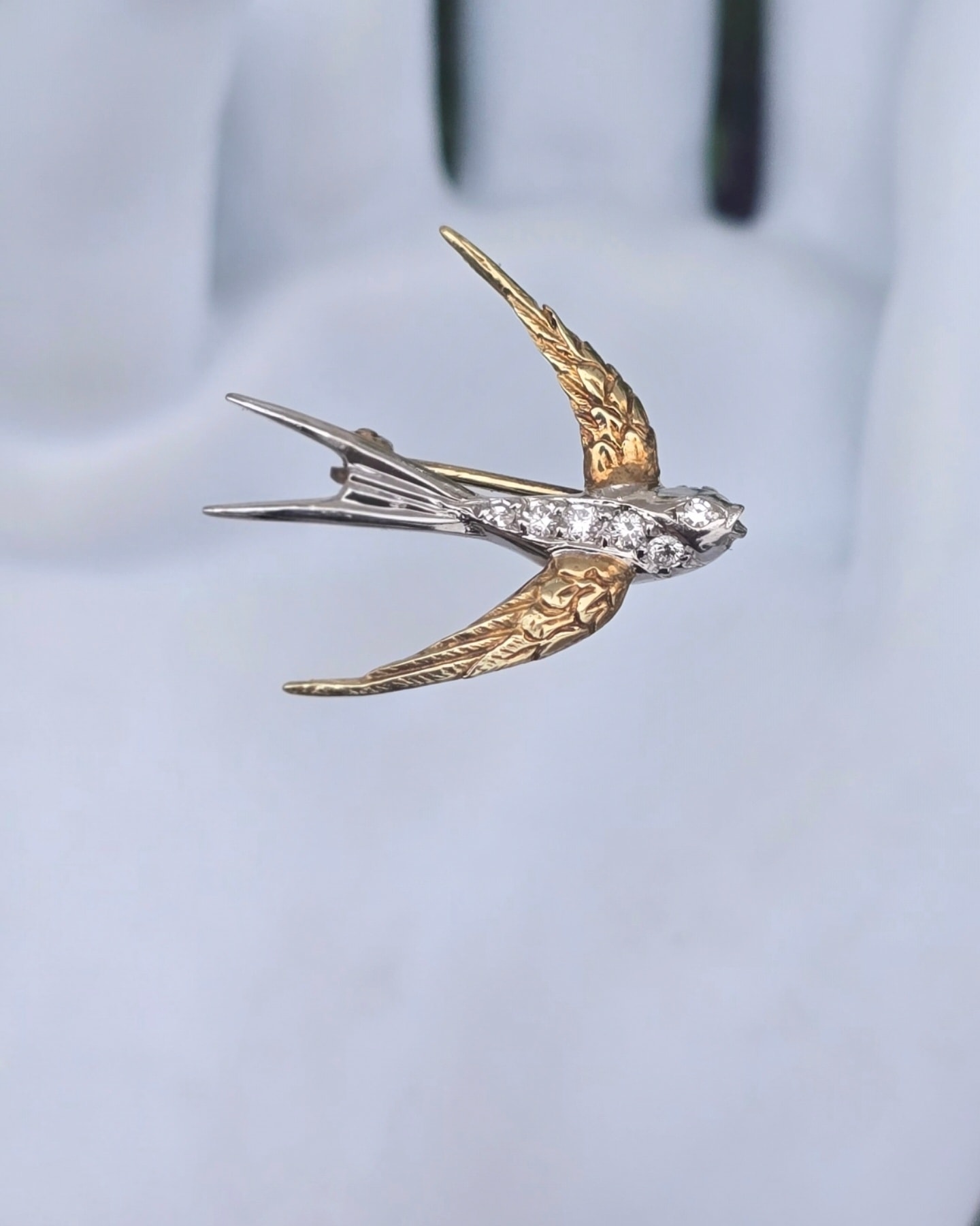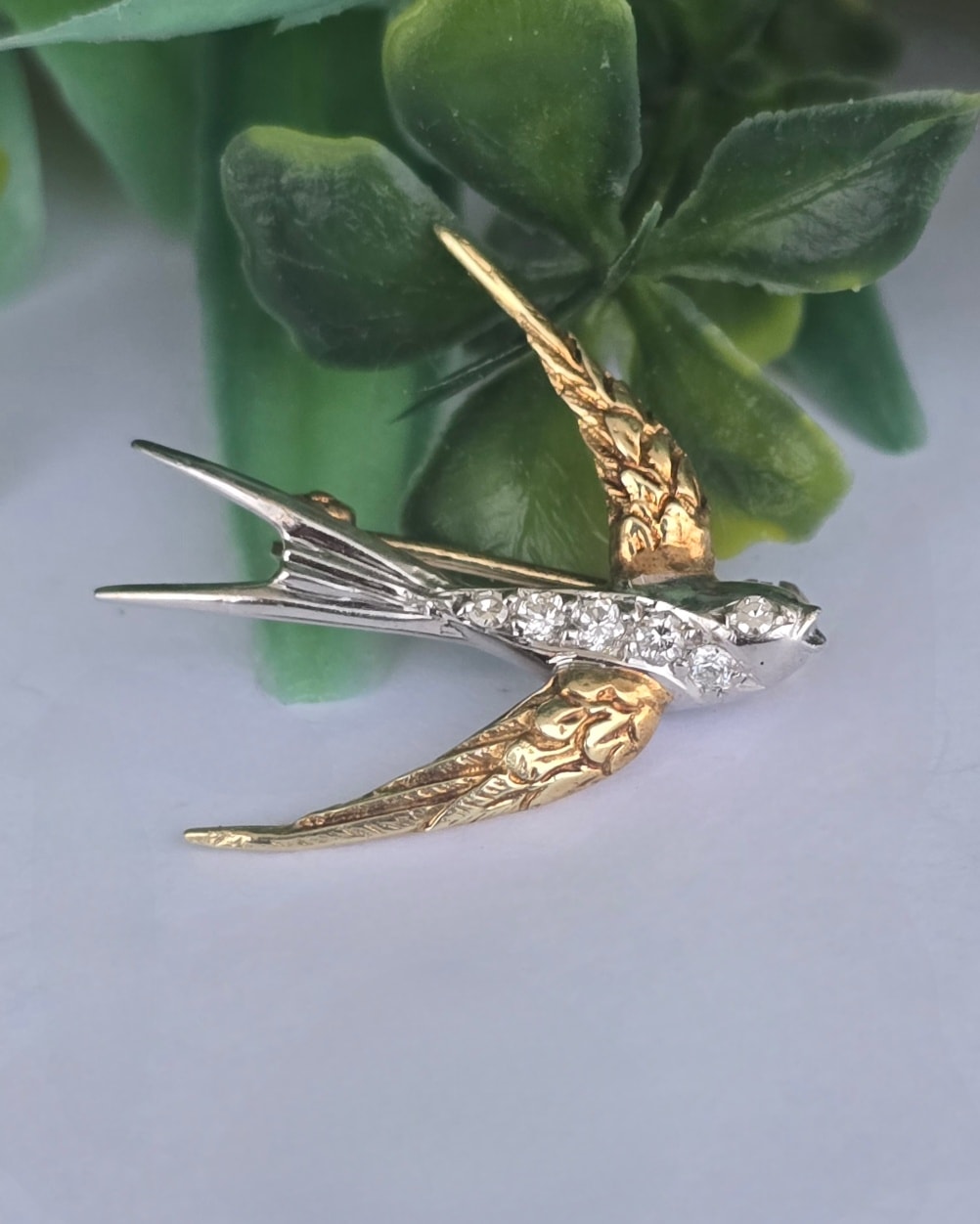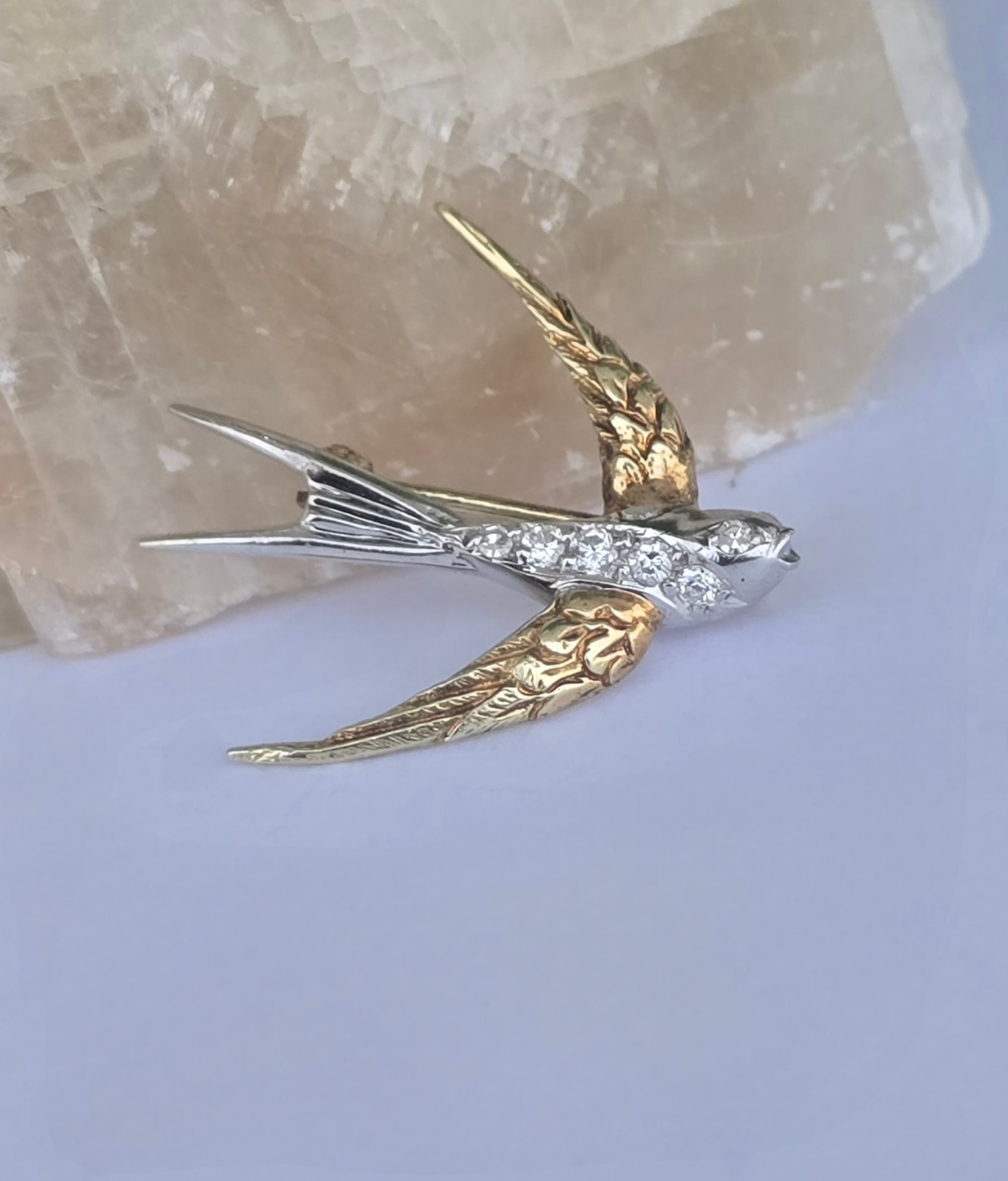 Broșă-rândunică veche superbă, din aur de 14K, cu 6 diamante naturale de calitate excepțională.
