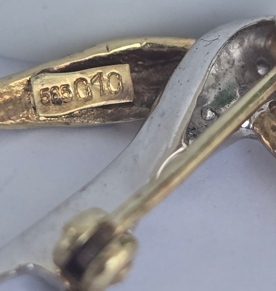 Prezintă marcaj 585 pentru puritate aur de 14K și marcaj "0.10" pentru caratajul diamantelor.
