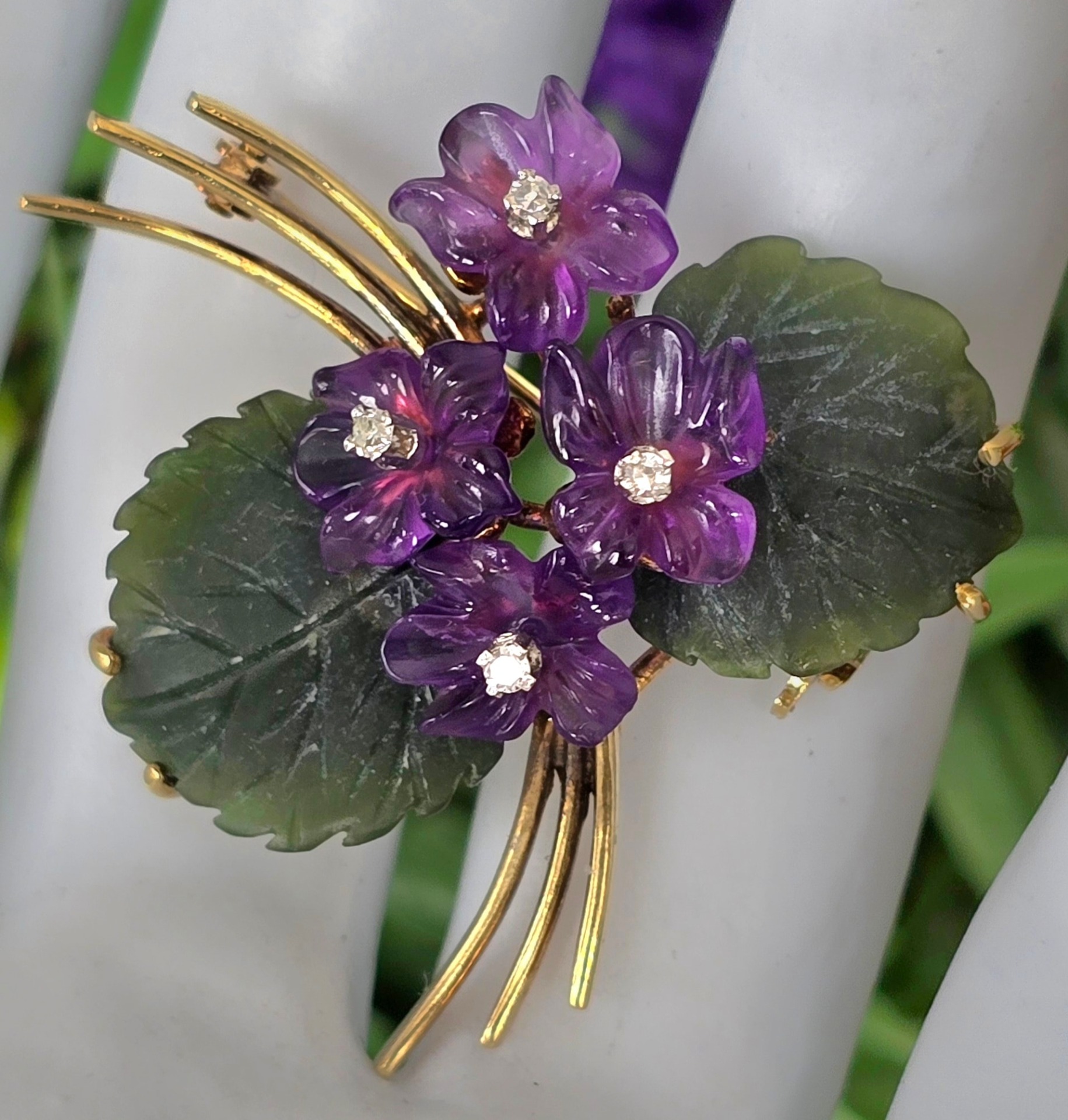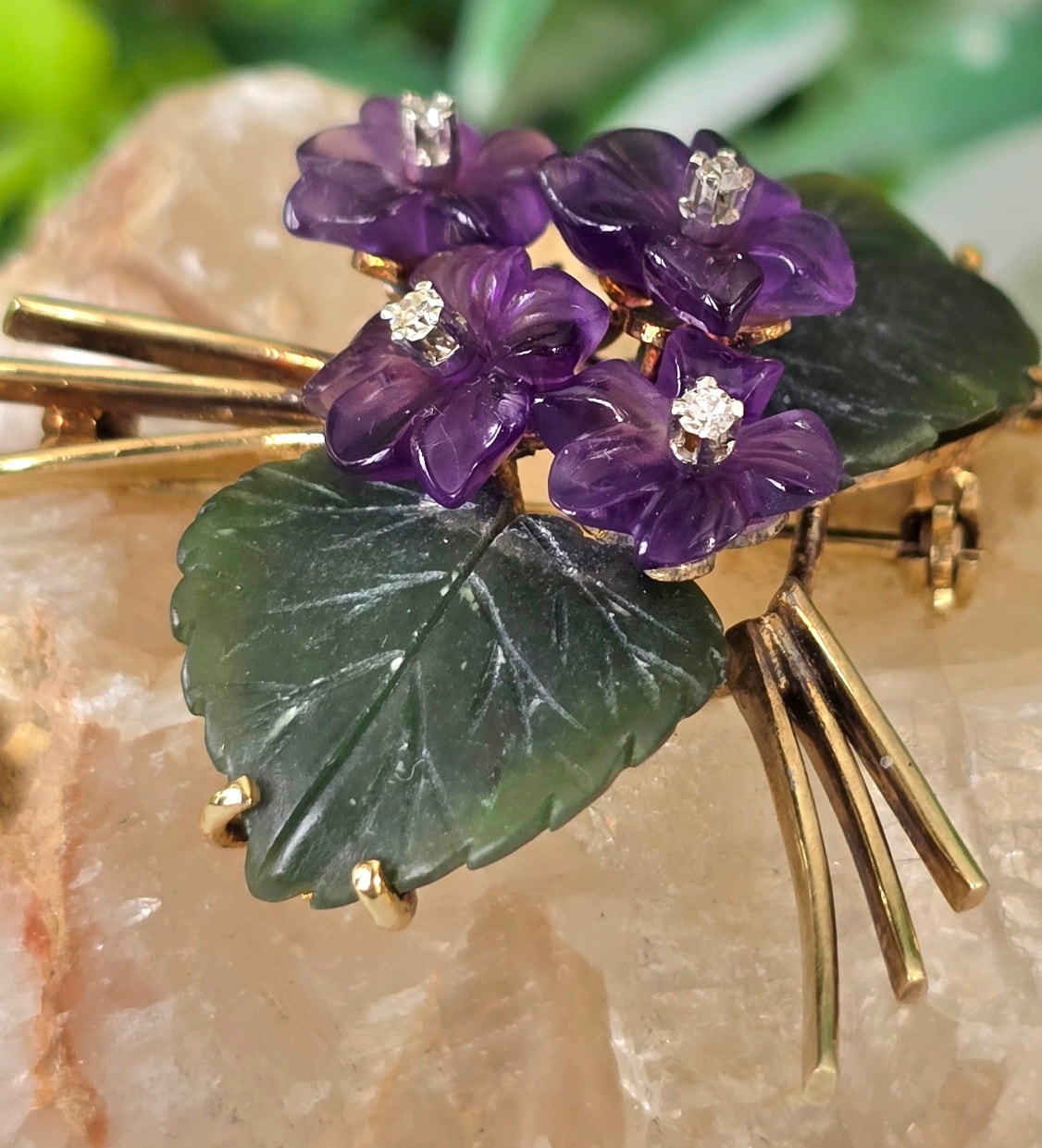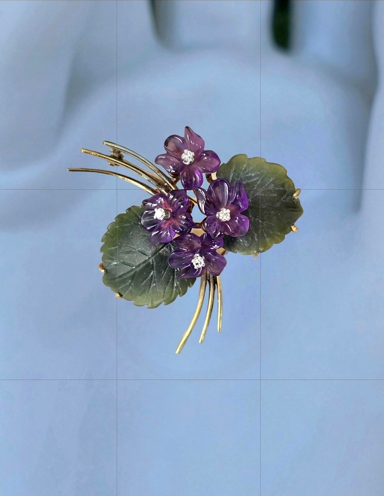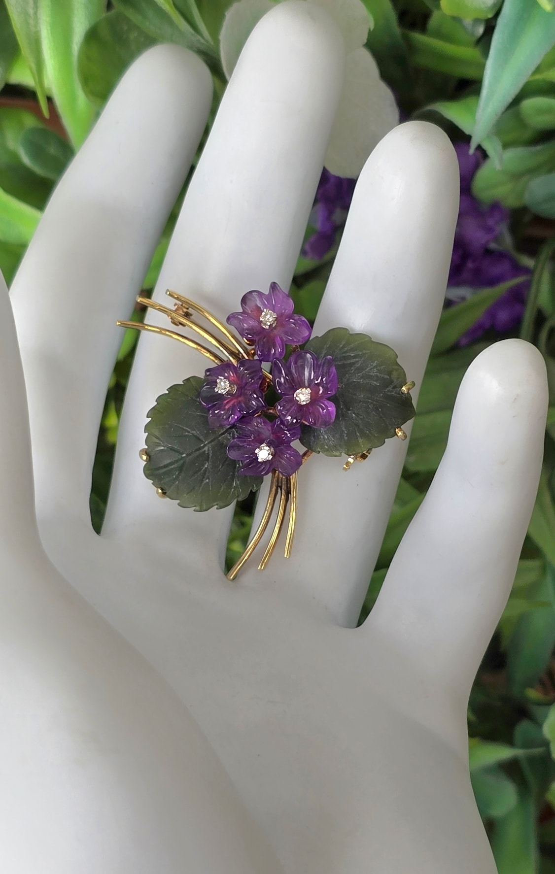 Broșă "Sweet Violet" veche, spectaculoasă, din aur de 14K, cu 4 diamante naturale montate pe toporași din ametist natural sculptat, cu frunzulițe din jad nefrit