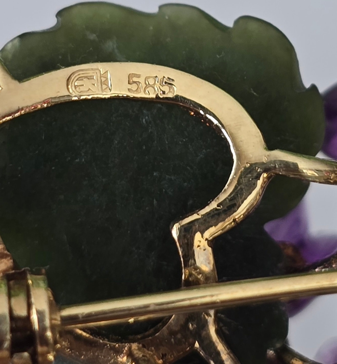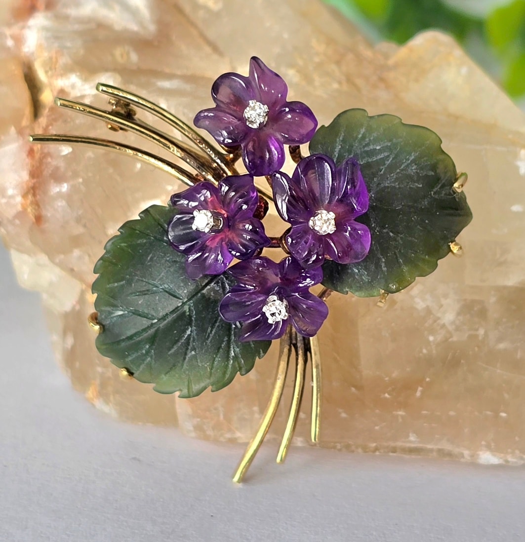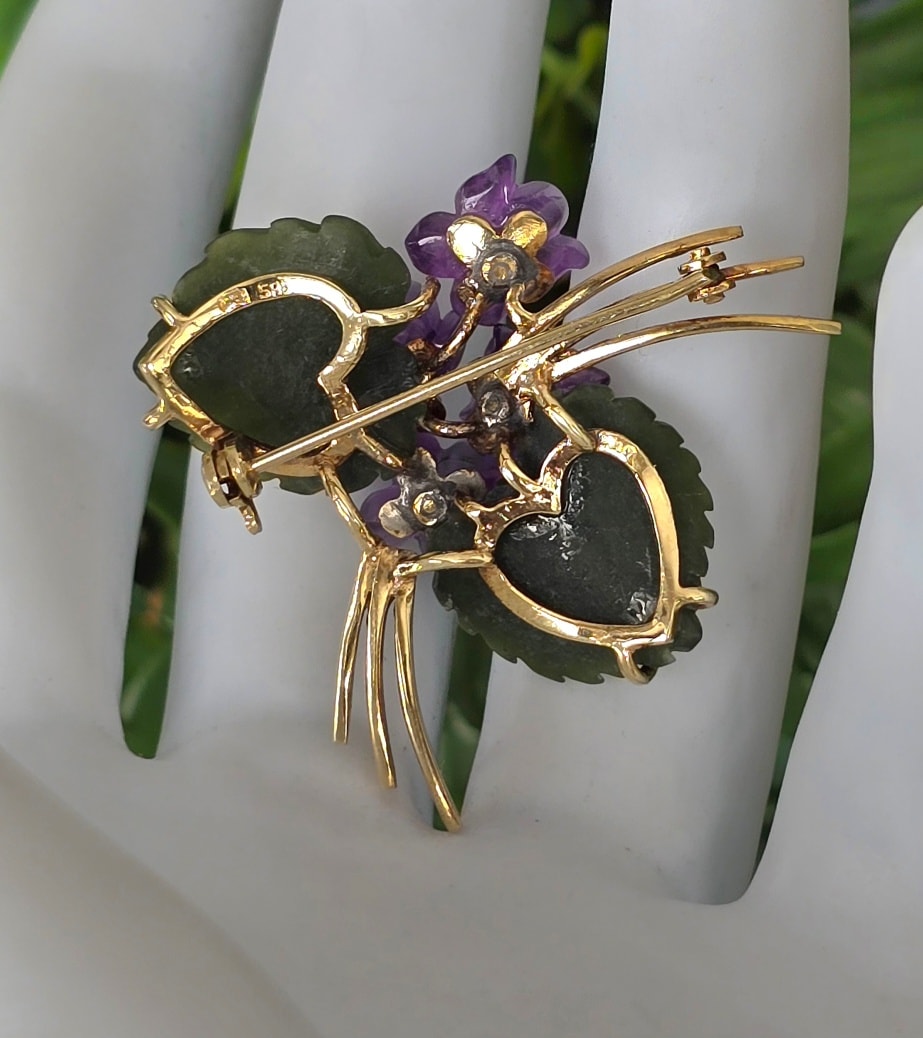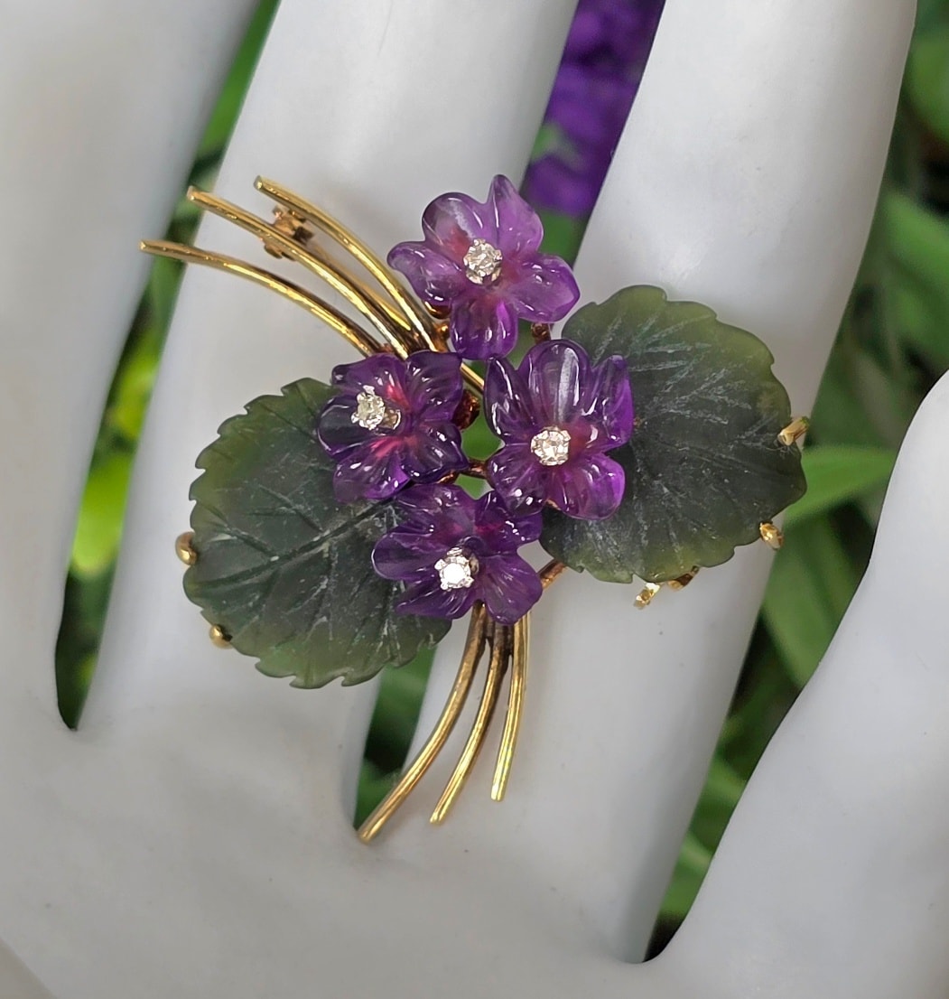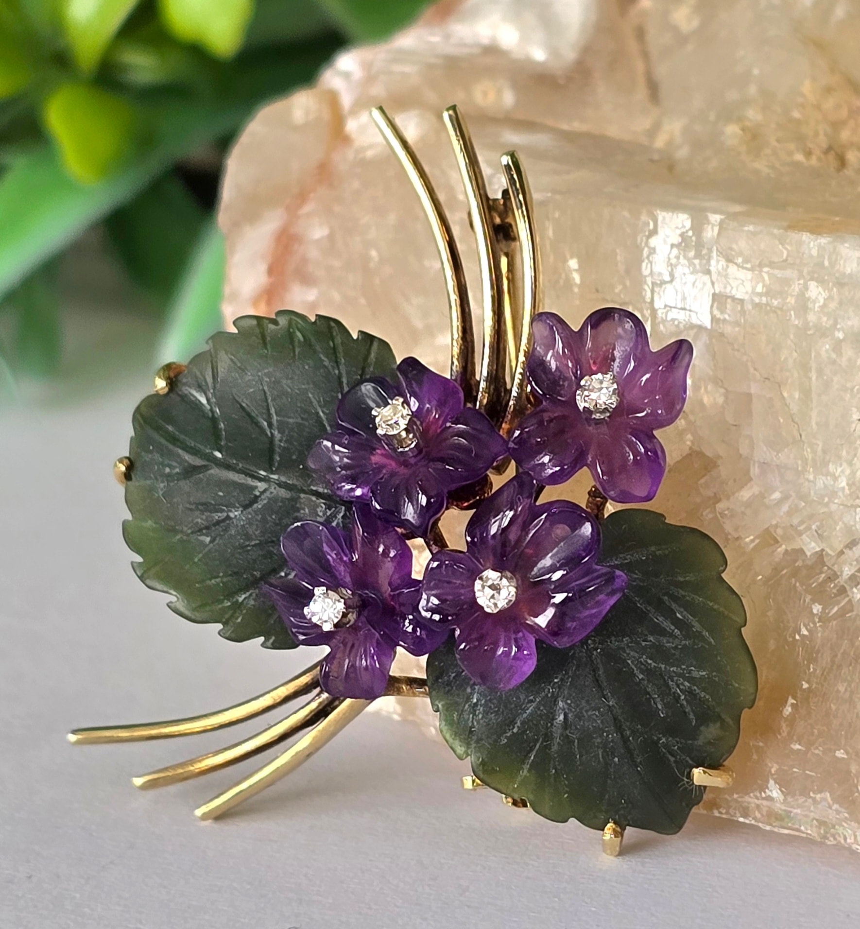 Broșă "Sweet Violet" veche, spectaculoasă, din aur de 14K, cu 4 diamante naturale montate pe toporași din ametist natural sculptat, cu frunzulițe din jad nefrit