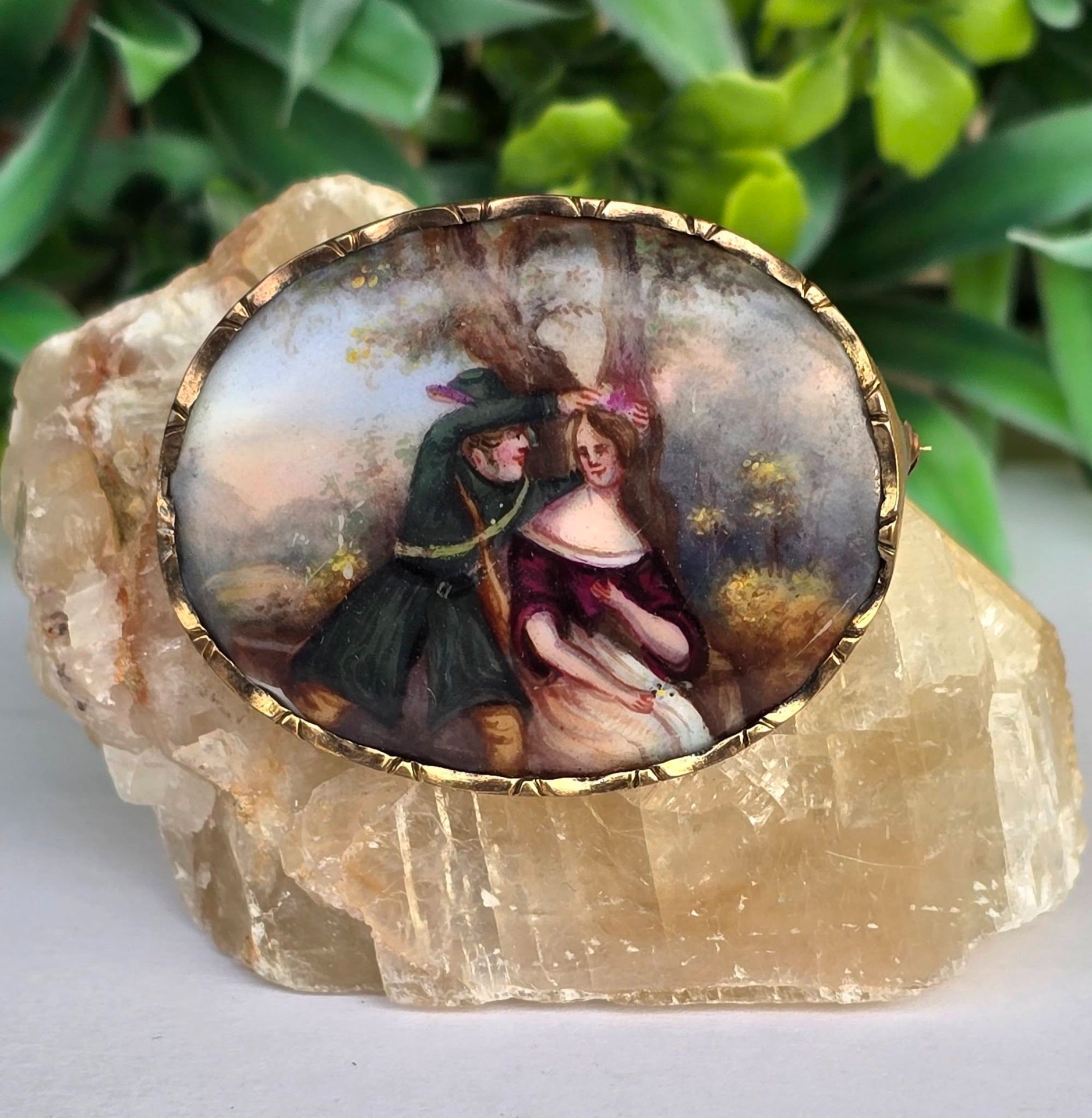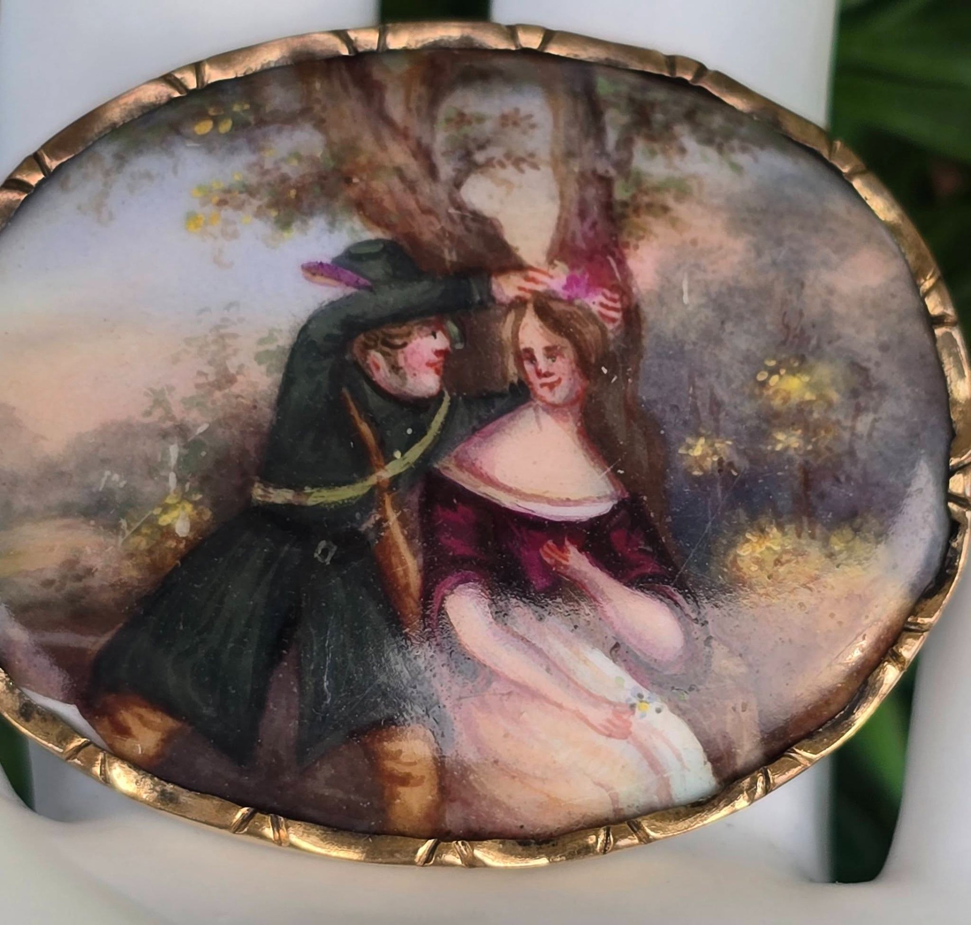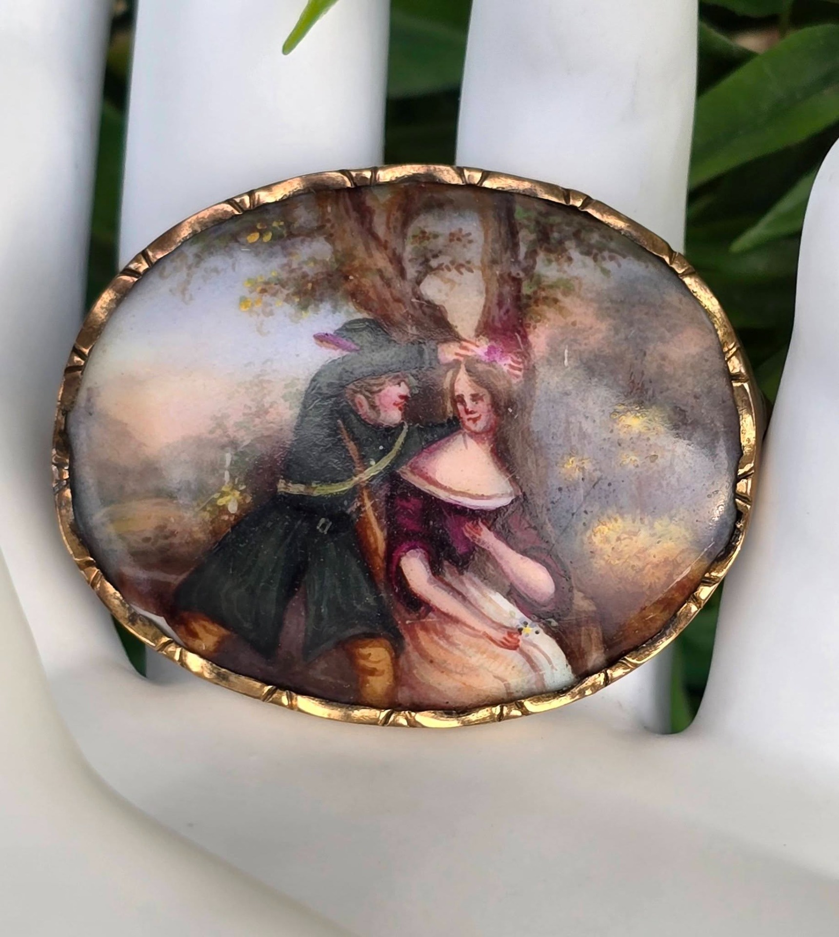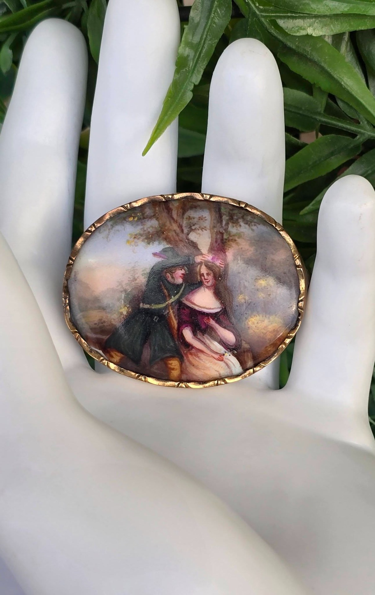 Broșă veche deosebită, de colecție, din argint aurit, cu porțelan pictat manual în motiv romantic.