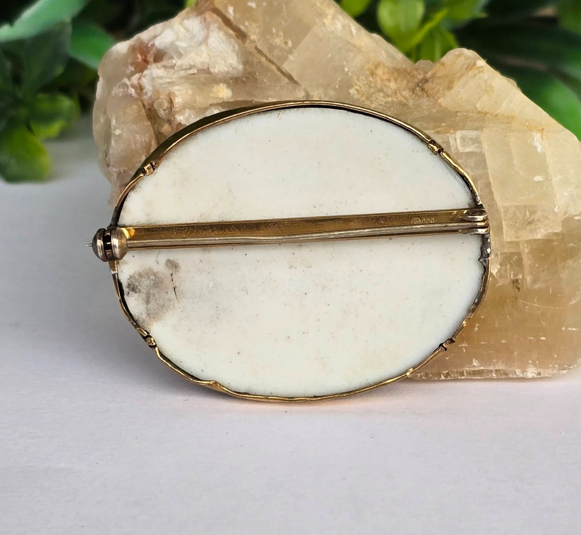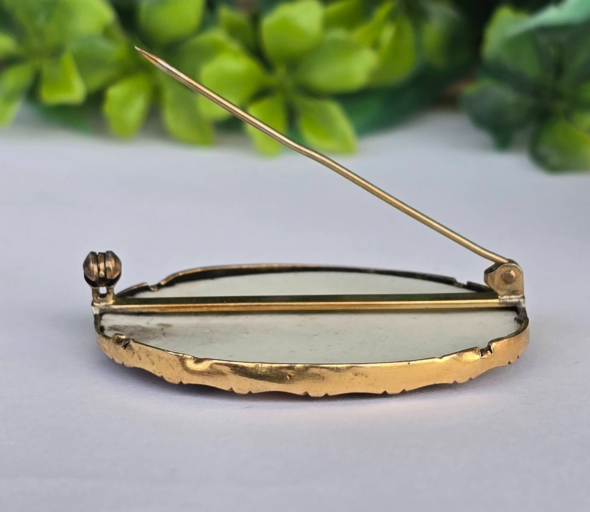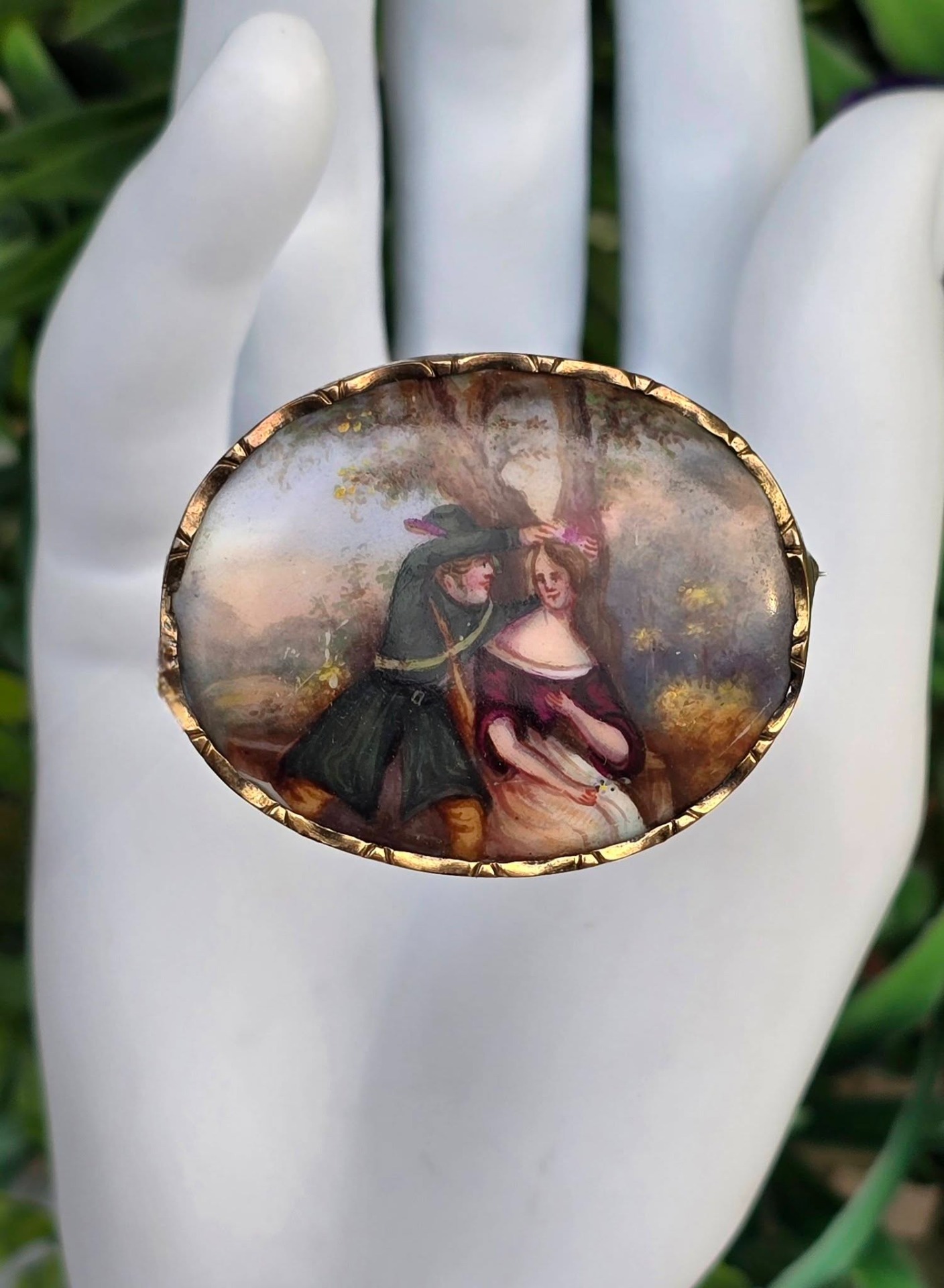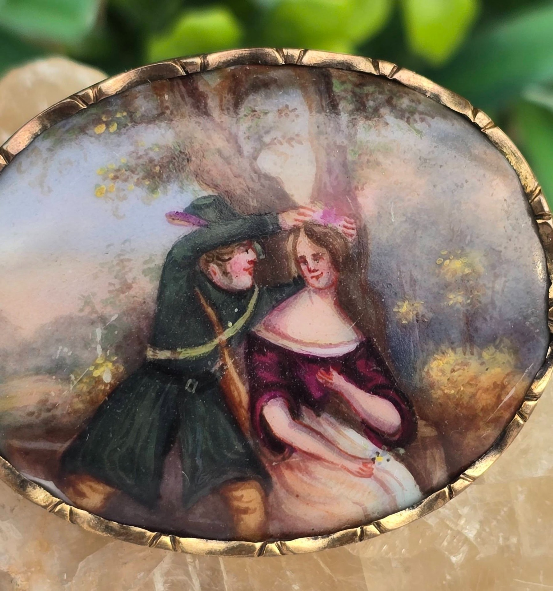Broșă veche deosebită, de colecție, din argint aurit, cu porțelan pictat manual în motiv romantic.