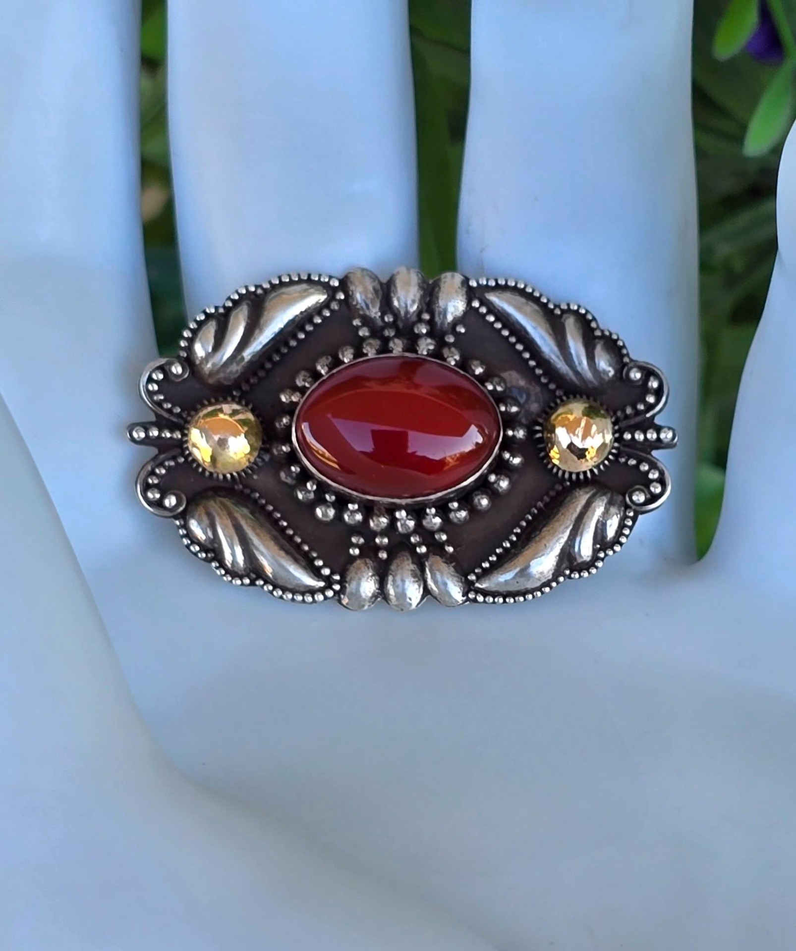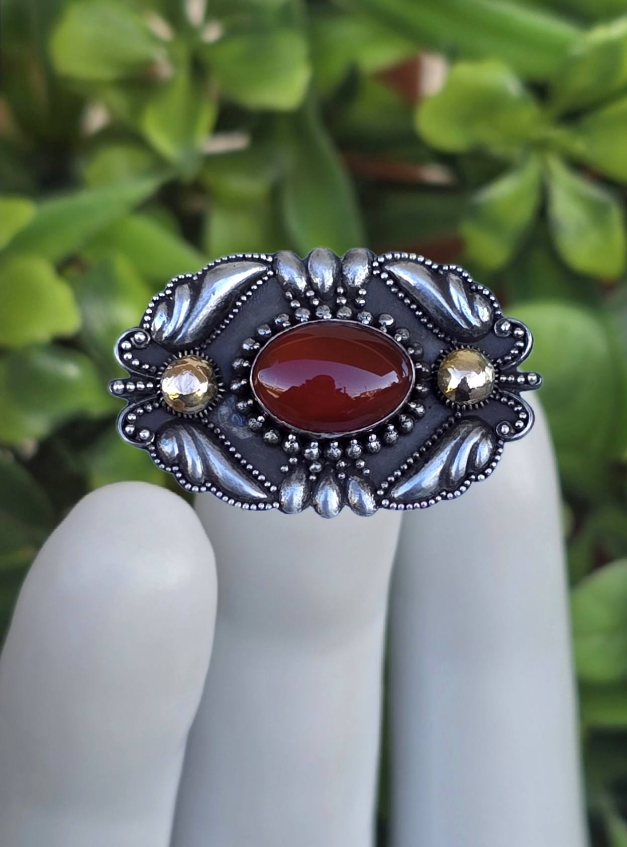 Broșă veche din argint, cu elemente din aur de 18K și carneol natural, manufactură de excepție.