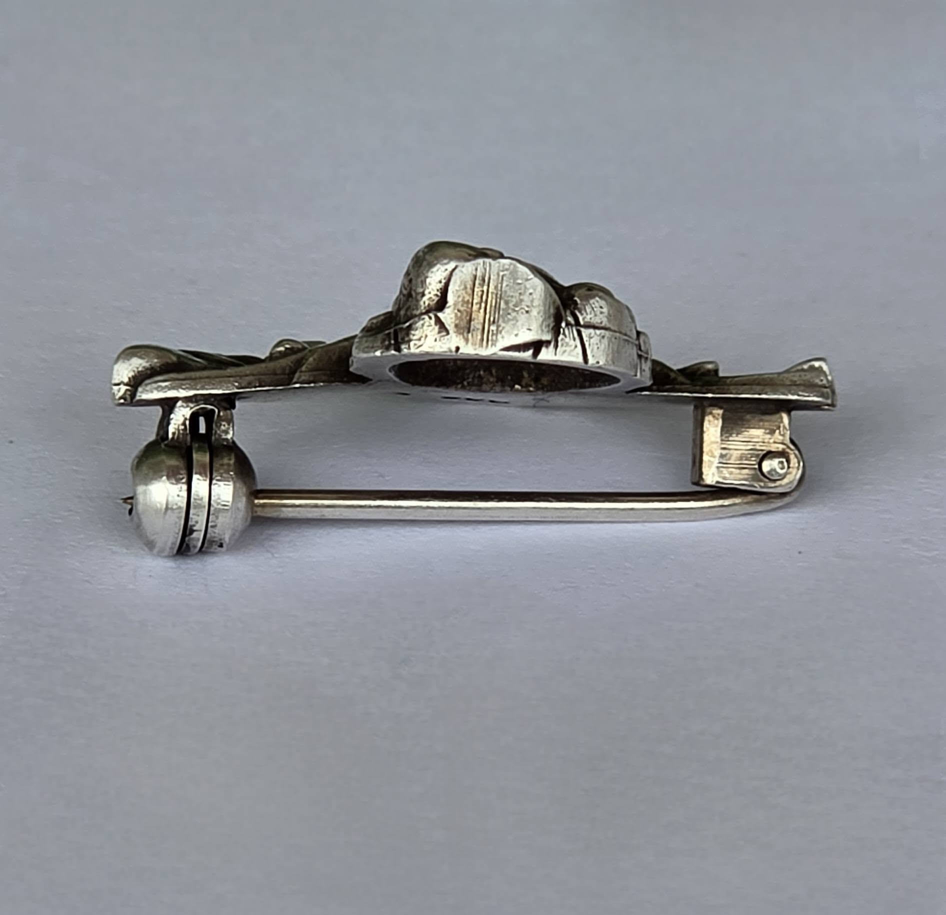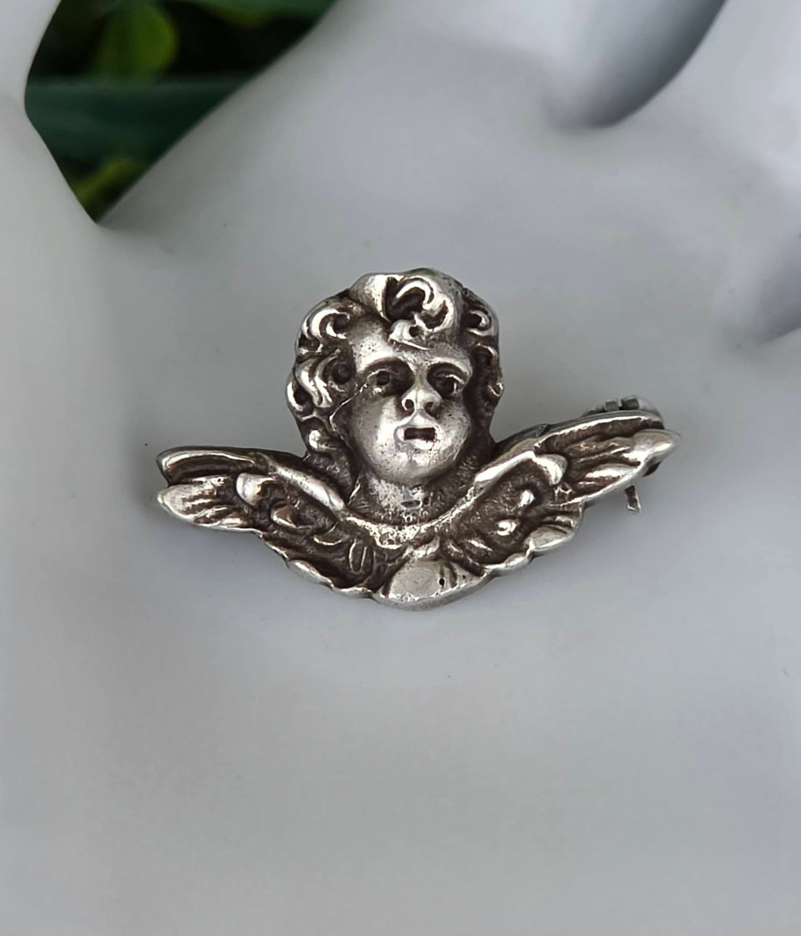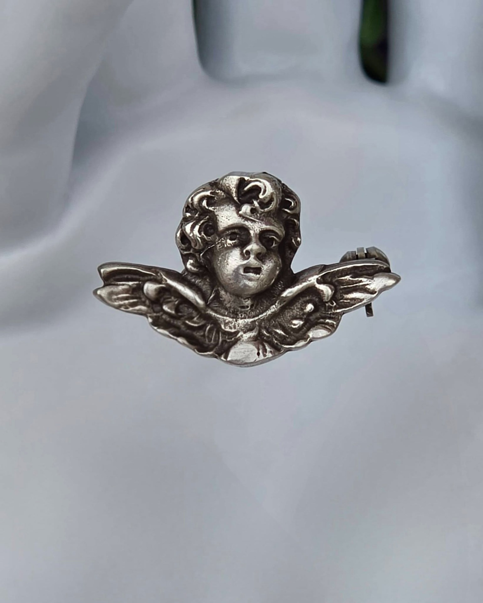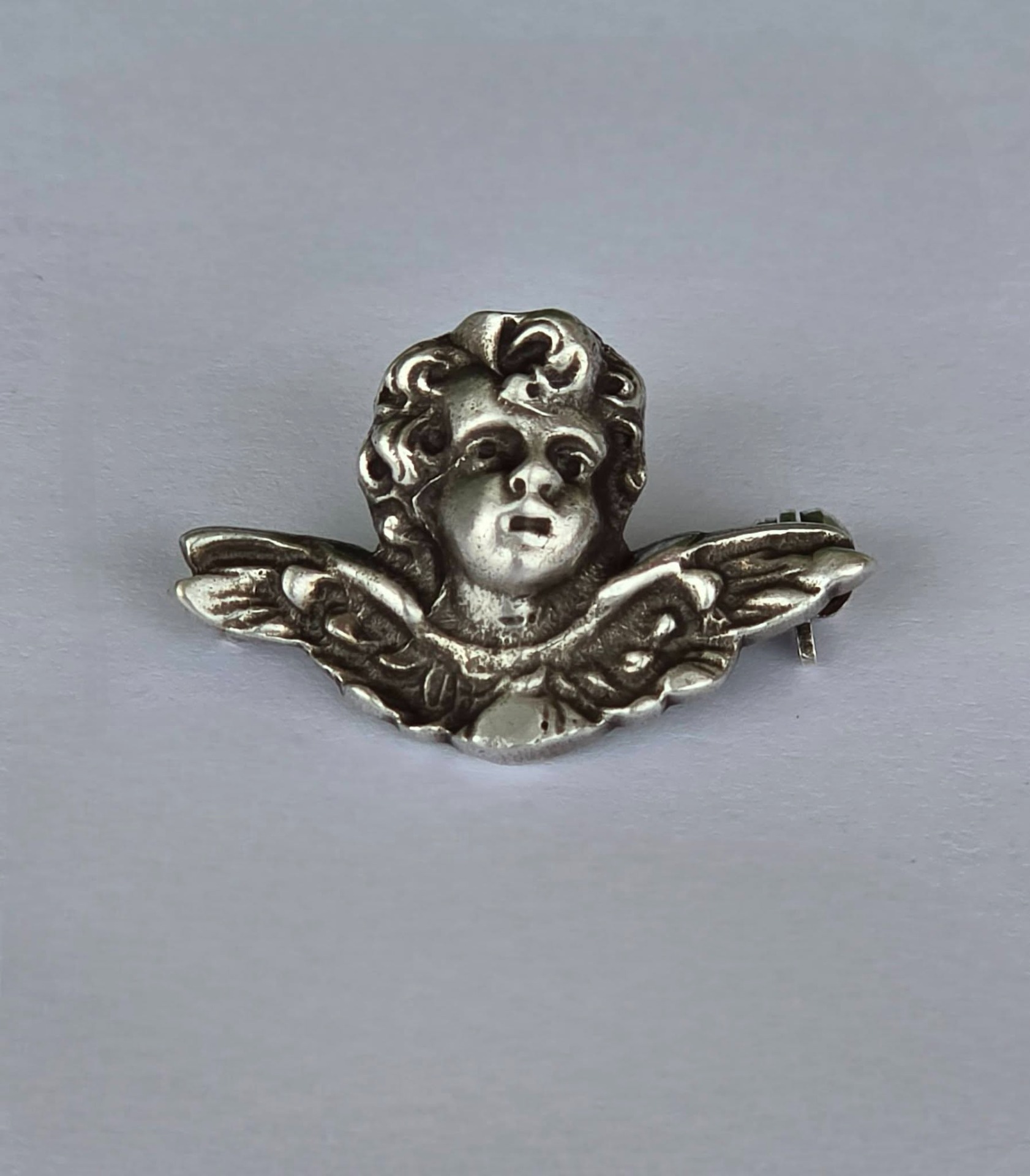 Broșă veche din argint, cu îngeraș "putto", manufactură cu design de inspirație barocă.