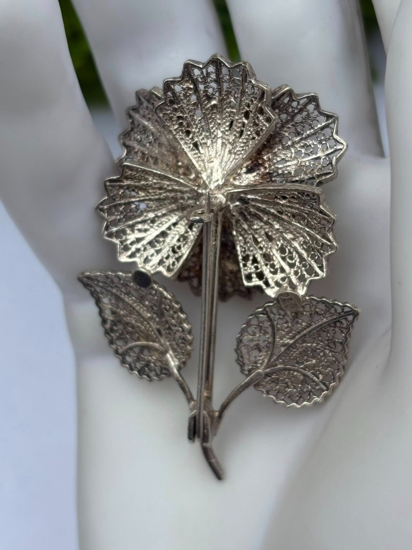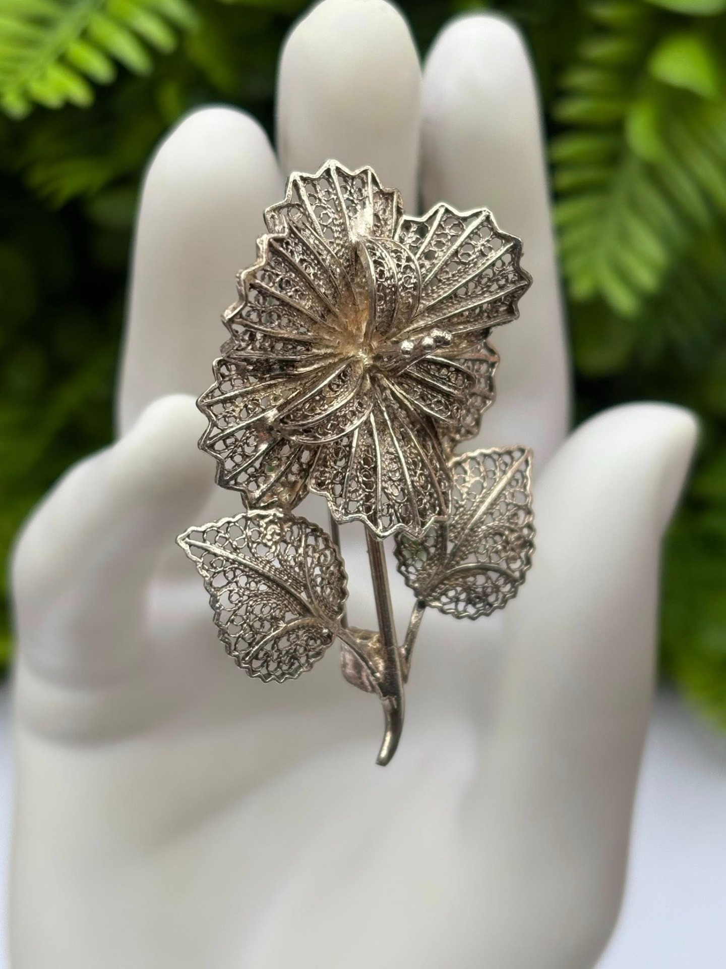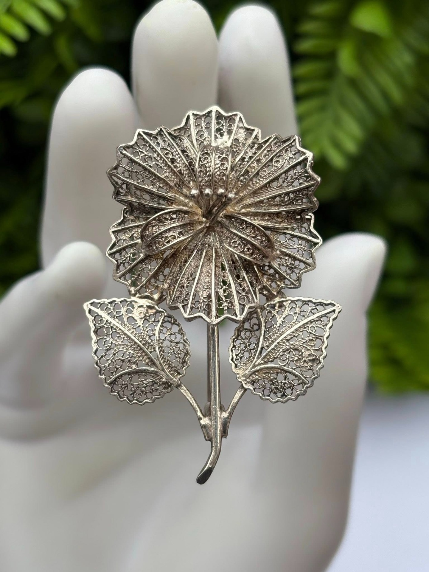 Broșă veche din metal argintat, manufactură deosebită în filigran.