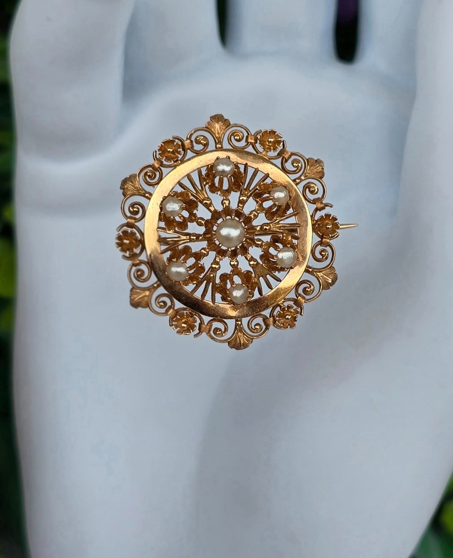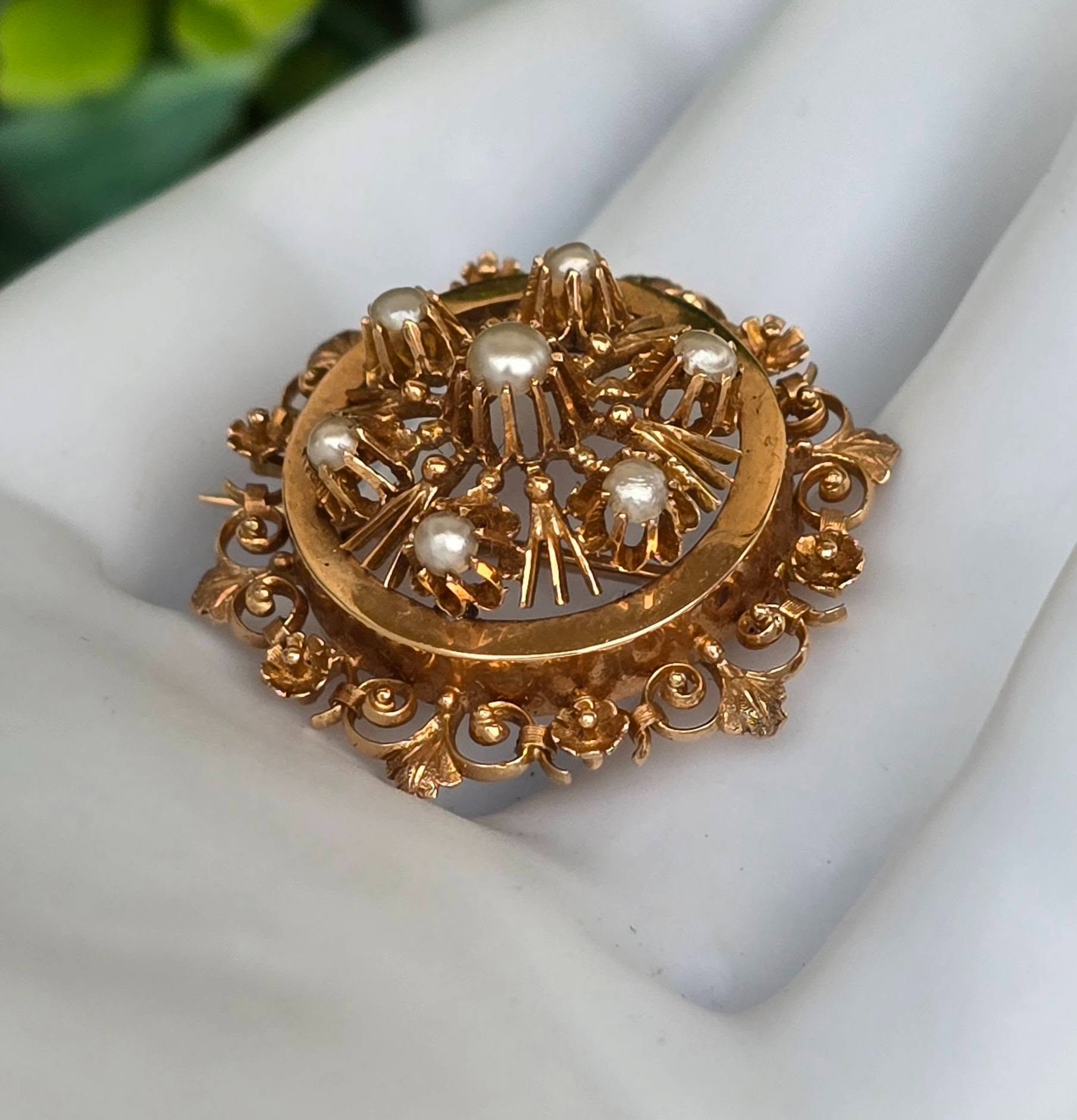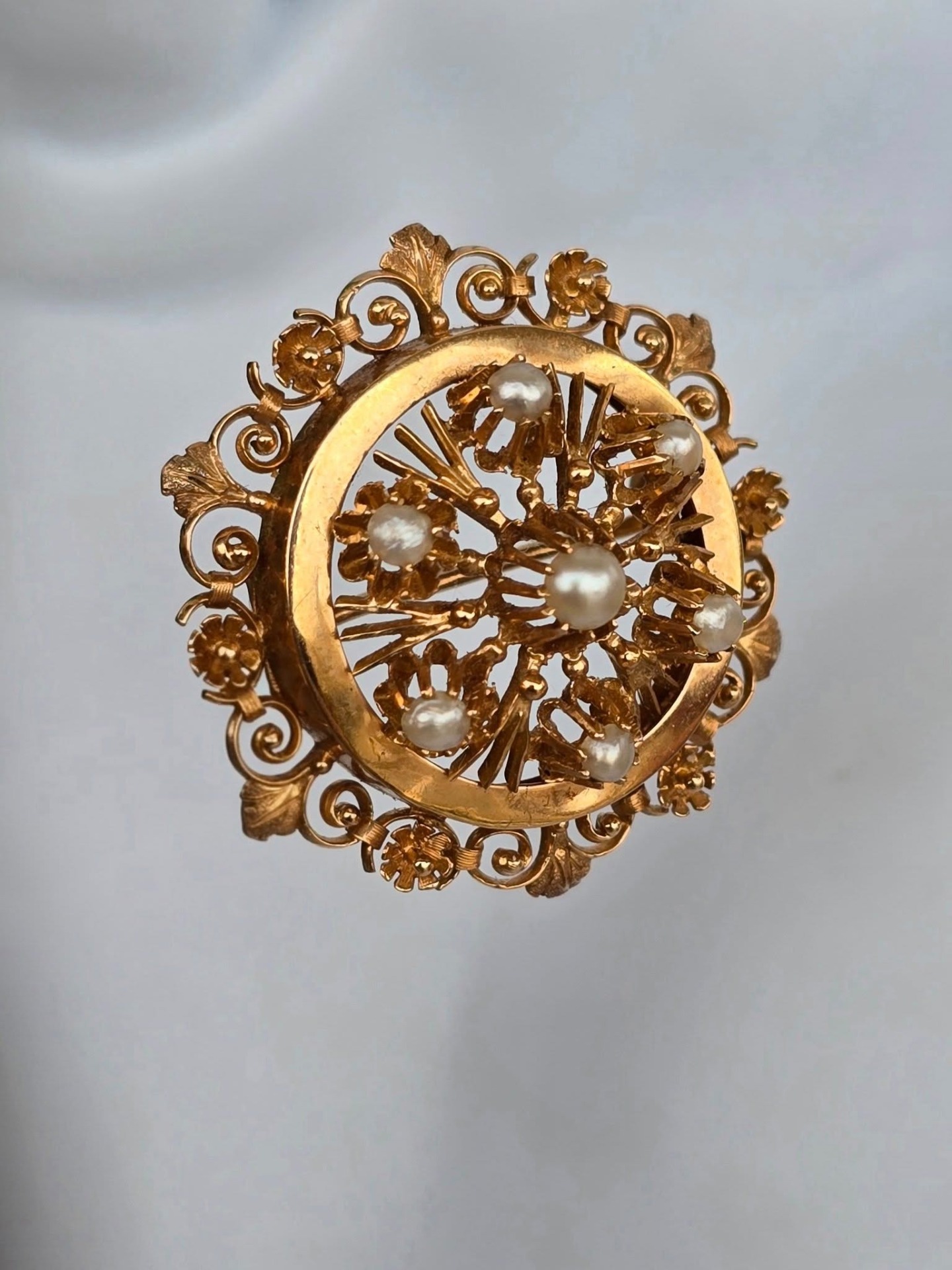 Broșă veche "Etruscan Revival", rară, de colecție, din aur de 18K, cu perle naturale, manufactură în motiv floral, un exemplu de măiestrie în tehnica