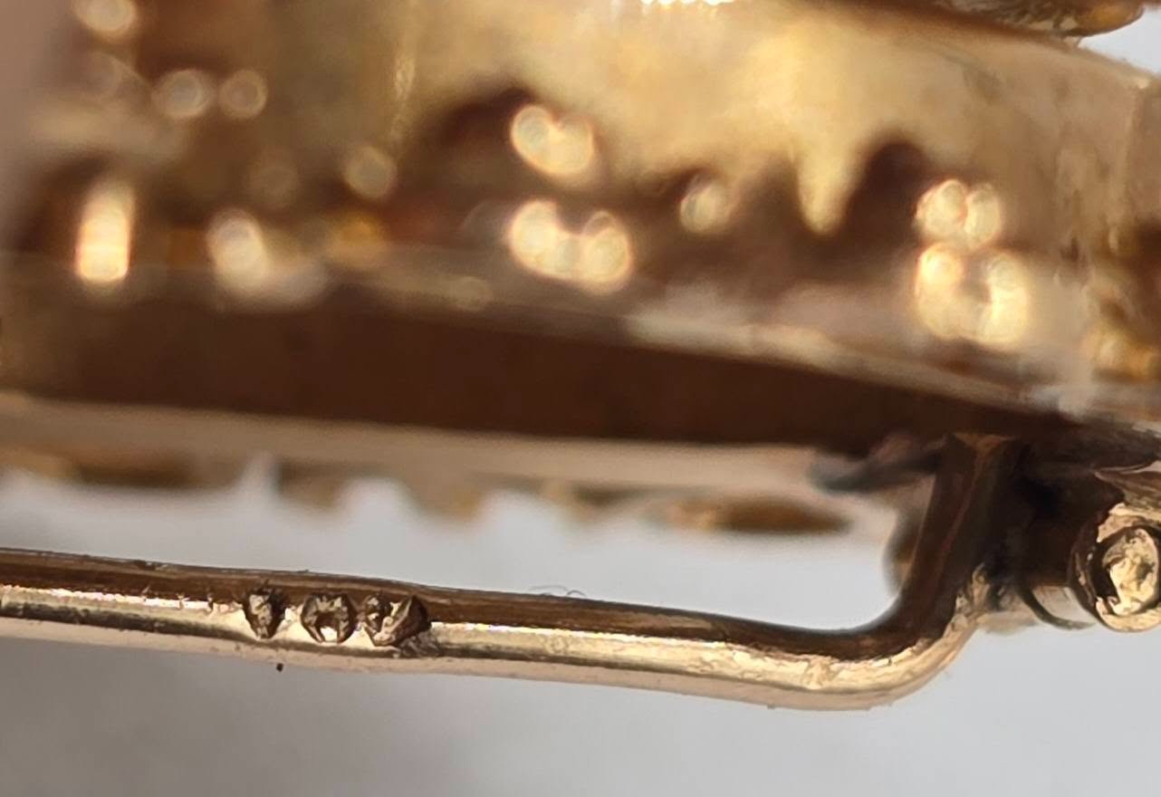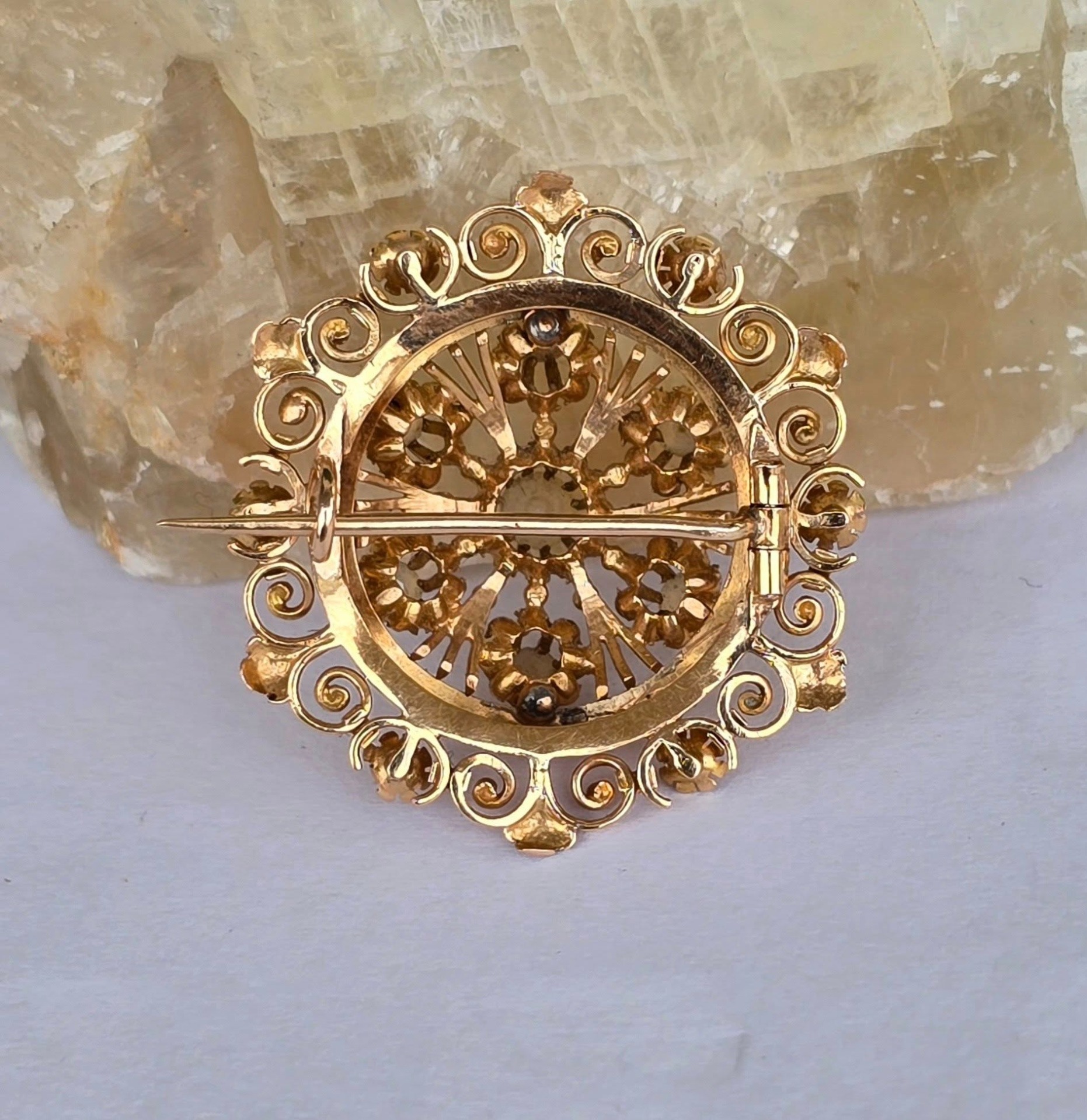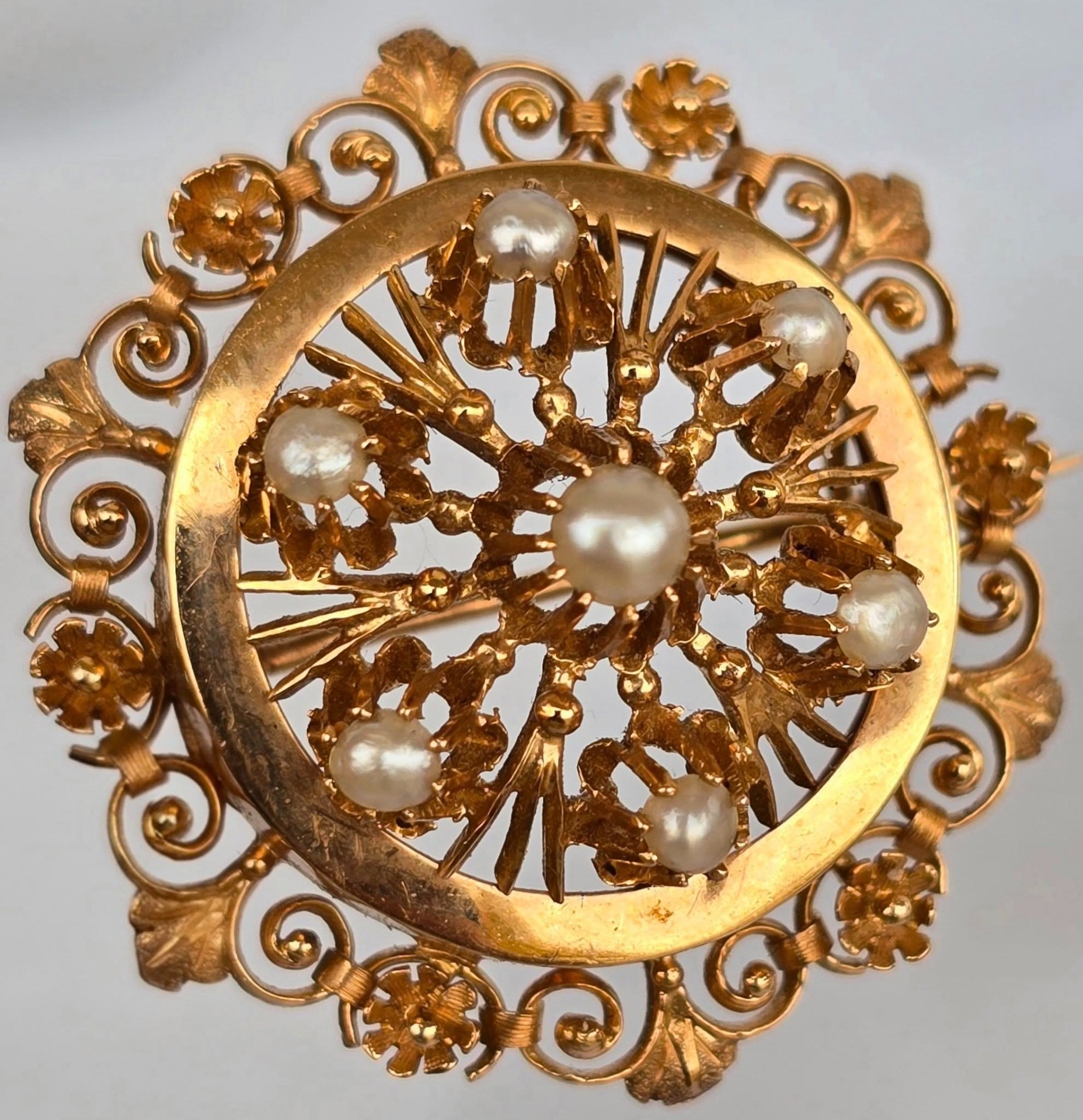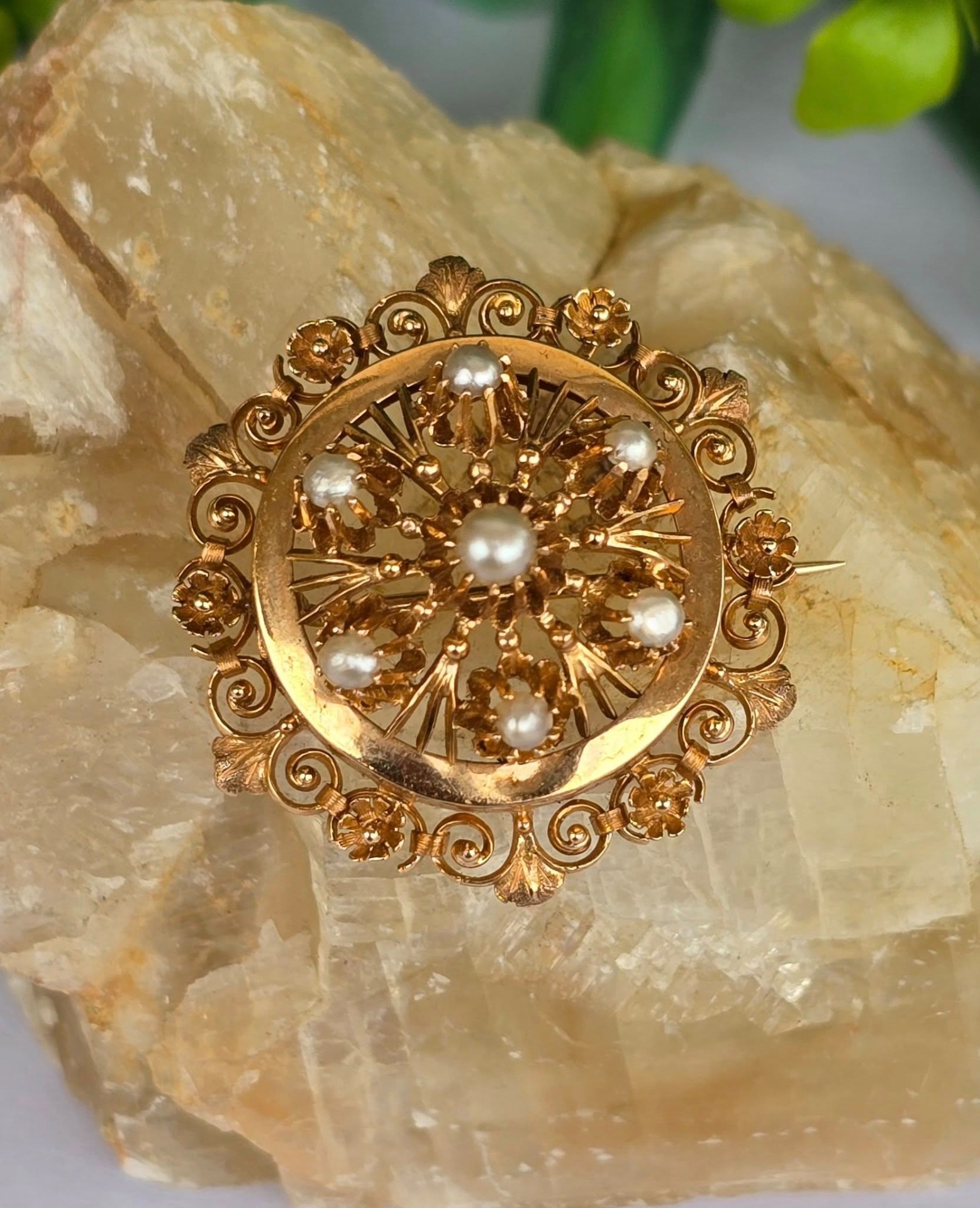 Broșă veche "Etruscan Revival", rară, de colecție, din aur de 18K, cu perle naturale, manufactură în motiv floral, un exemplu de măiestrie în tehnica