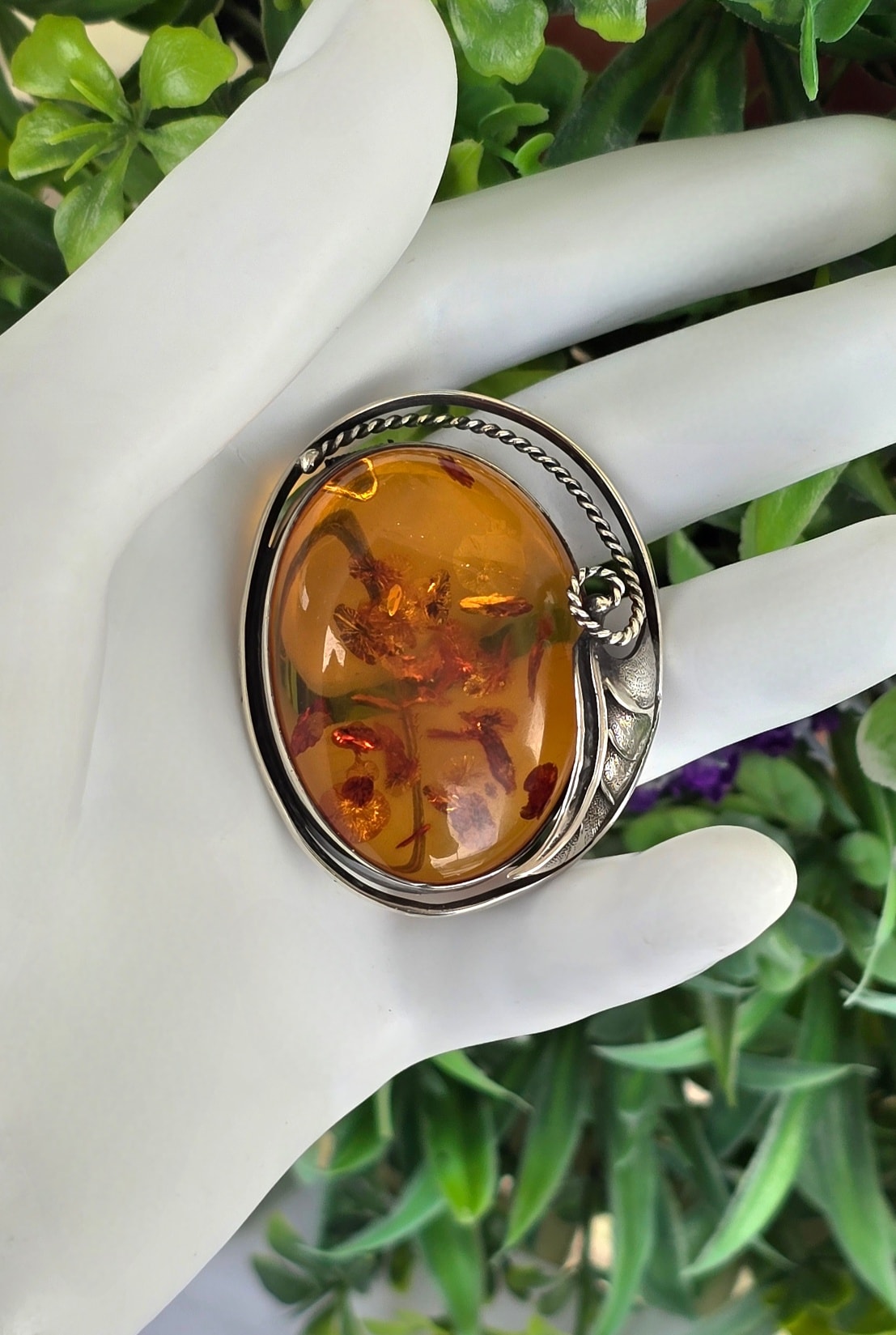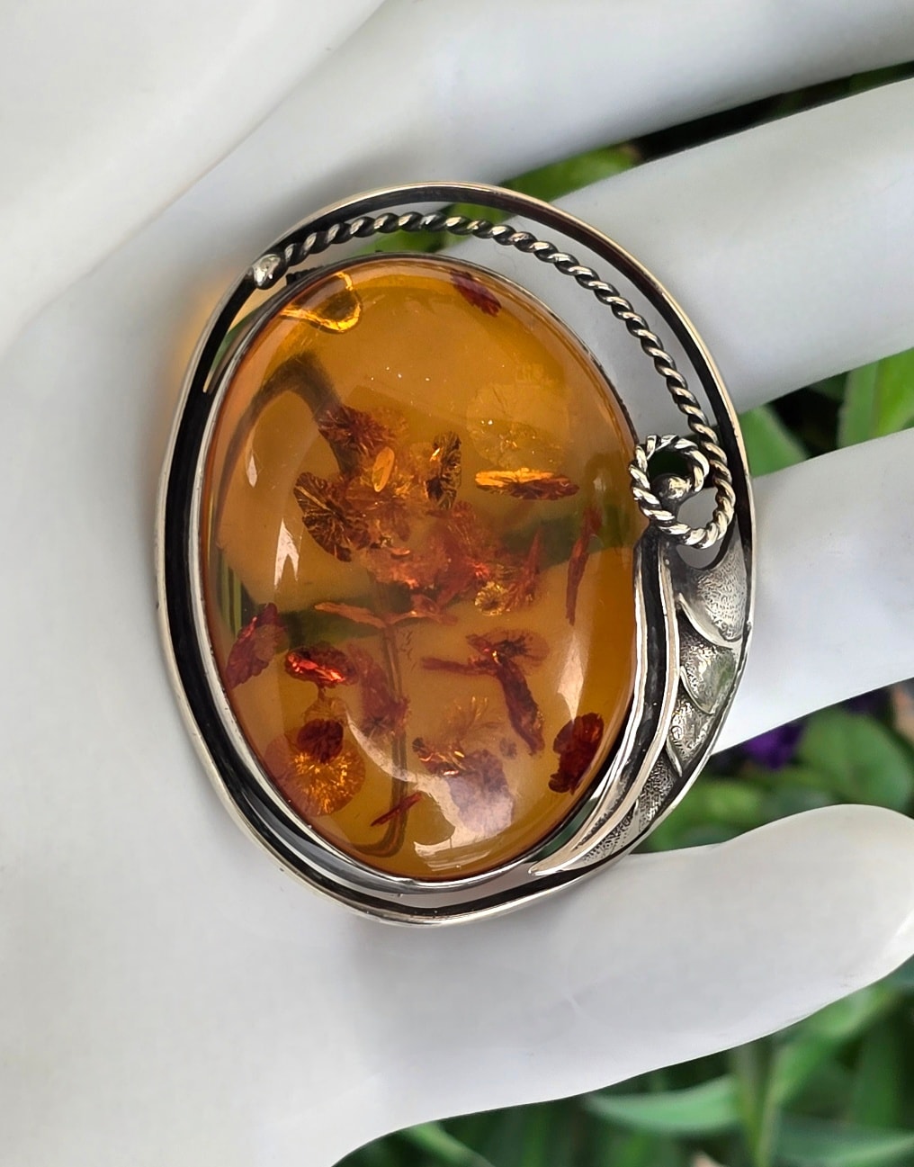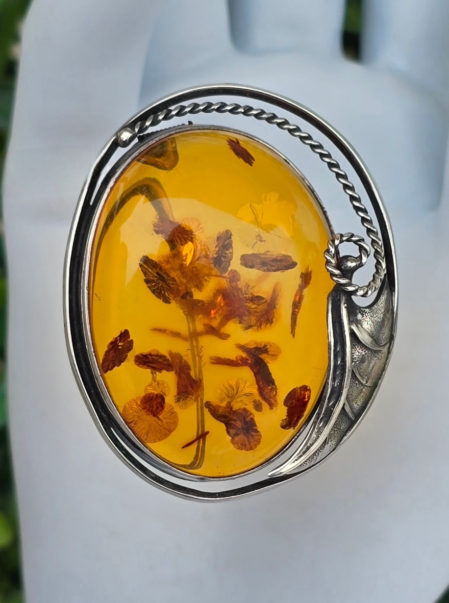 Broșă veche grandioasă, din argint, cu chihlimbar natural.